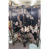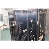 Four panel, free standing black laquered room divider with Oriental themes including dragons, birds, foliage and figures, each panel is 72" X 16"