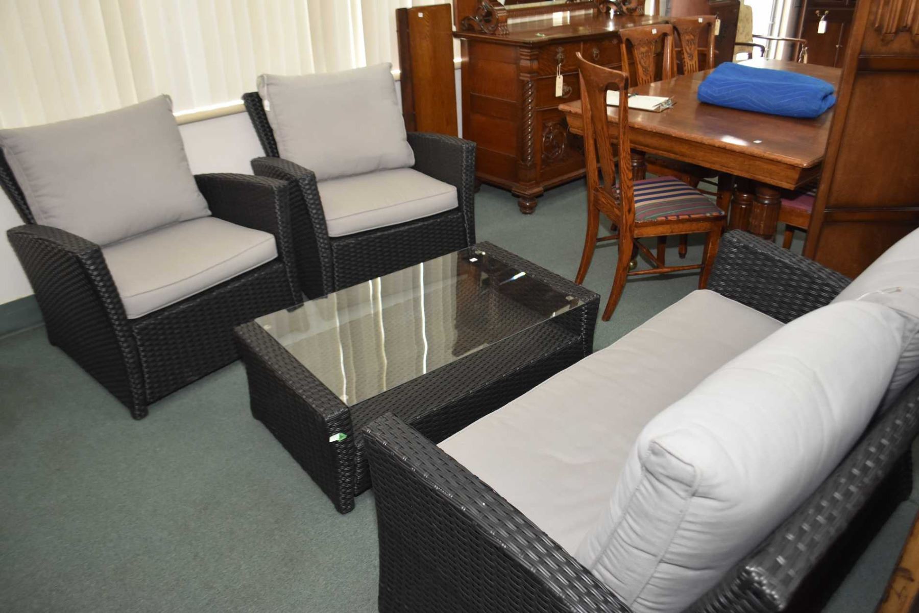 Four piece, near new simulated wicker patio suite including loveseat, two armchairs and coffee table