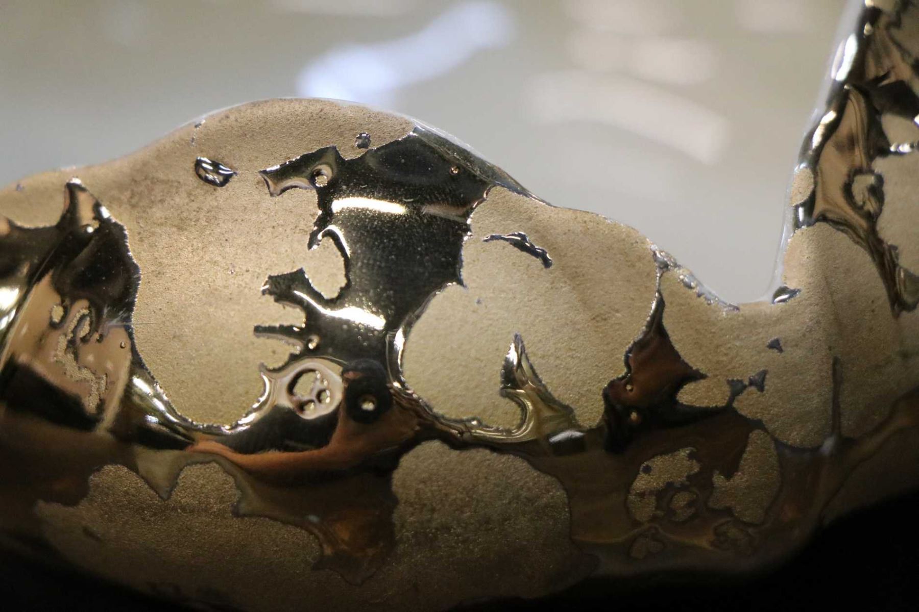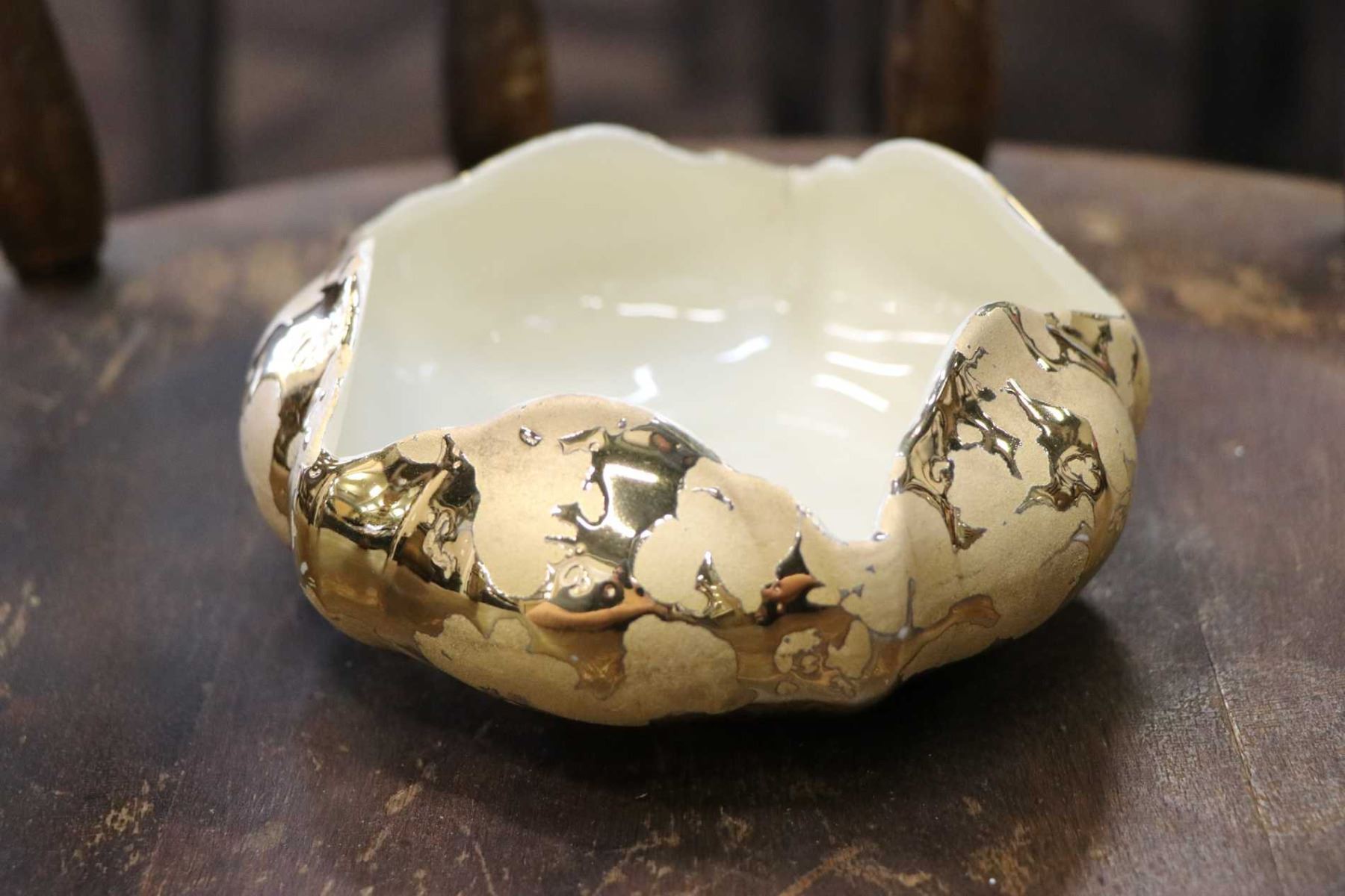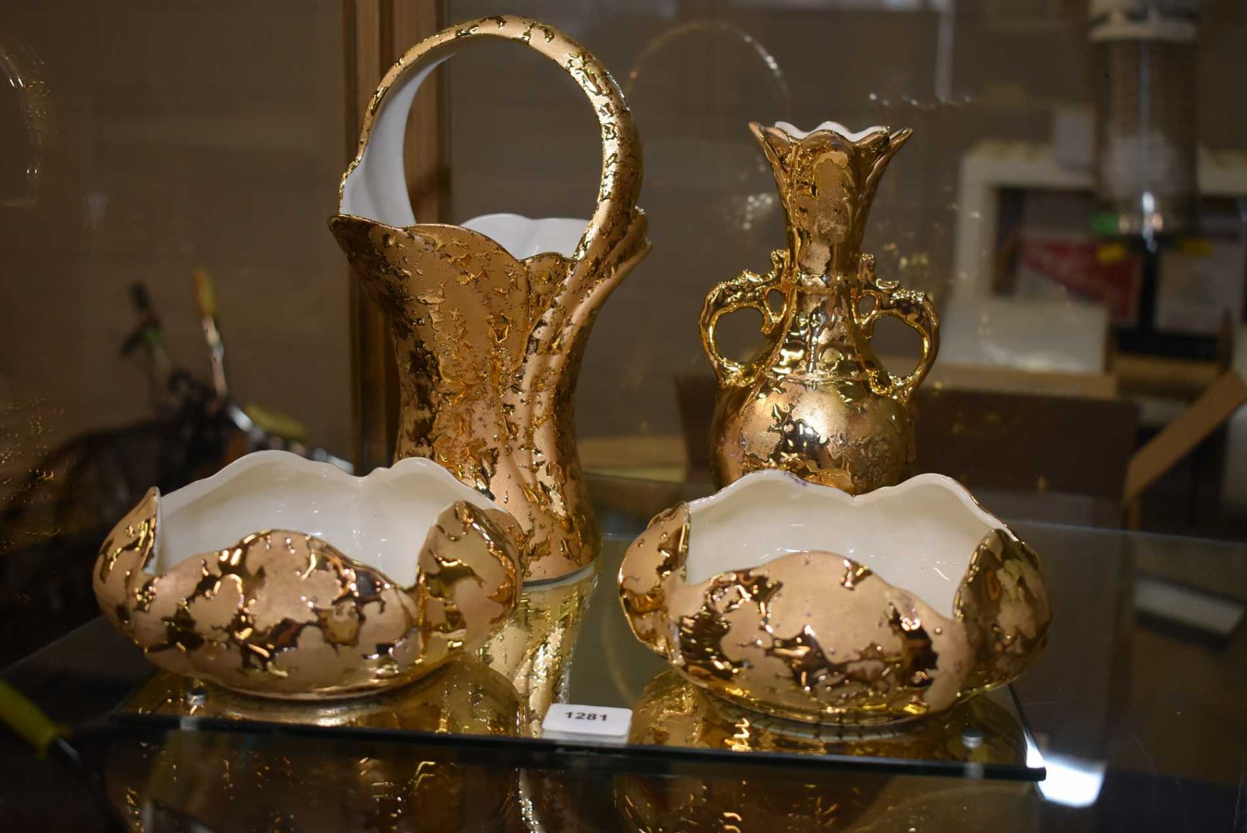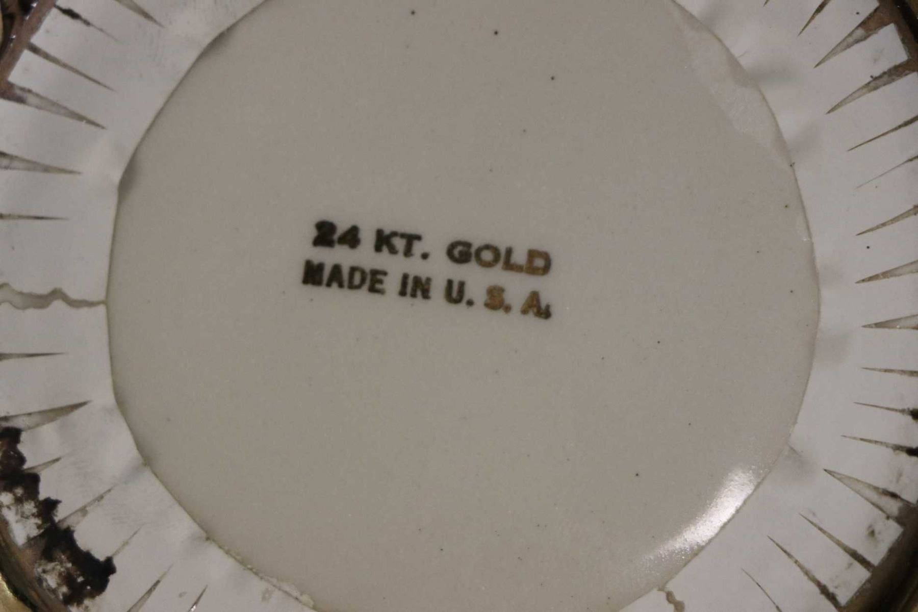 Four pieces of American made porcelain with 24 karat gold plating including two matching bowls, double handled vase and a basket