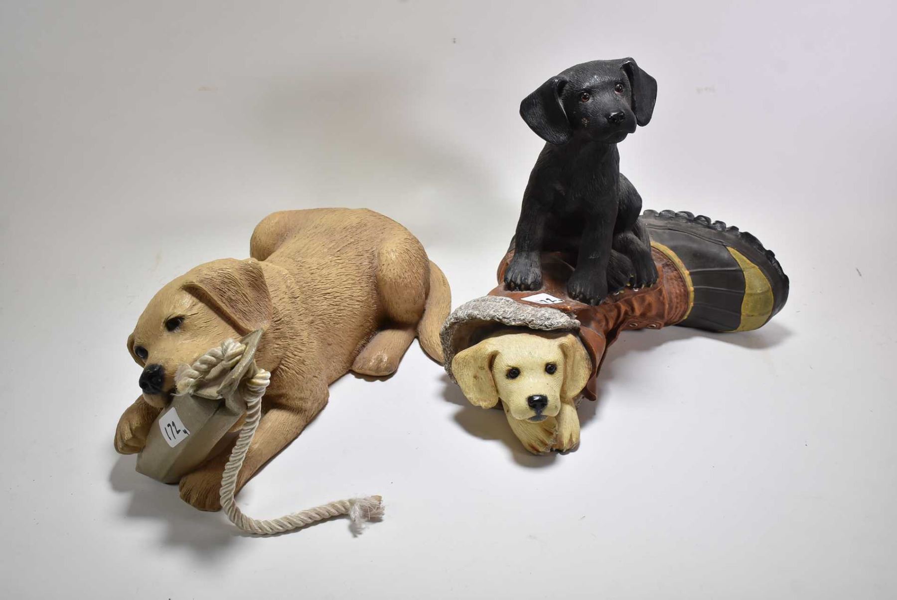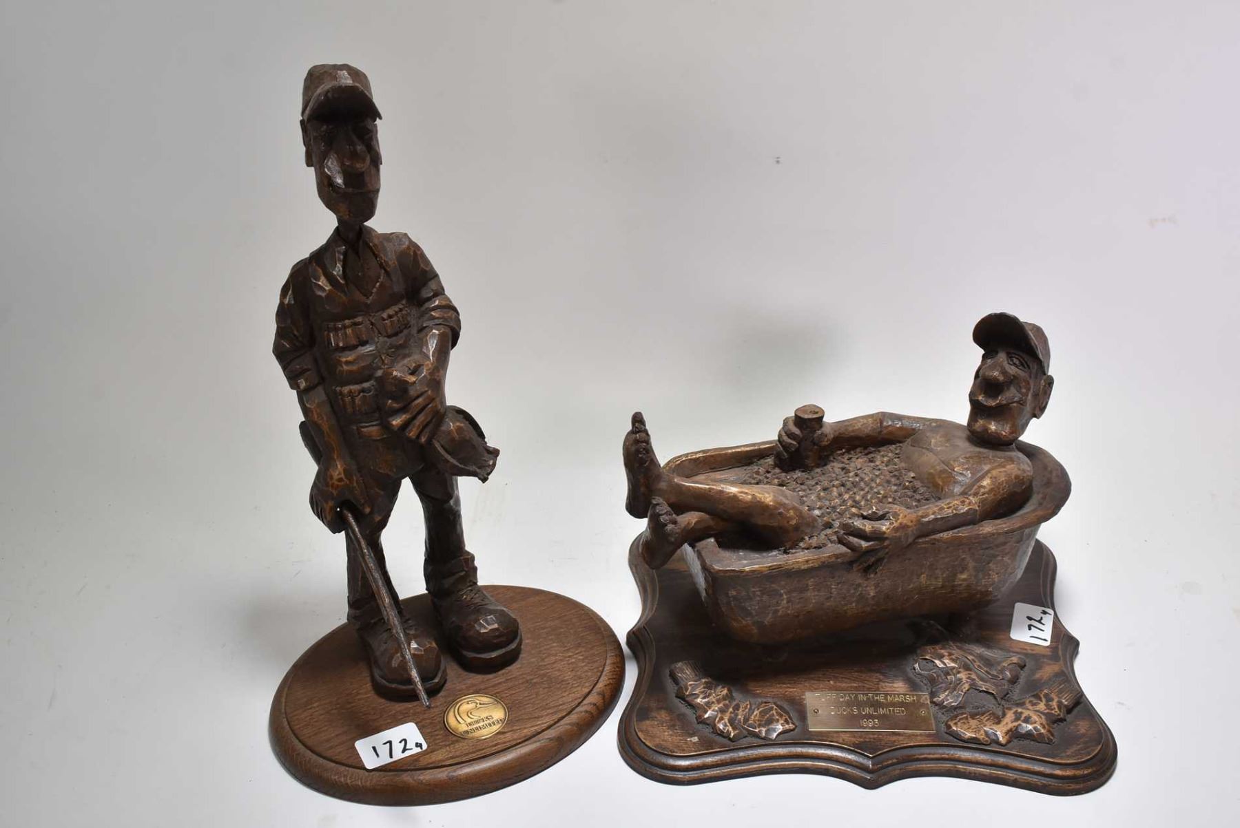 Four pieces of Ducks Unlimited decor displays including two dogs with a boot by Bradford Williams, an old man with a duck figure signed on base by artist, and a "Tough Day in the Marsh" figure plus a dog with a chew toy figure by Bradord Williams