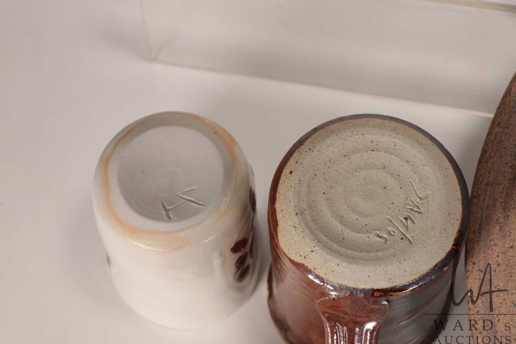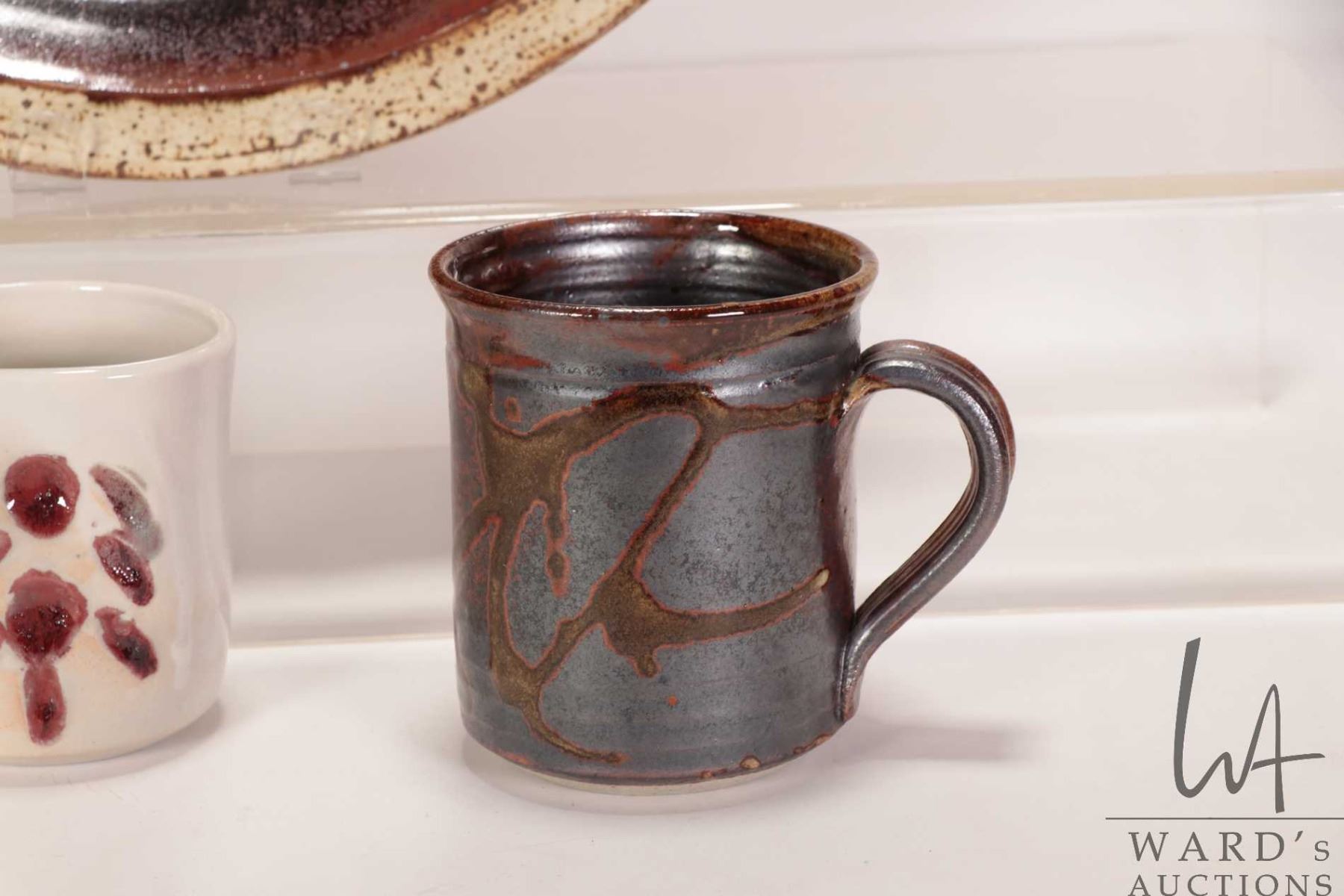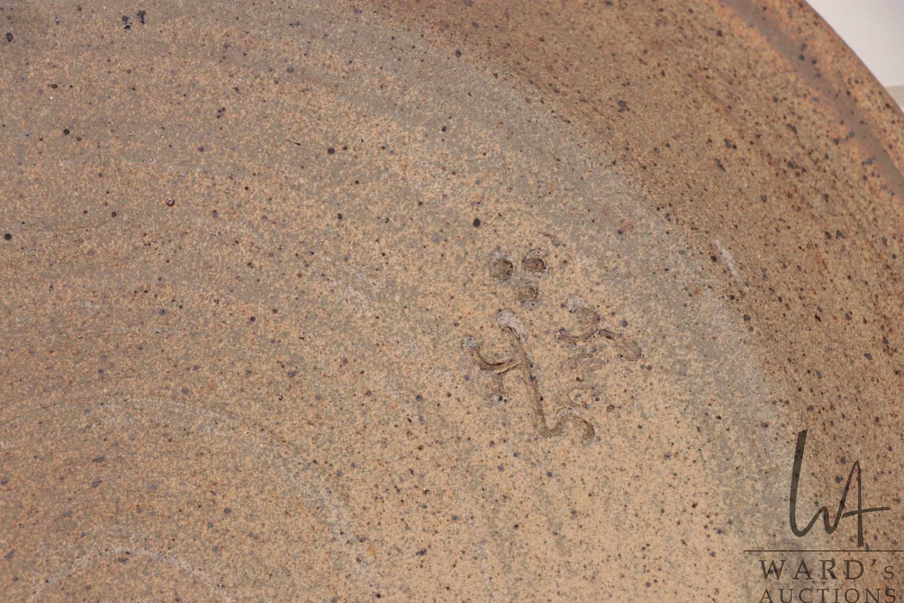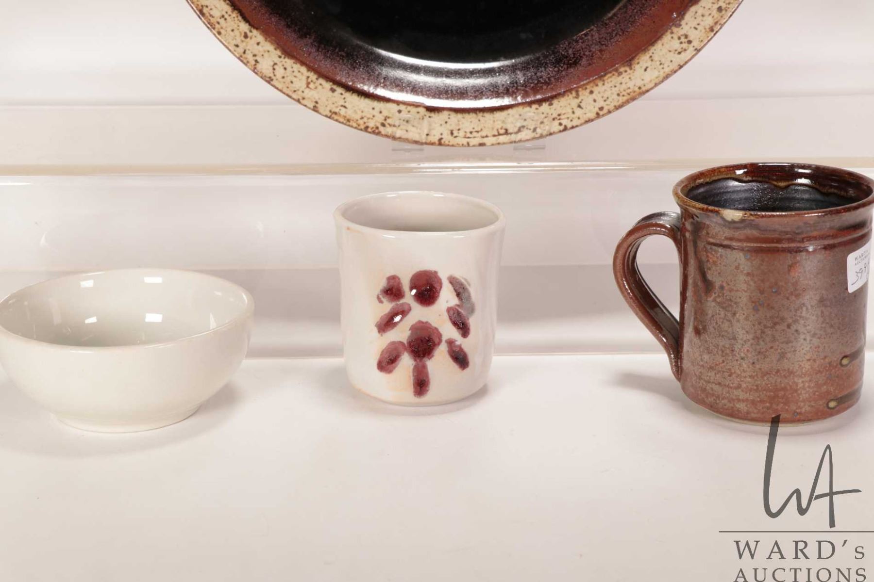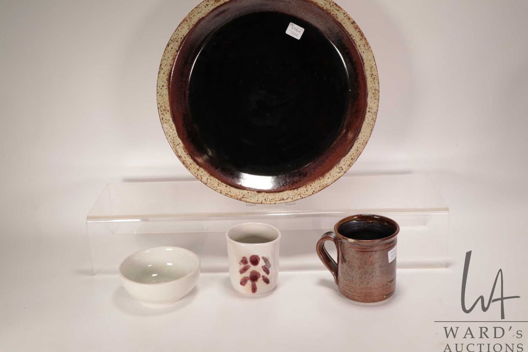 Four pieces of artisan pottery including 14" charger, artist signed mug etc.