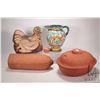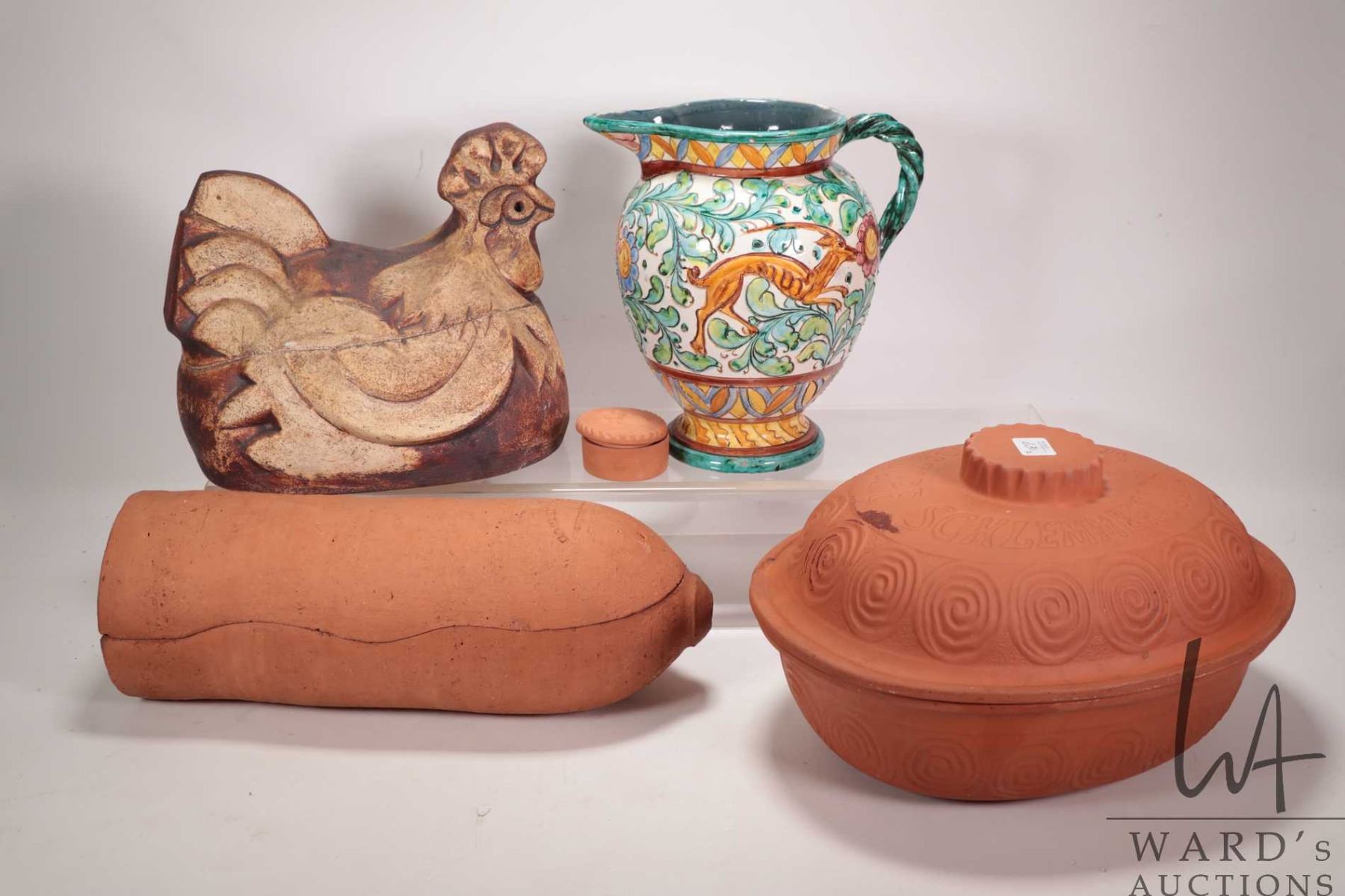 Four pieces of clay cookware including 12" "Schlemmertopf" terracotta roaster, a 14" terracotta fish cooker, chicken motif casserole dish and a glazed pottery pitcher marked Italy