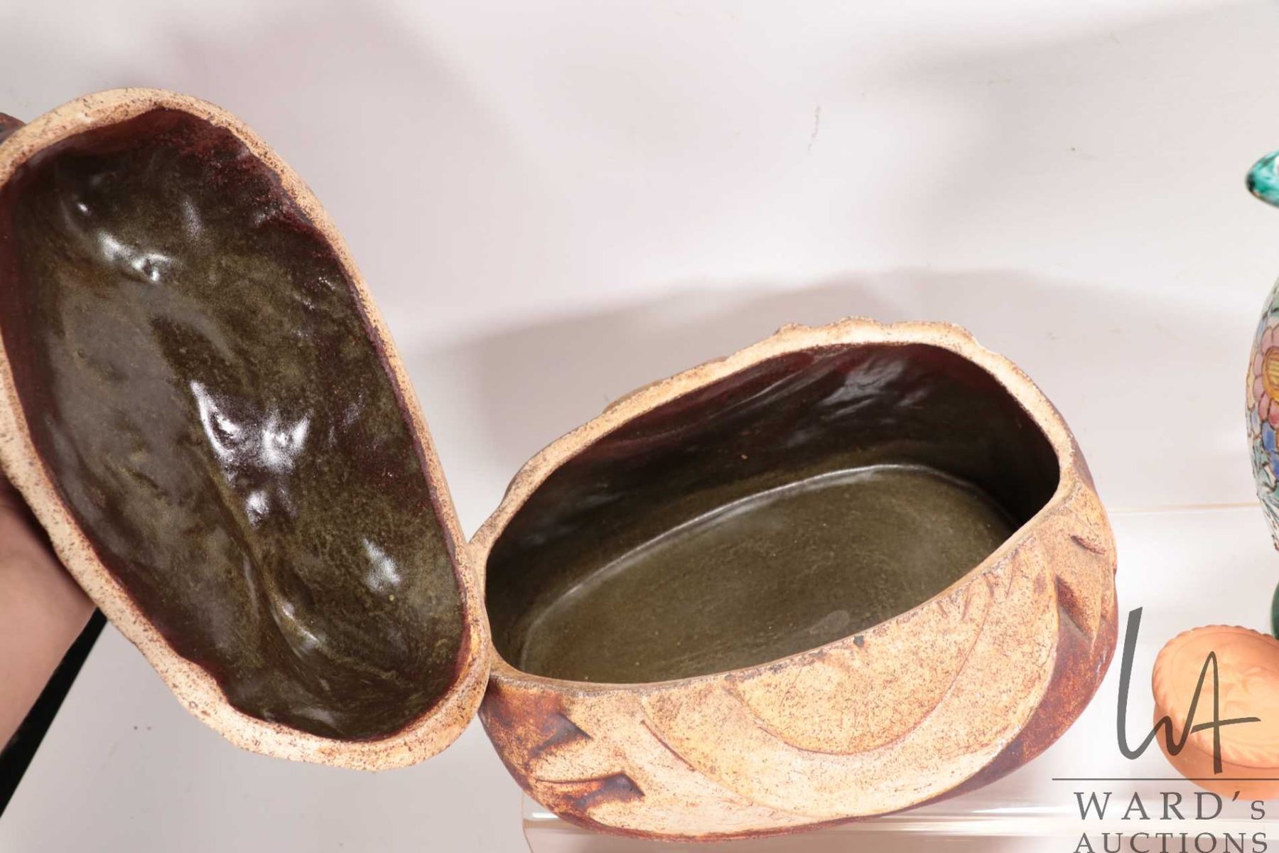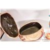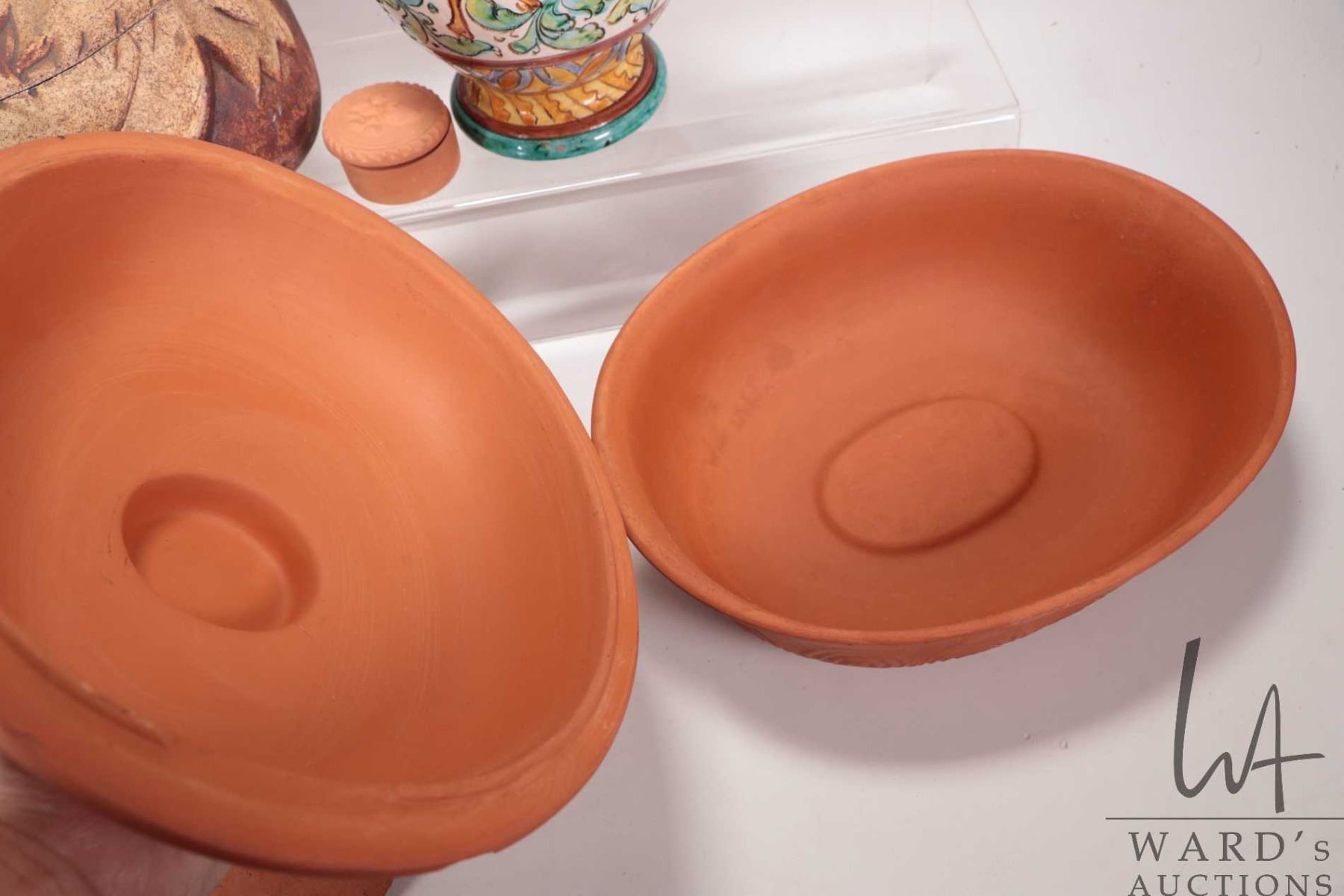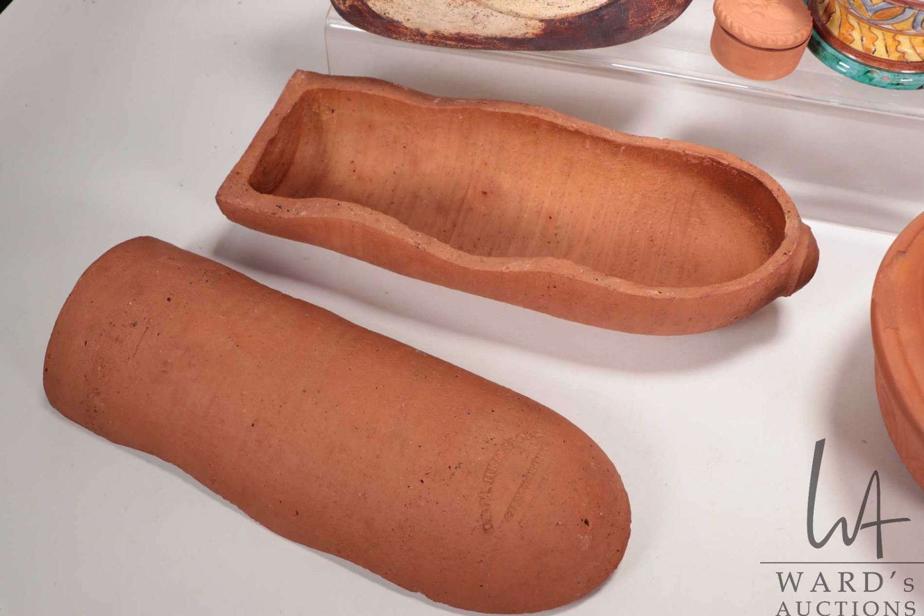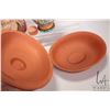 Four pieces of clay cookware including 12" "Schlemmertopf" terracotta roaster, a 14" terracotta fish