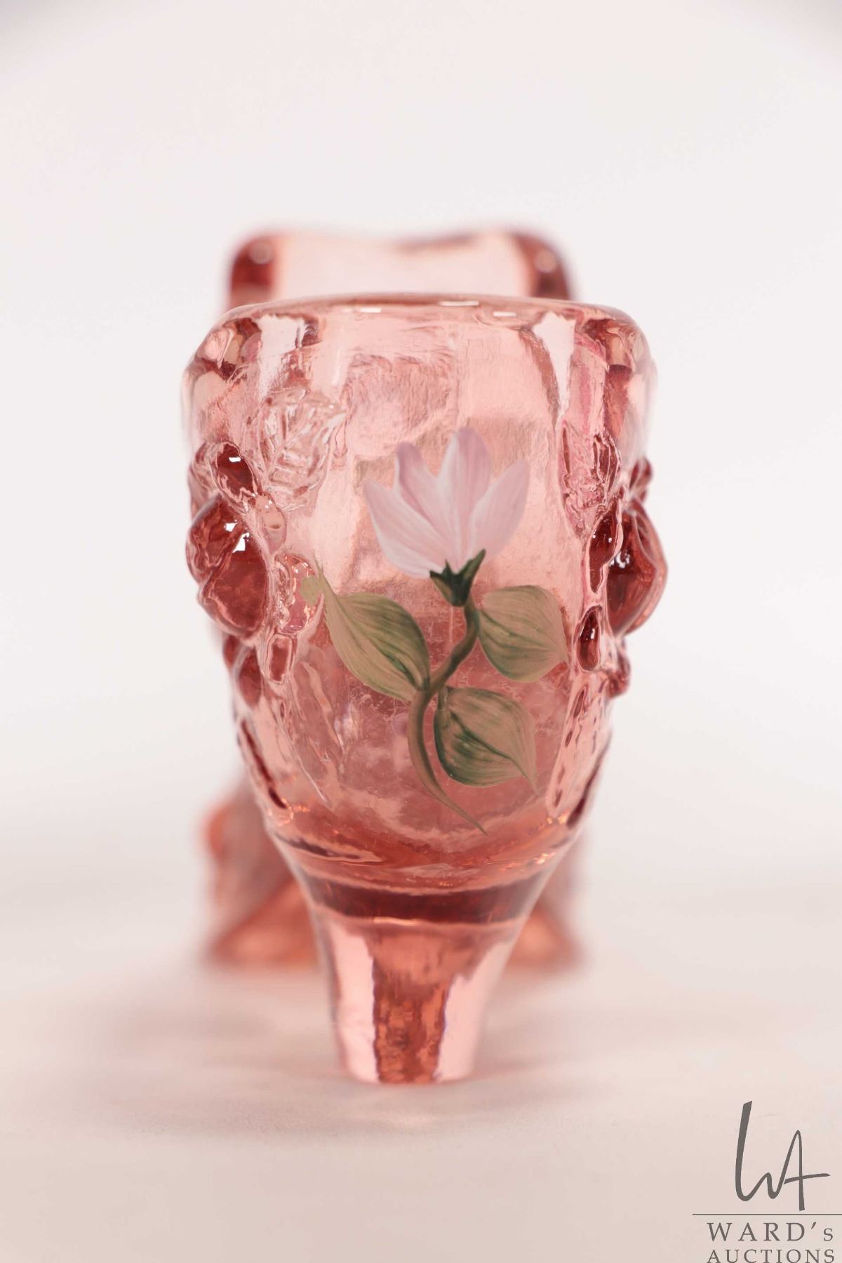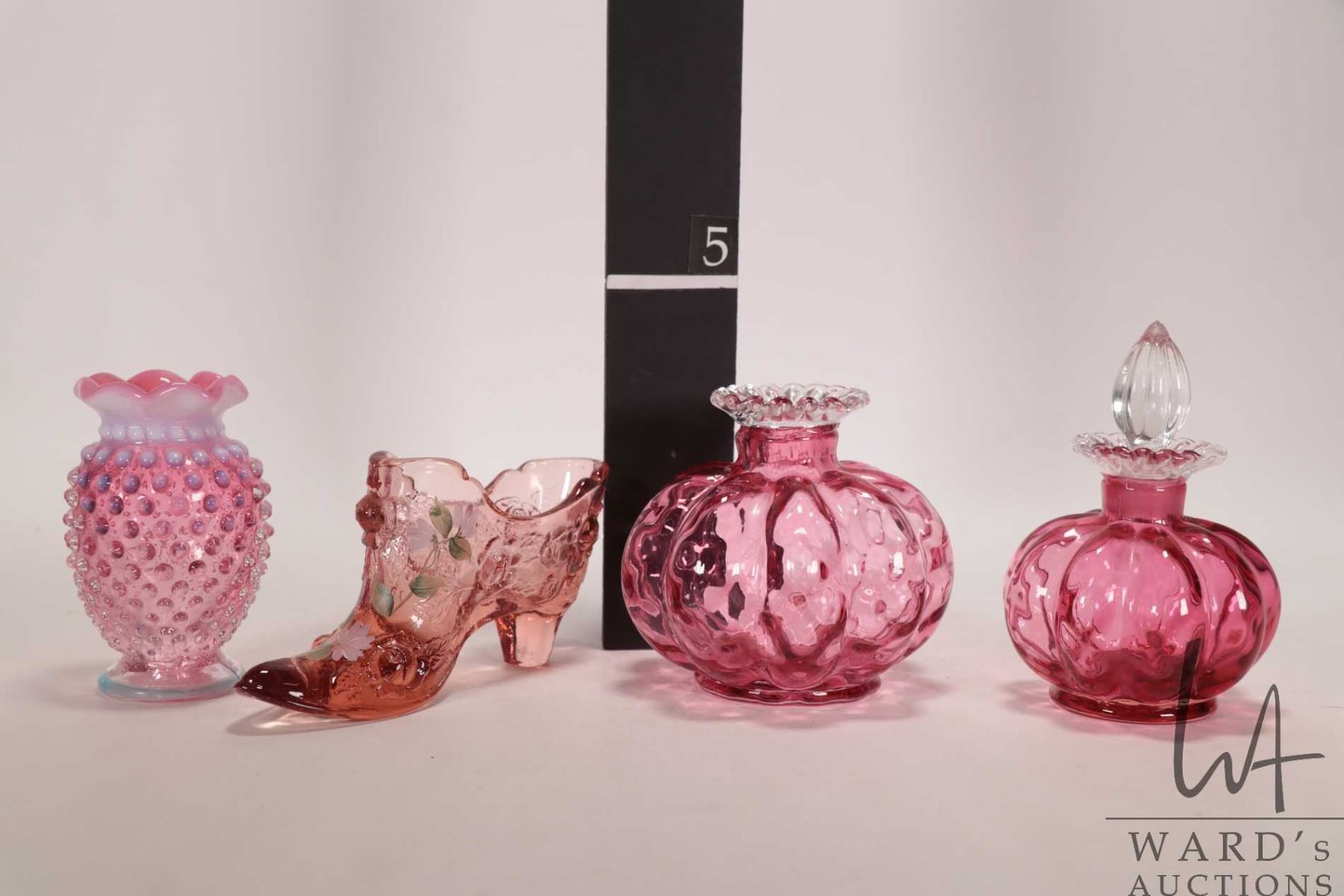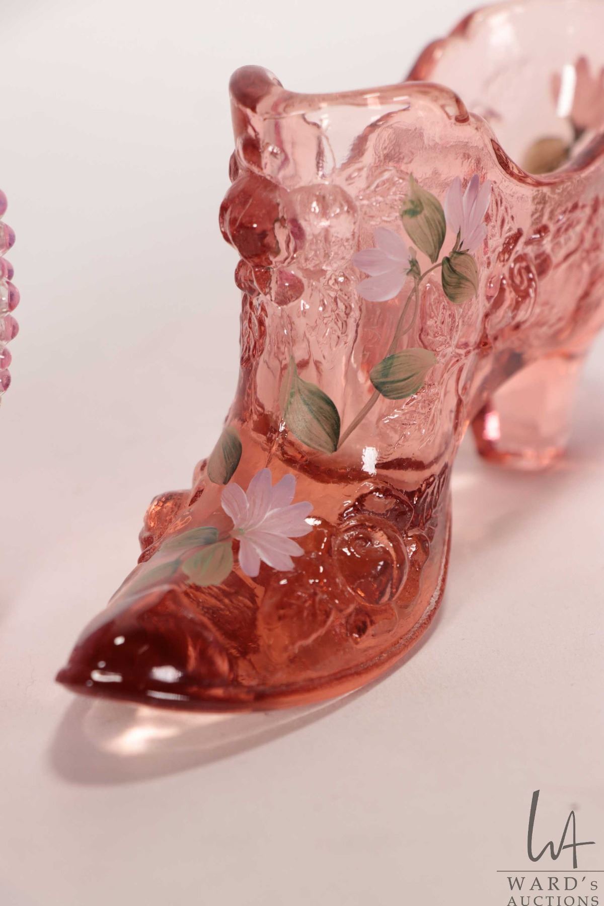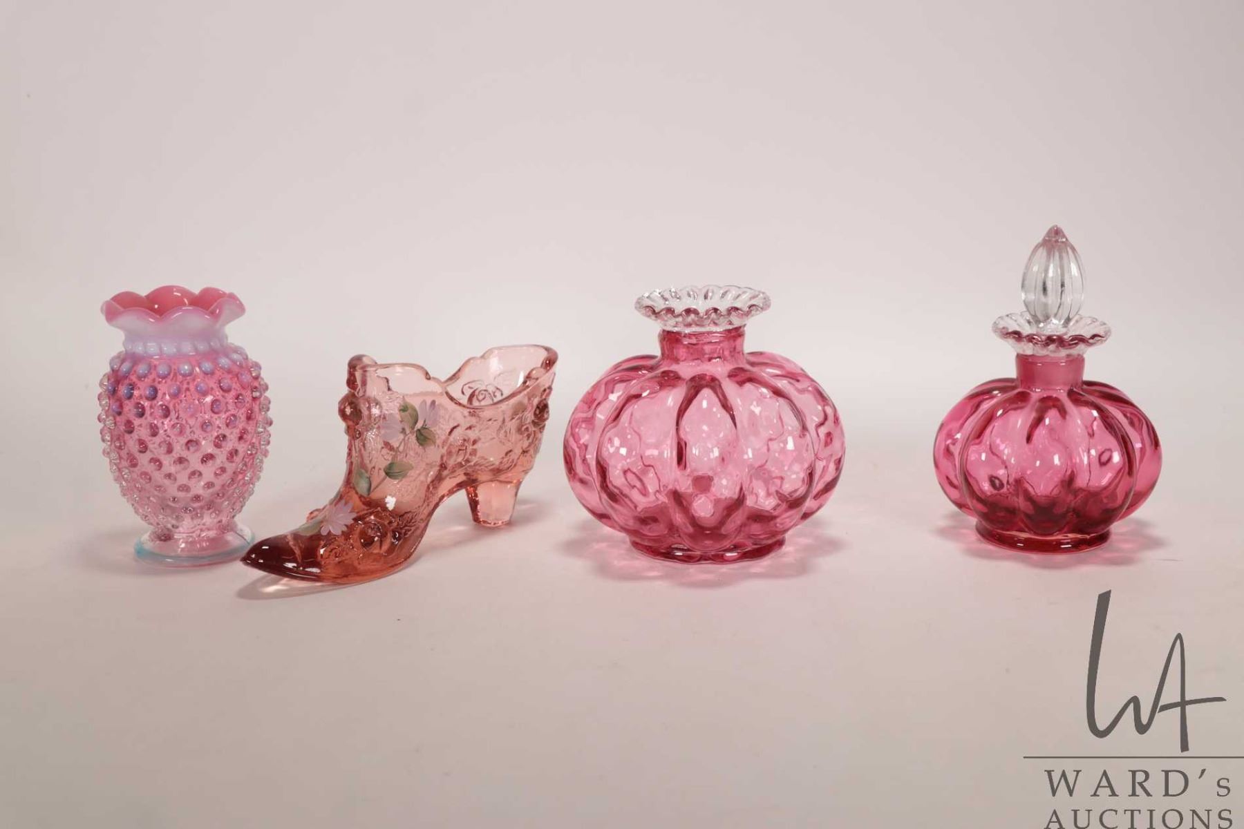 Four pieces of vintage collectible glass including cranberry/ opalescent 3 3/4" hobnail vase, cranberry melon perfume with clear ruffled edge and stopper, mellon vase with clear ruffled edge and a handpainted pink Fenton shoe