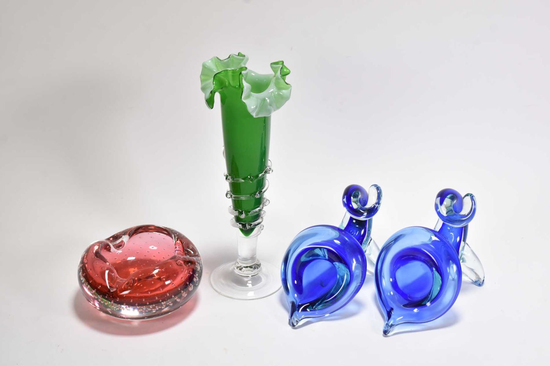 Four pieces of vintage glass including green cased and ruffled vase 9" in height, two Murano art glass cornucopias and a cranberry bubble glass ashtray
