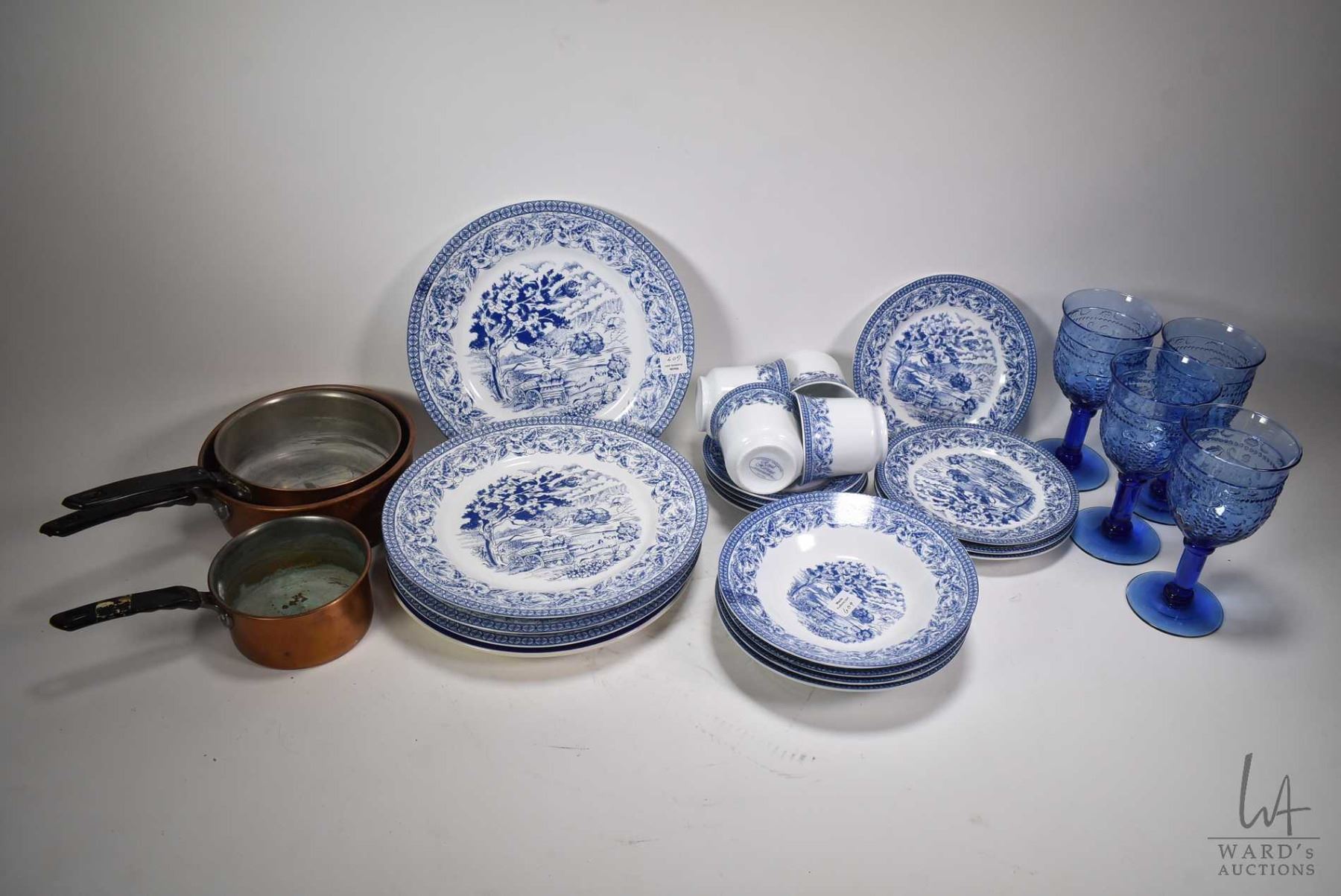 Four place setting of Royal Heritage porcelain blue and white china including dinner plates, side plates, tea cups, saucers, cereal bowl and glass goblets, plus three graduated copper sauce pans etc.