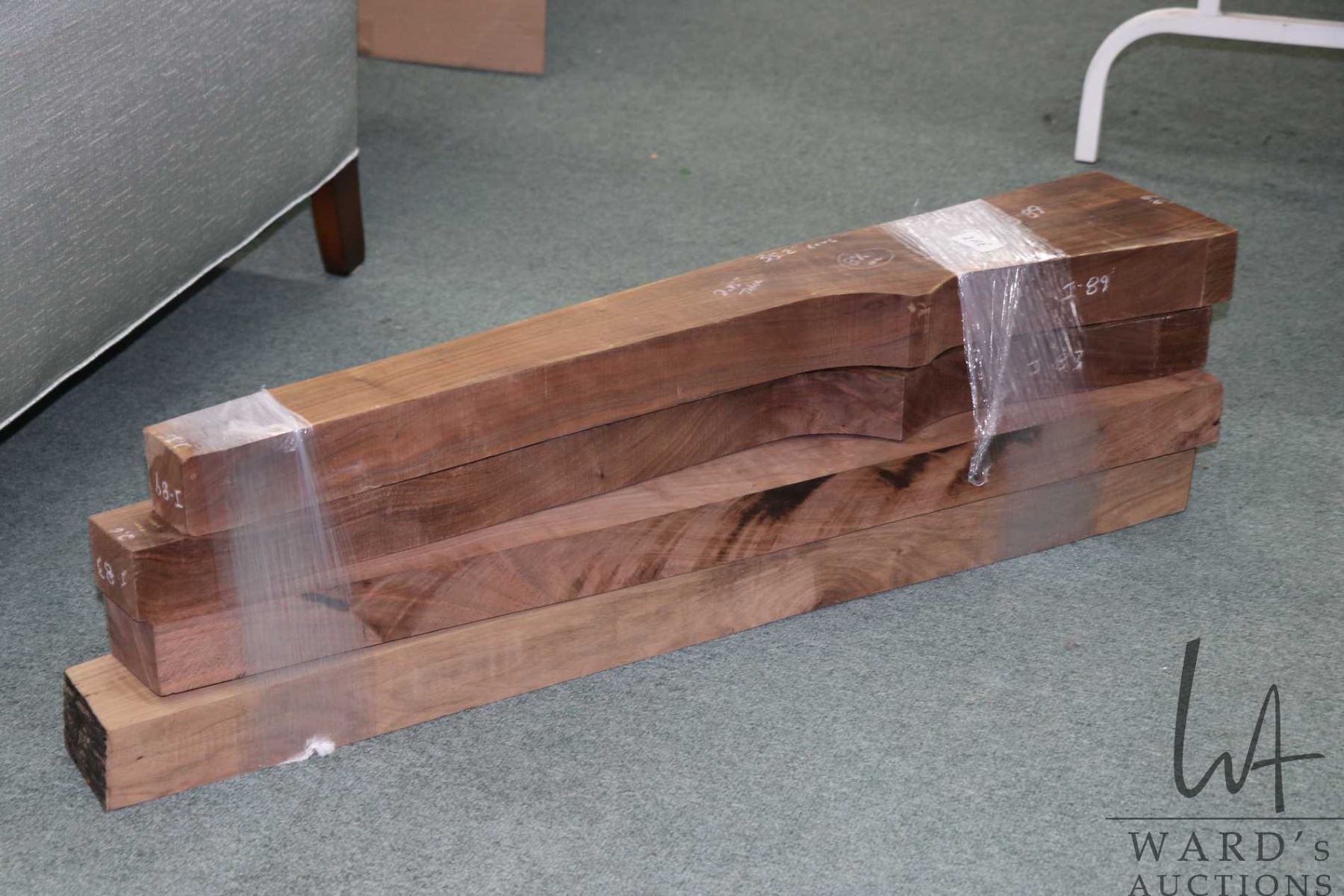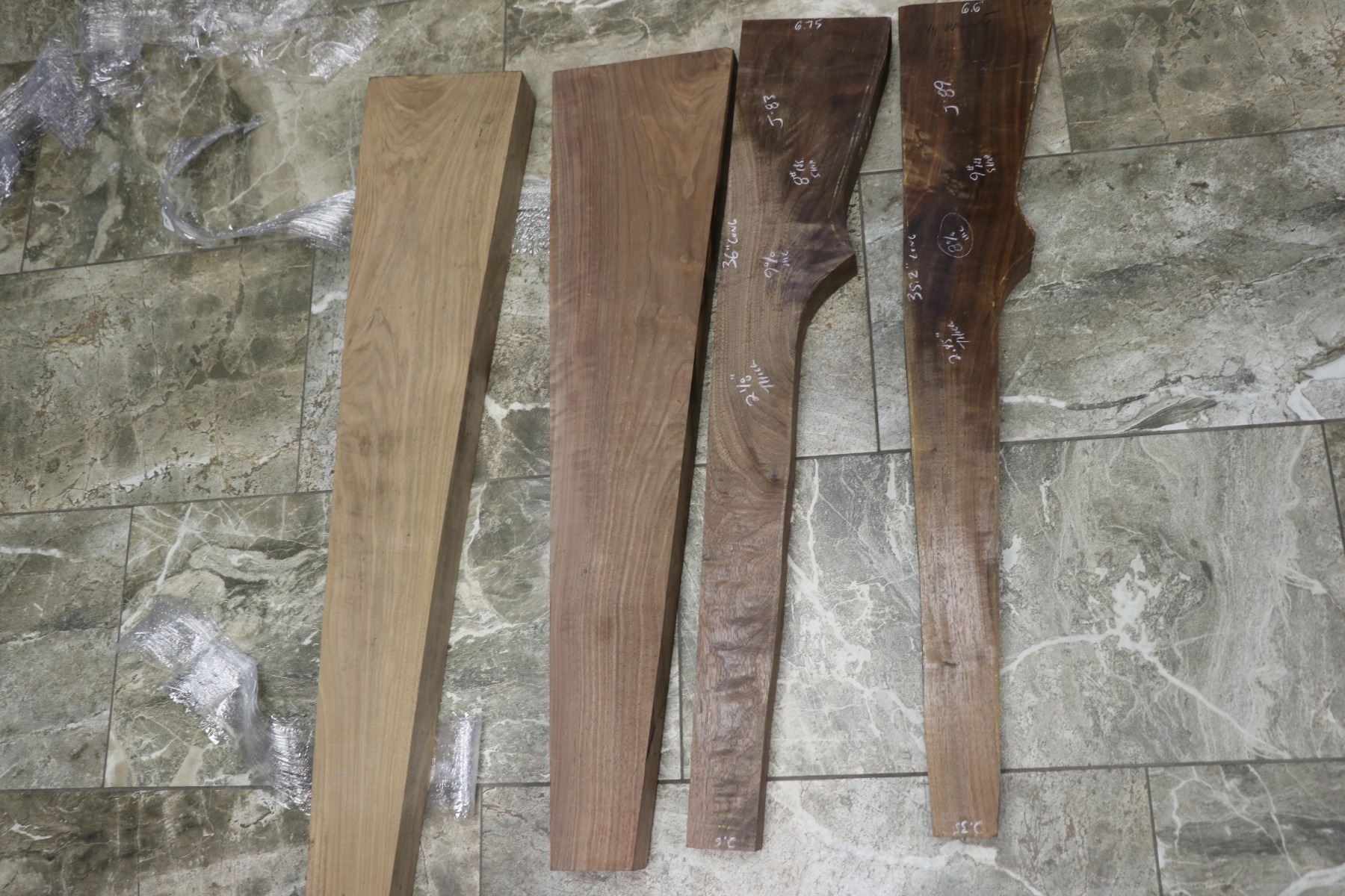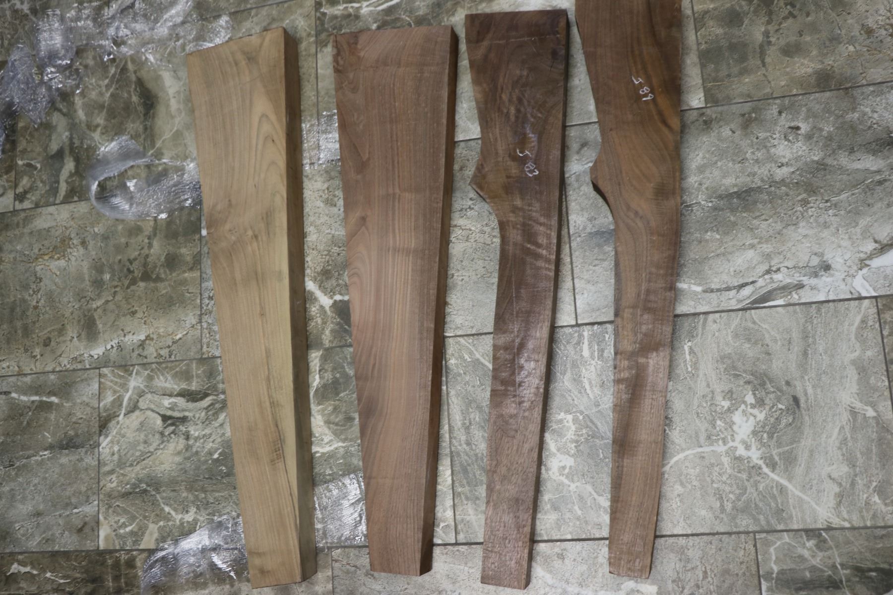 Four presumably walnut rifle stocks from unknown supplie including inventory numbers J-83, J-89, 161 and one unmarked