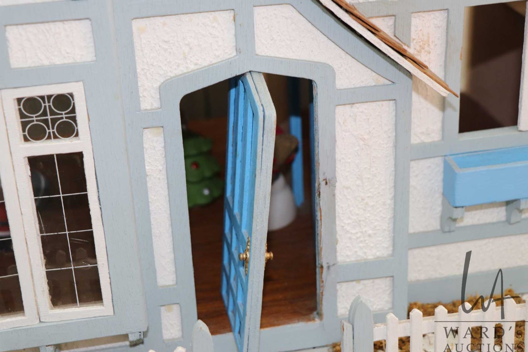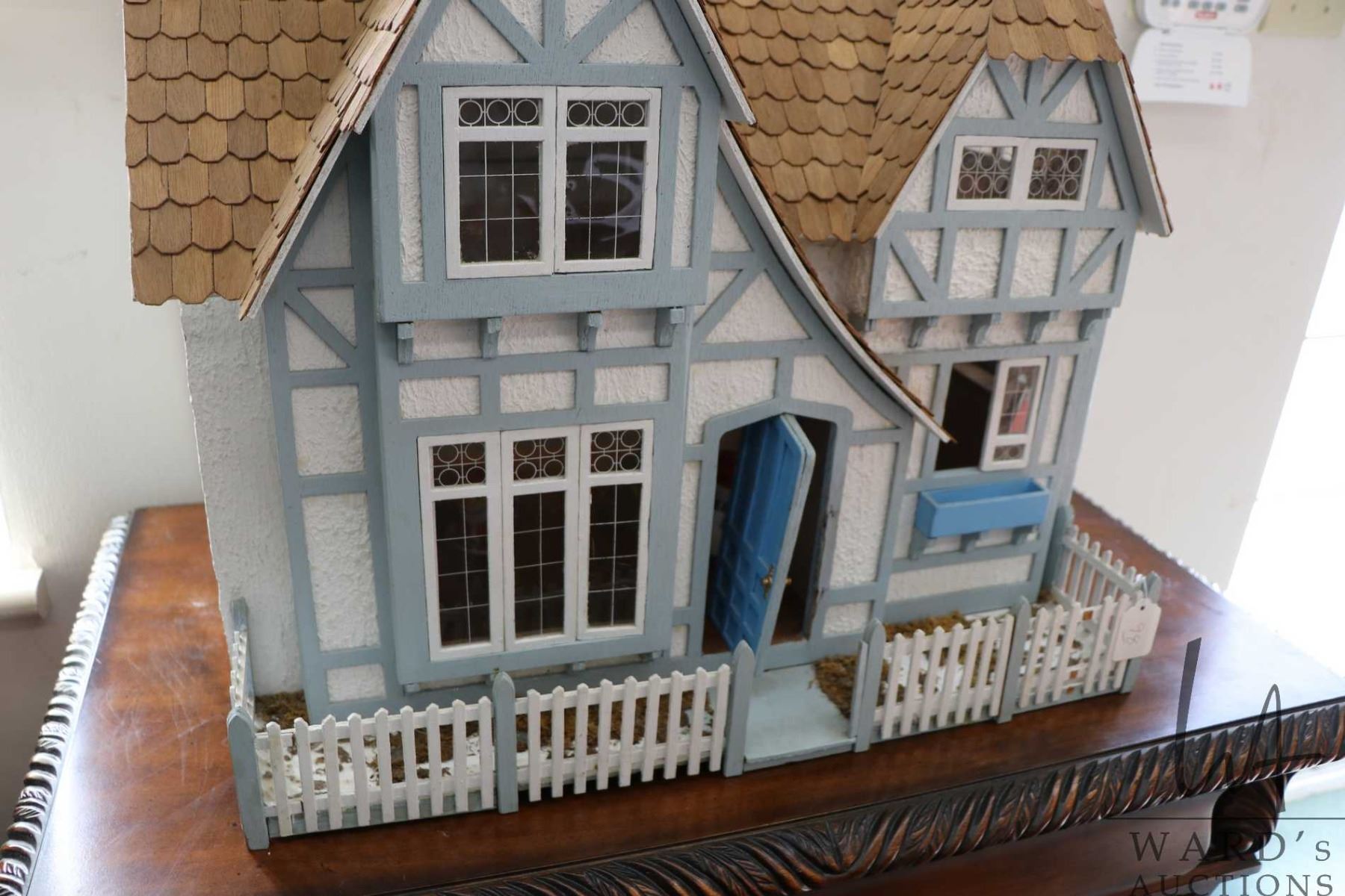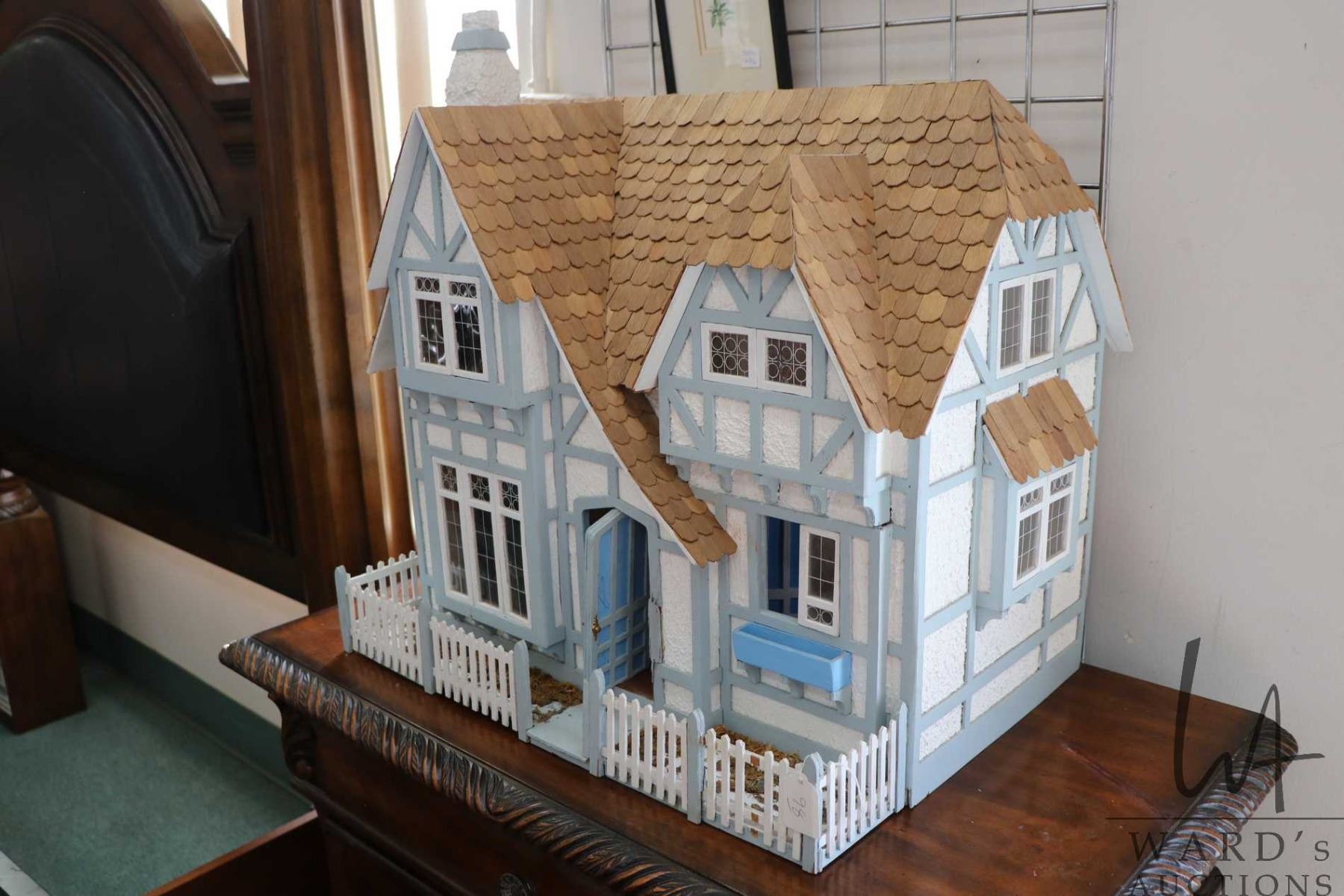 Four room Tudor dollshouse, with white picket fence, plastic windows and cedar shakes, 25" X 17" X 25" in height. Note: Not Available For Shipping. Local Pickup Only