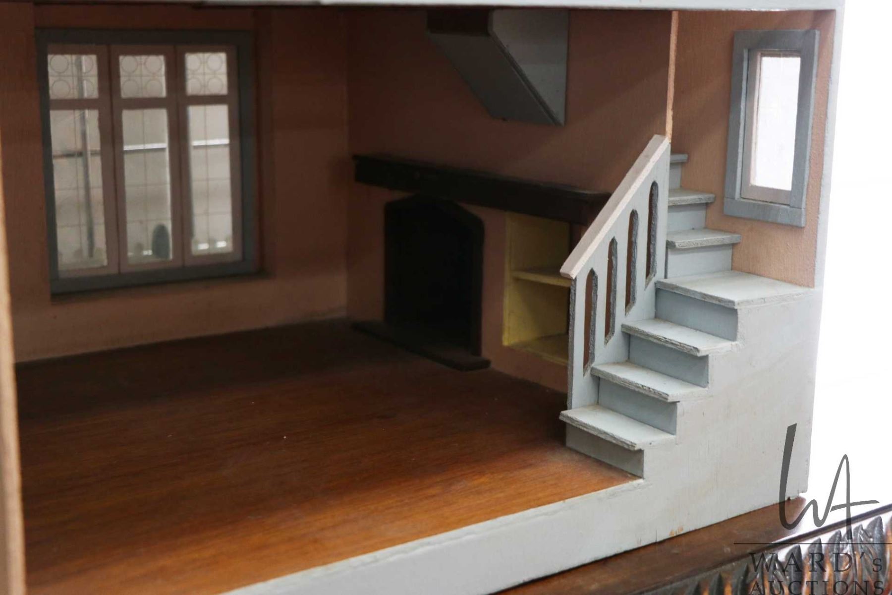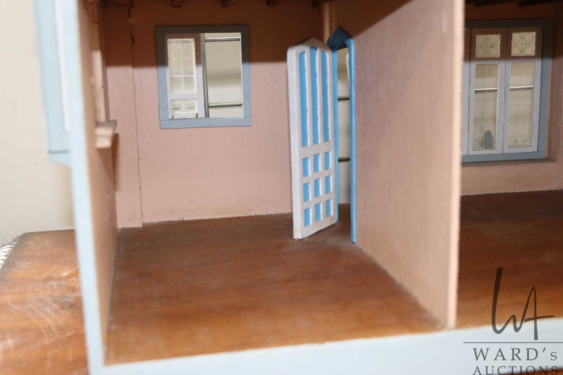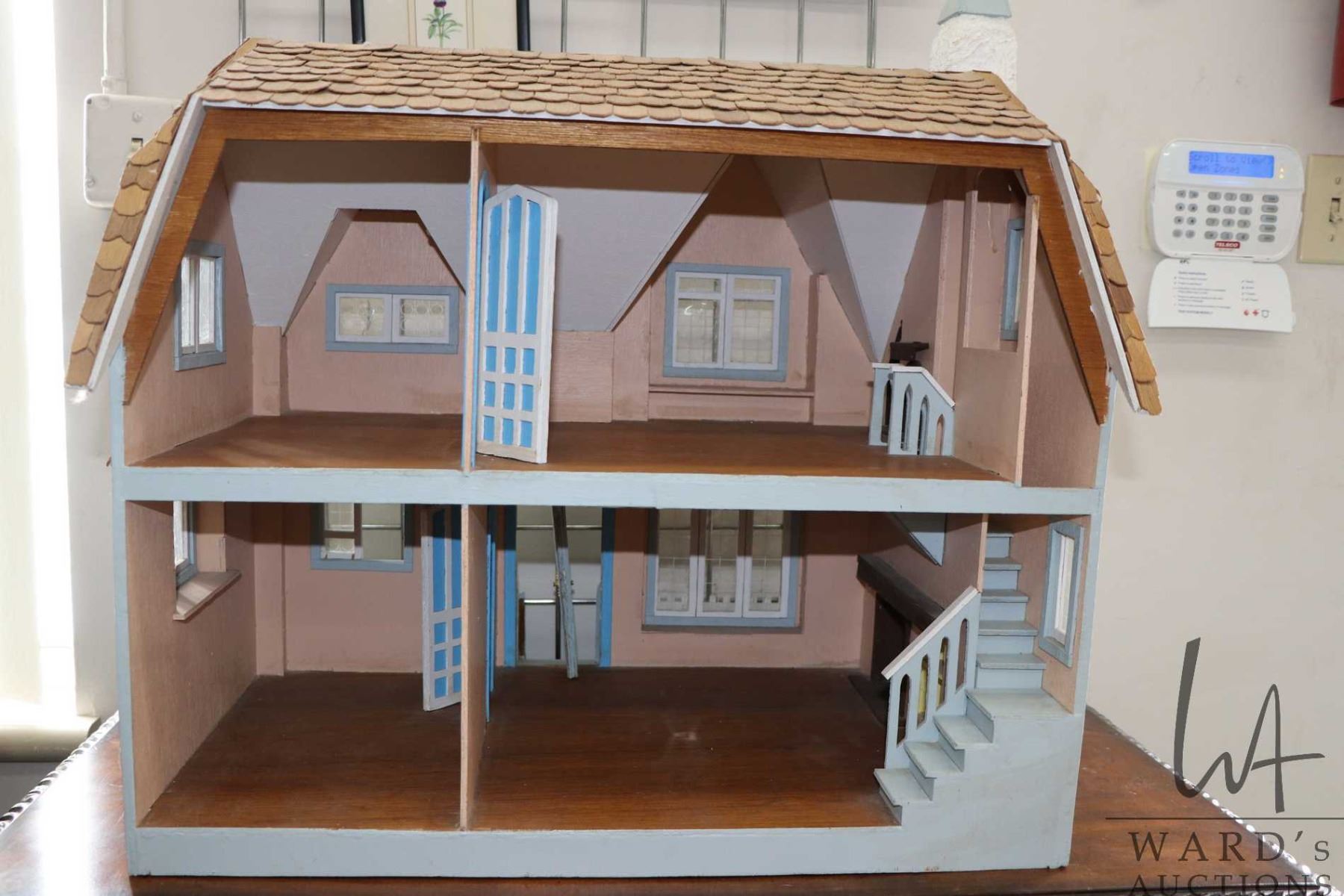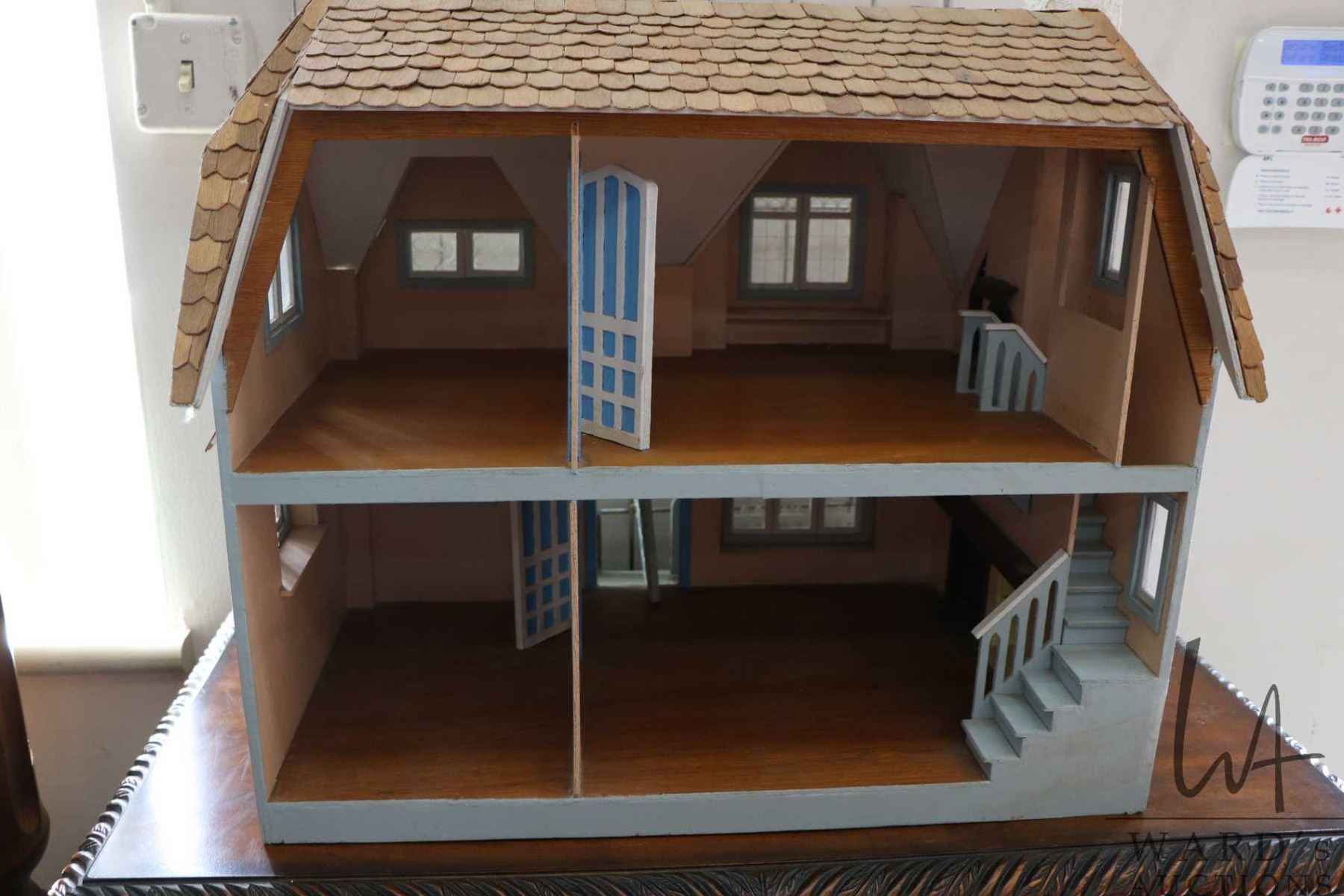 Four room Tudor dollshouse, with white picket fence, plastic windows and cedar shakes, 25" X 17" X 25" in height. Note: Not Available For Shipping. Local Pickup Only