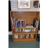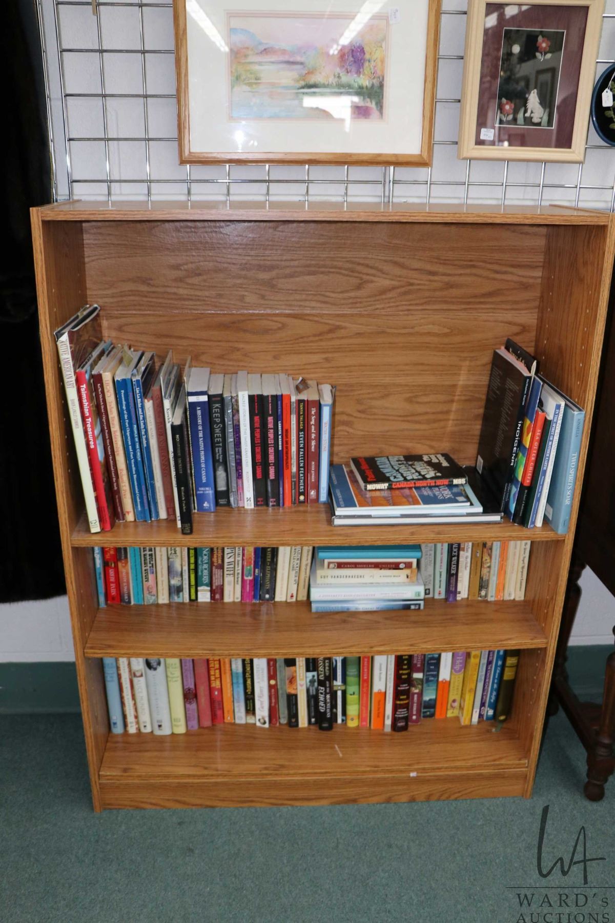 Four shelve book case and contents including Native American history and reference guides, large selection of paperbacks, some hardcover including Nora Roberts, John Lee Carre, Erving Stone etc.