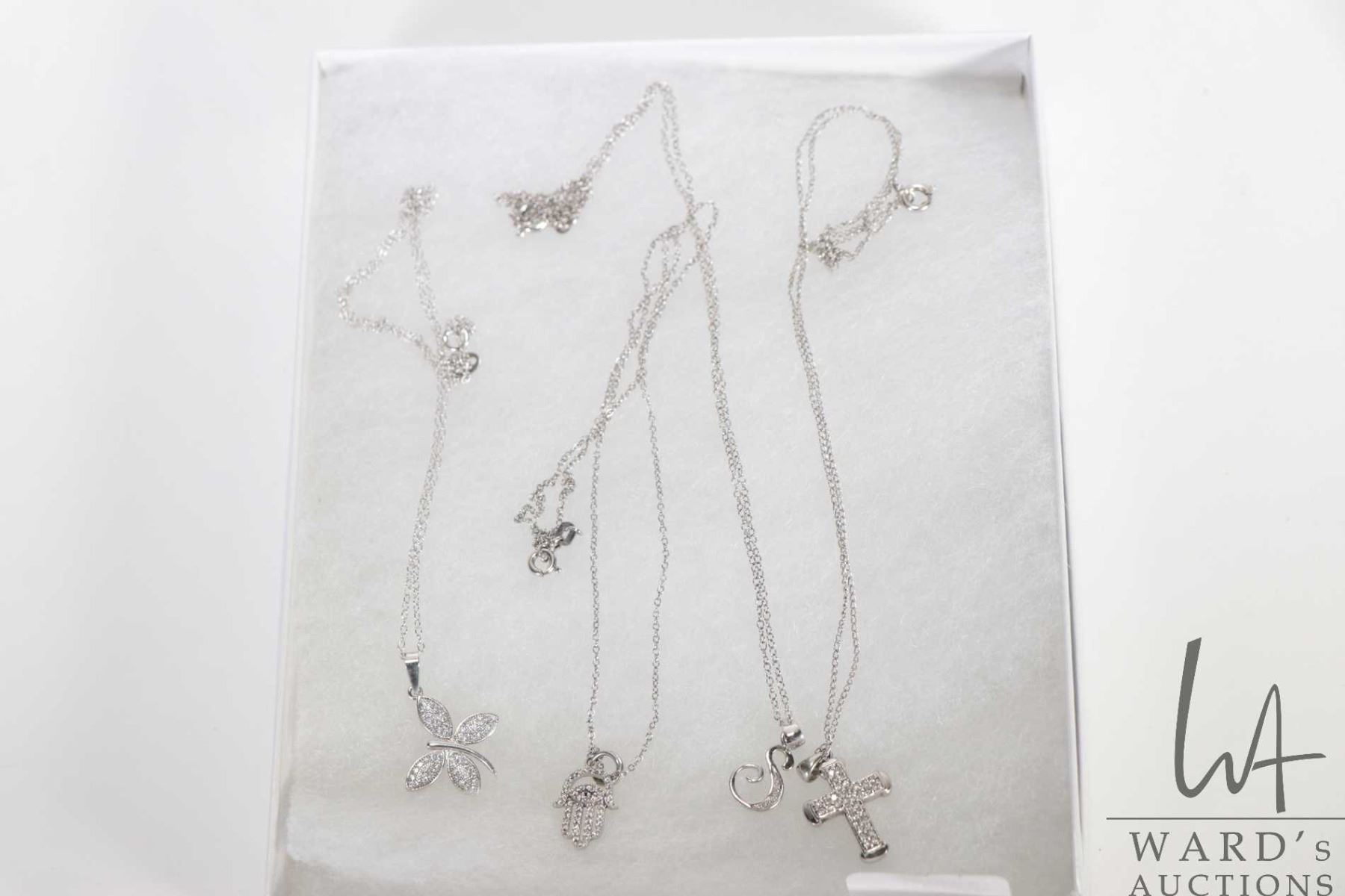 Four silver necklaces and pendants including butterfly pendant, cross pendant, hand pendant and "S" pendant, all with diamond/ diamond like gemstones