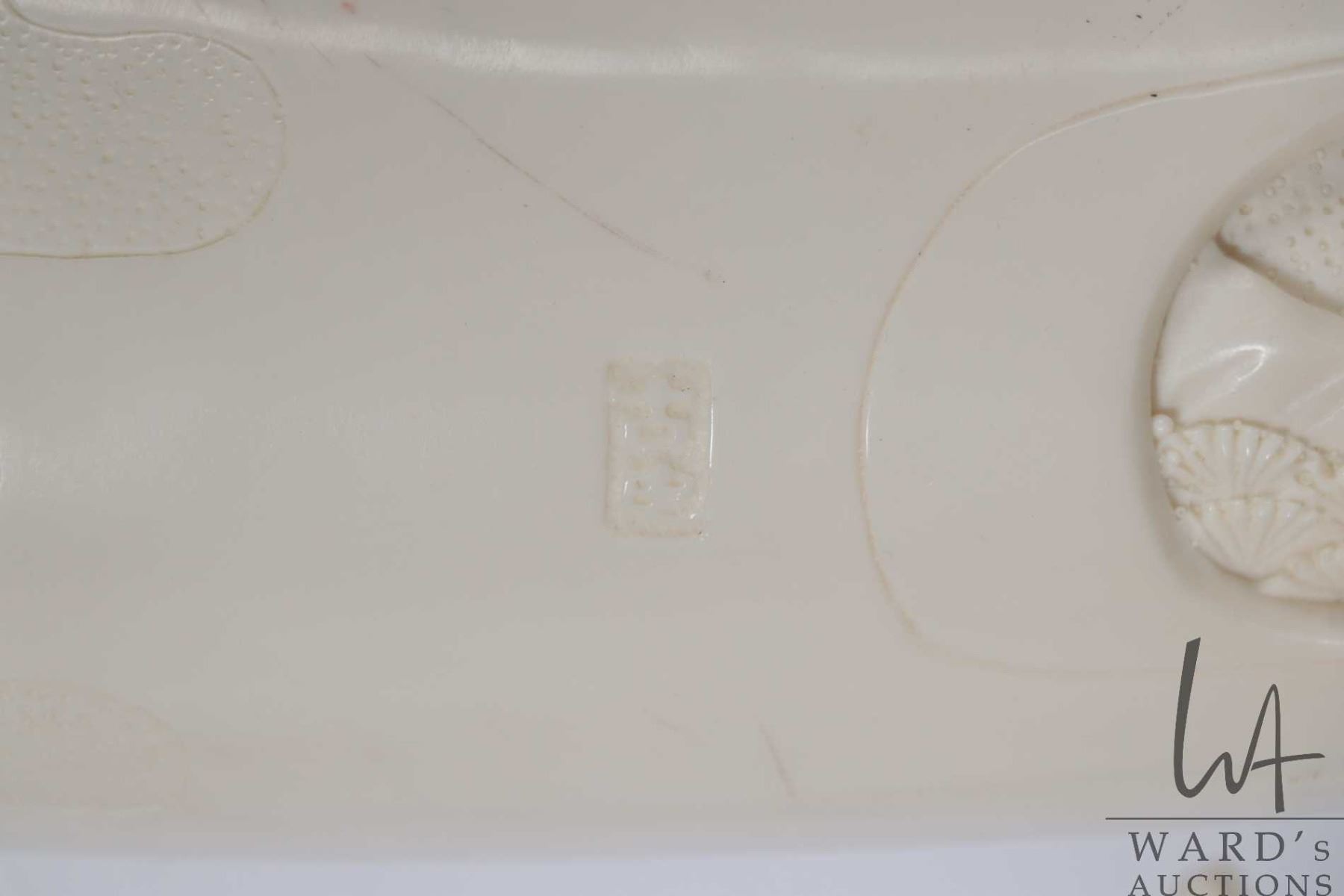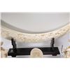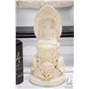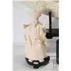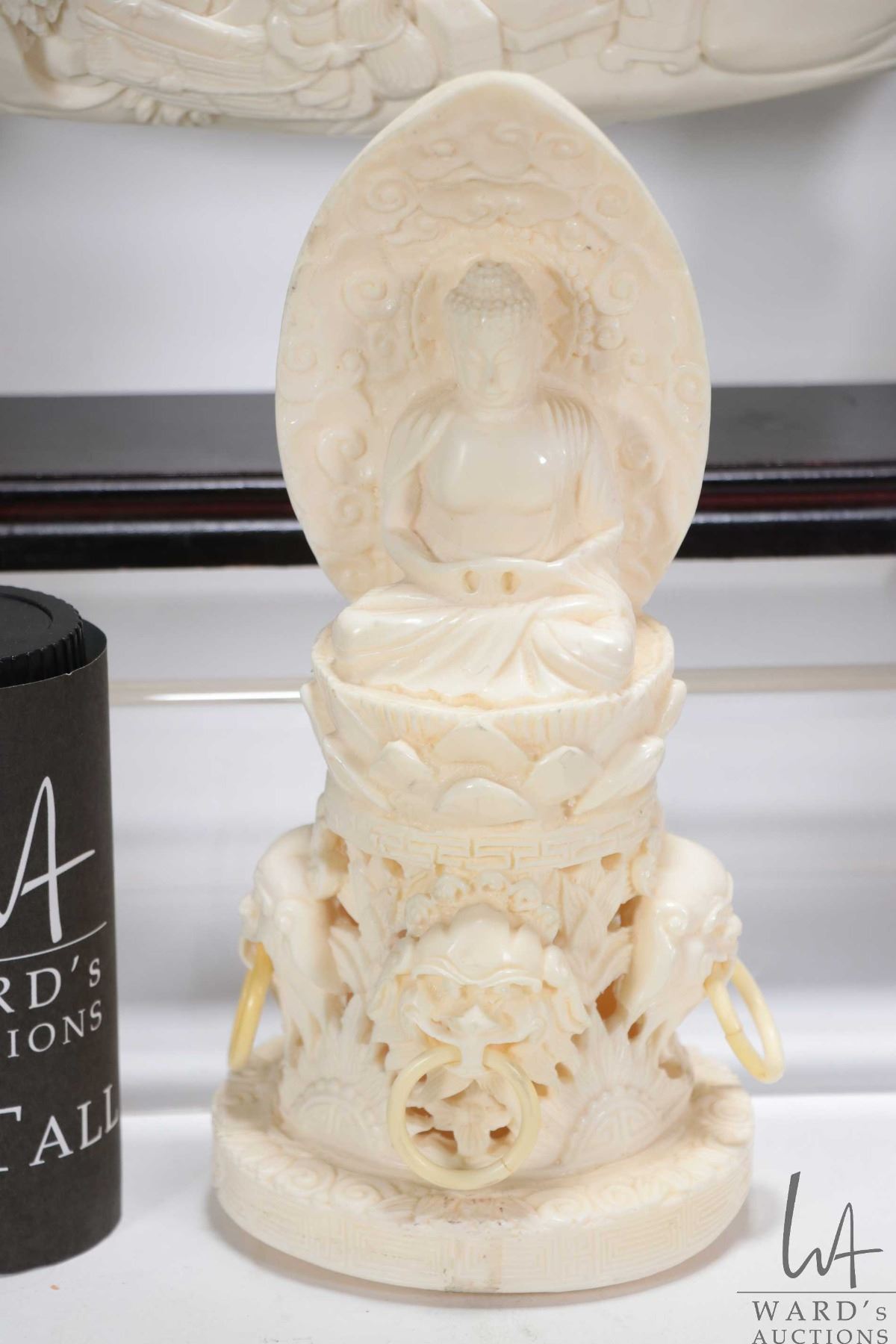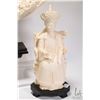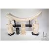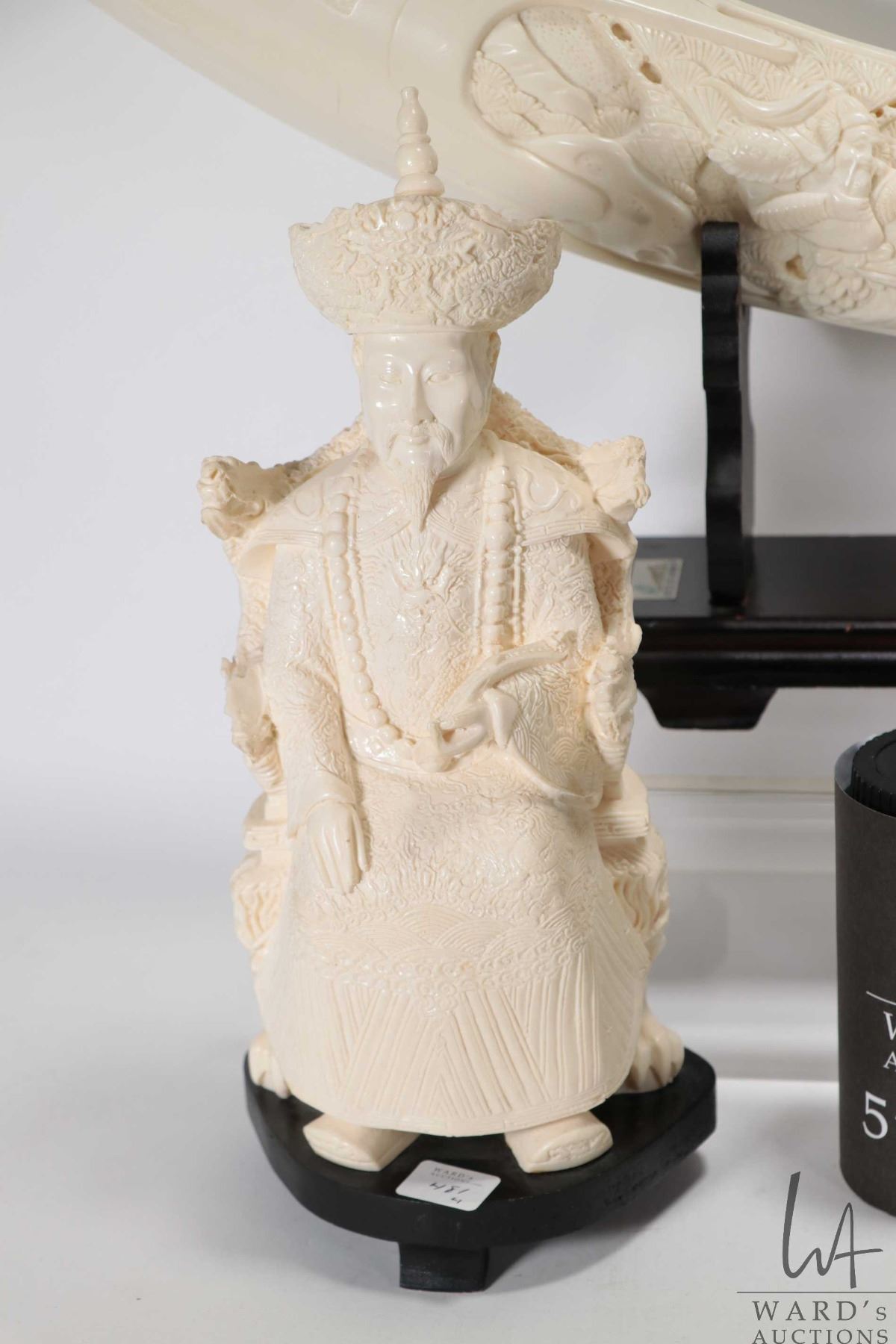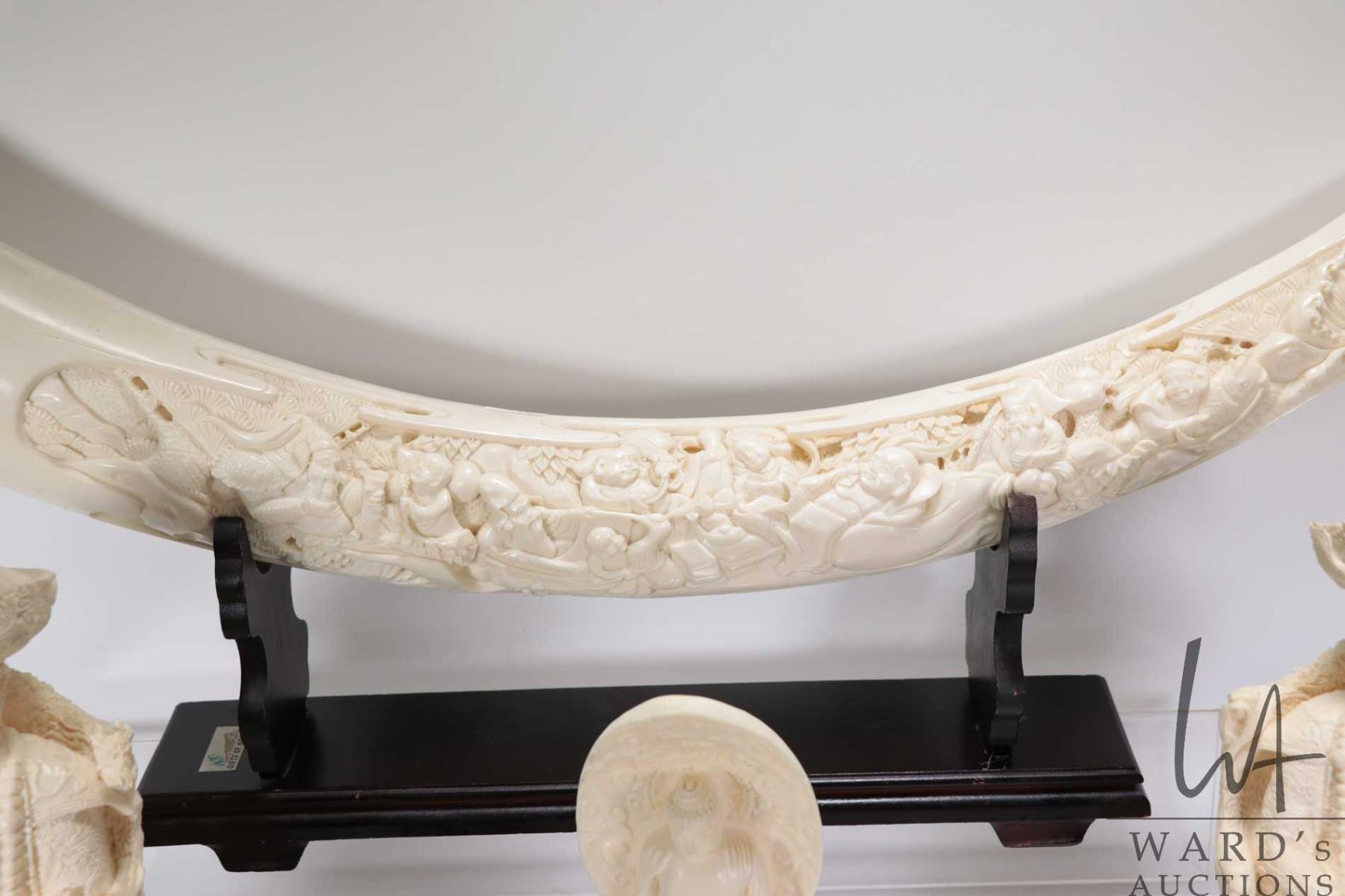 Four simulated ivory collectibles including 31" tusk, three full figures including man and woman on thrones, note: some distressing to one figure. Note: Not available for shipping. Local pickup only