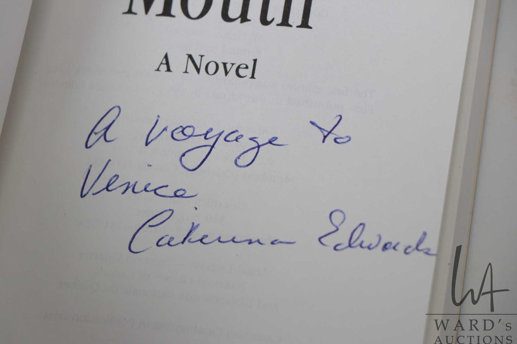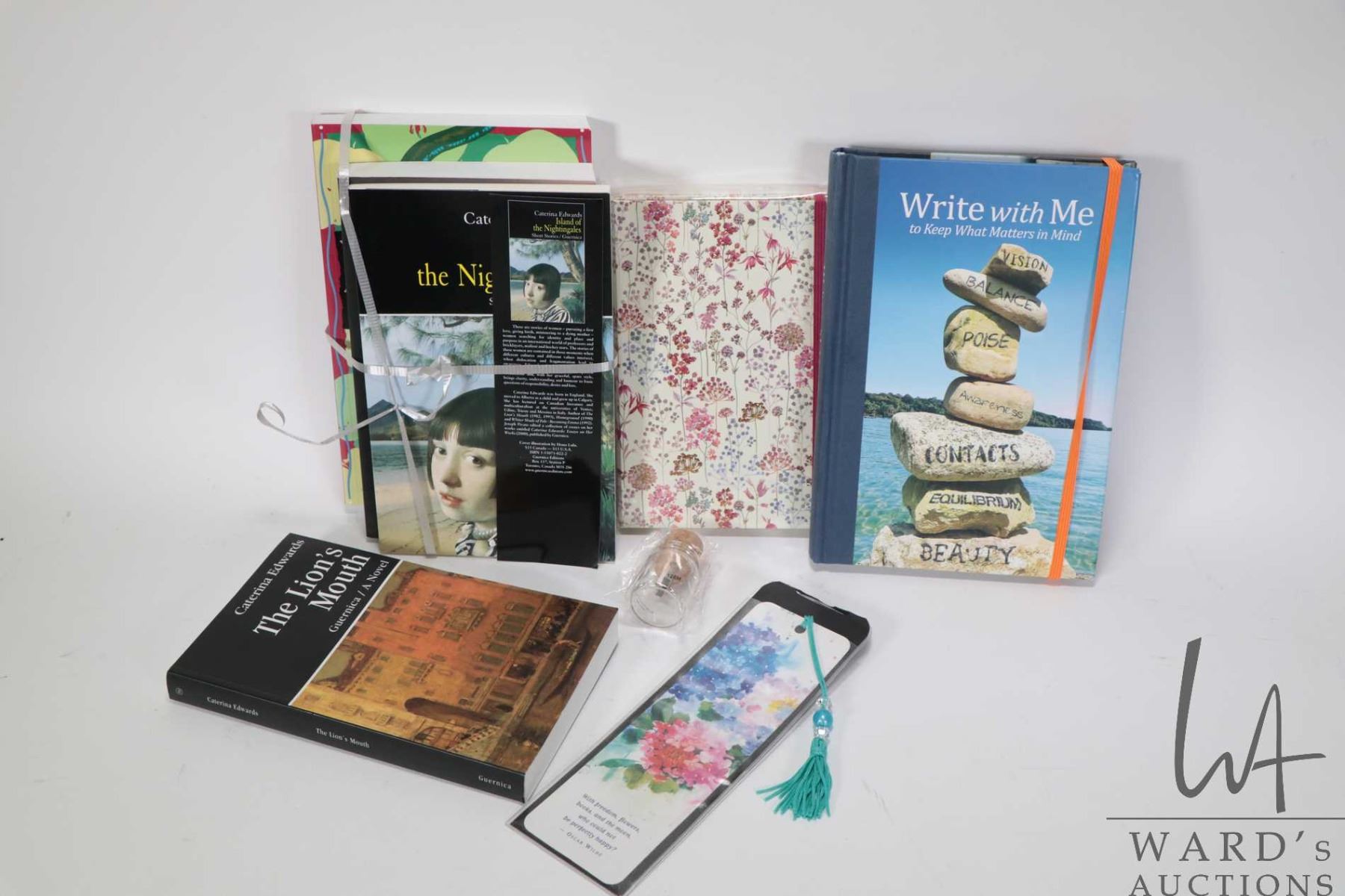 Four soft cover books by author Caterina Edwards including "The Lion's Mouth", "Island of the Nightingales", "Eating Apple" and "The Sicilian Wife" all autographed by author plus a book mark, a "Write With Me" notebook, a wildflower meadow journal and a USB copy of Derek Sweet comedy routine entitled "Miserably Yours". These items are being on behalf of the Support fund for Adults with Disabilities, and will be sold sellers commission free with all monies including applicable buyers premium will be forwarded to the registered charity