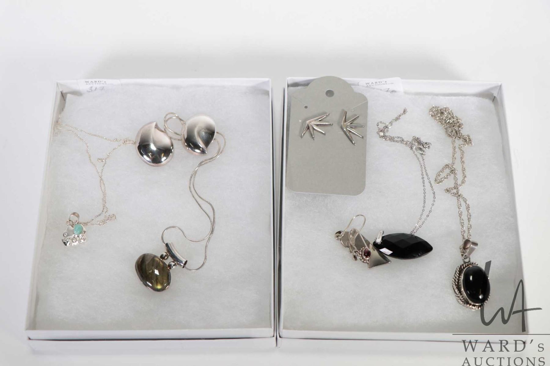 Four sterling silver necklaces and pendants including elephant, two stone pendants and a faceted gemstone like and three pairs of sterling earrings