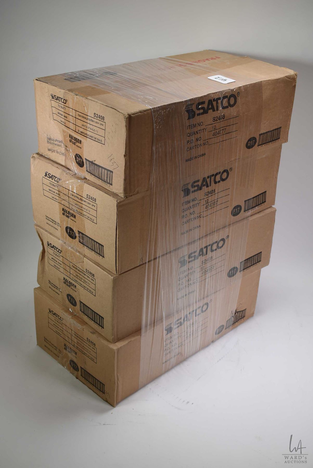 Four unopened boxes of Satco 72 watt halogen light bulbs, 96 light bulbs