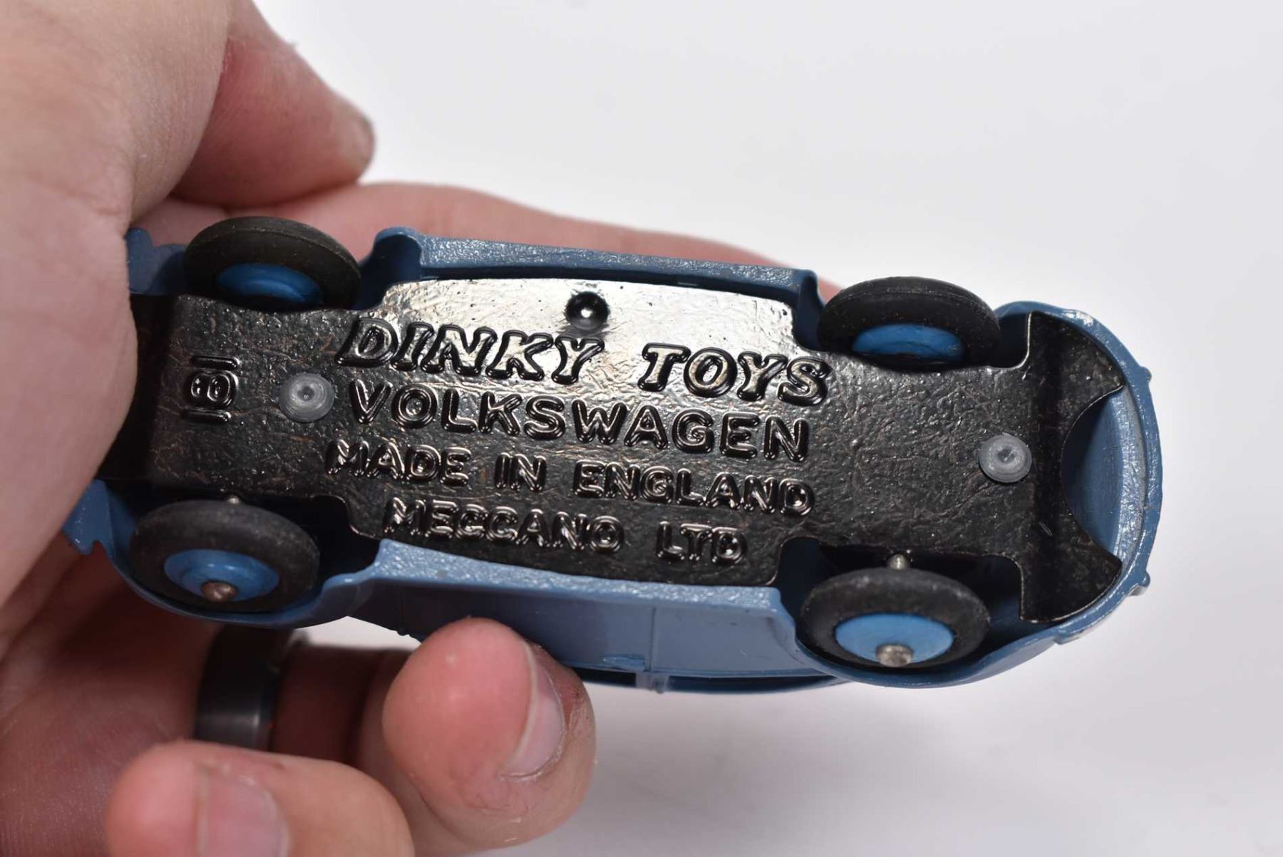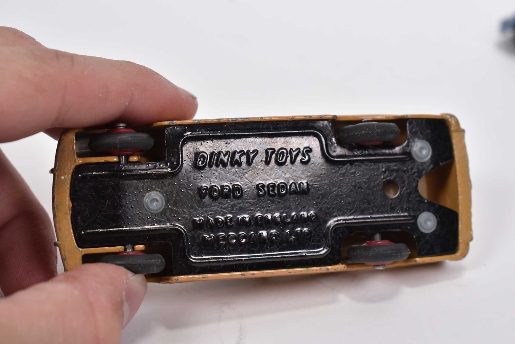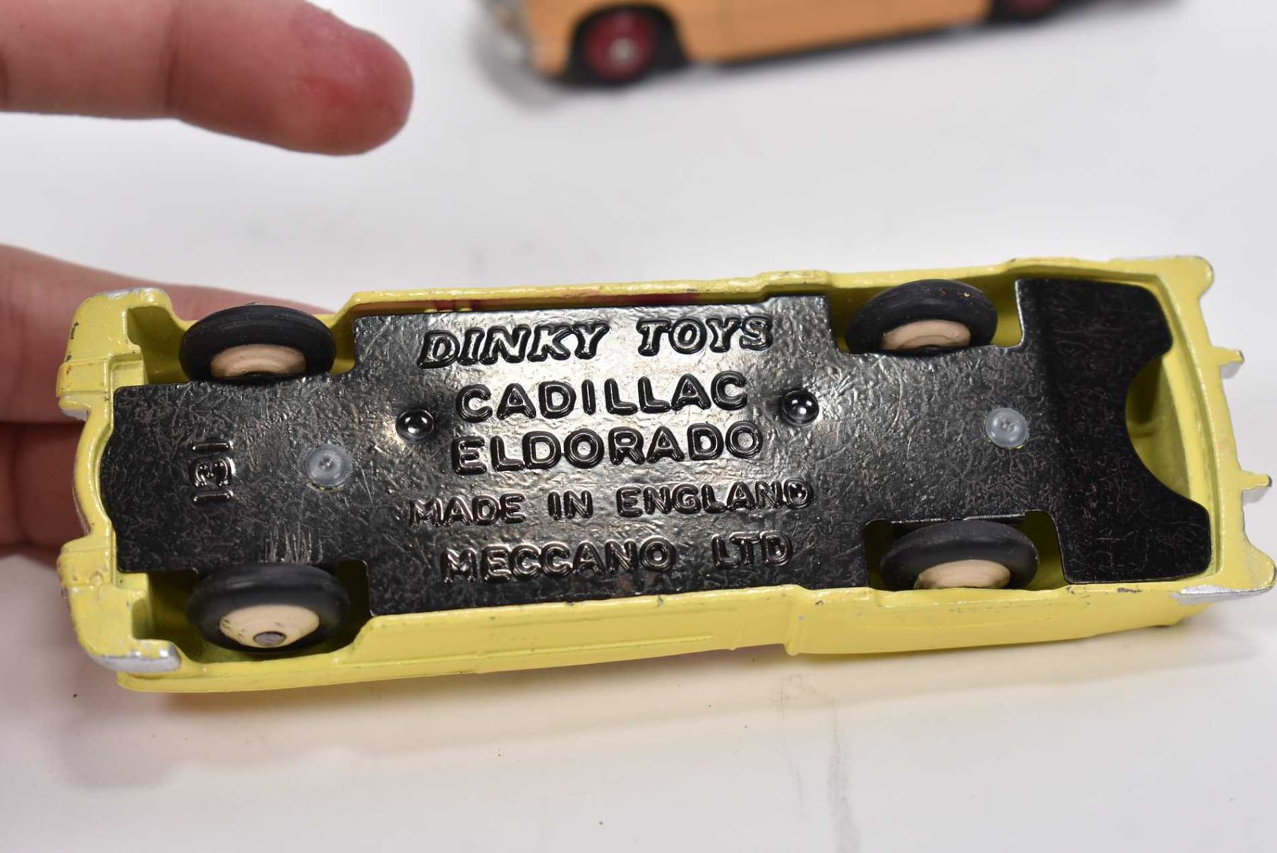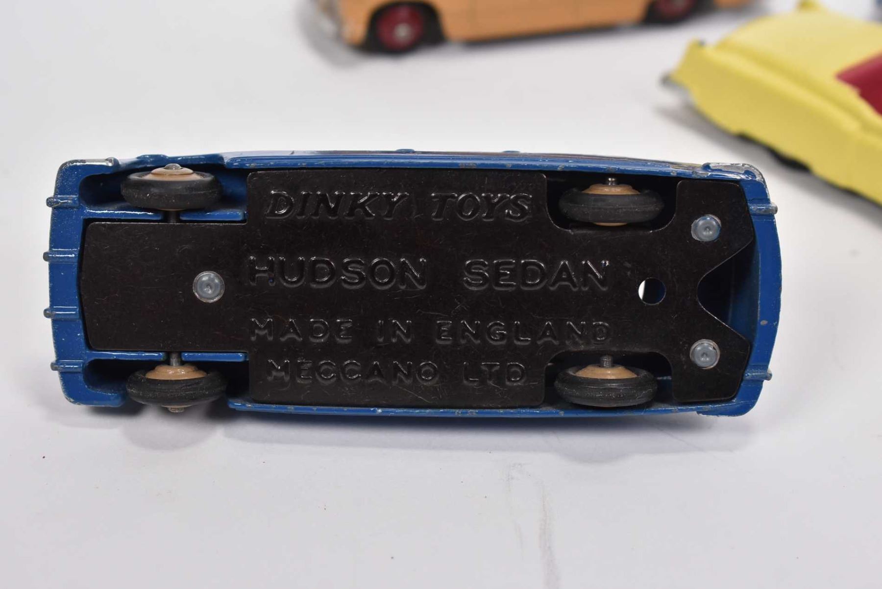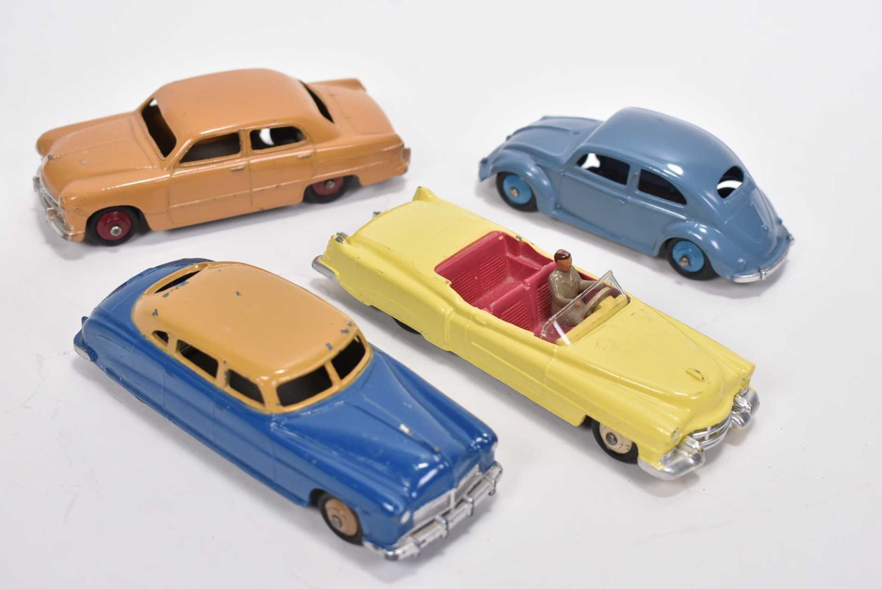 Four vintage Dinky Toys including Cadillac Eldorado # 131, Volkswagen # 181, Ford Sedan and a Hudson Sedan