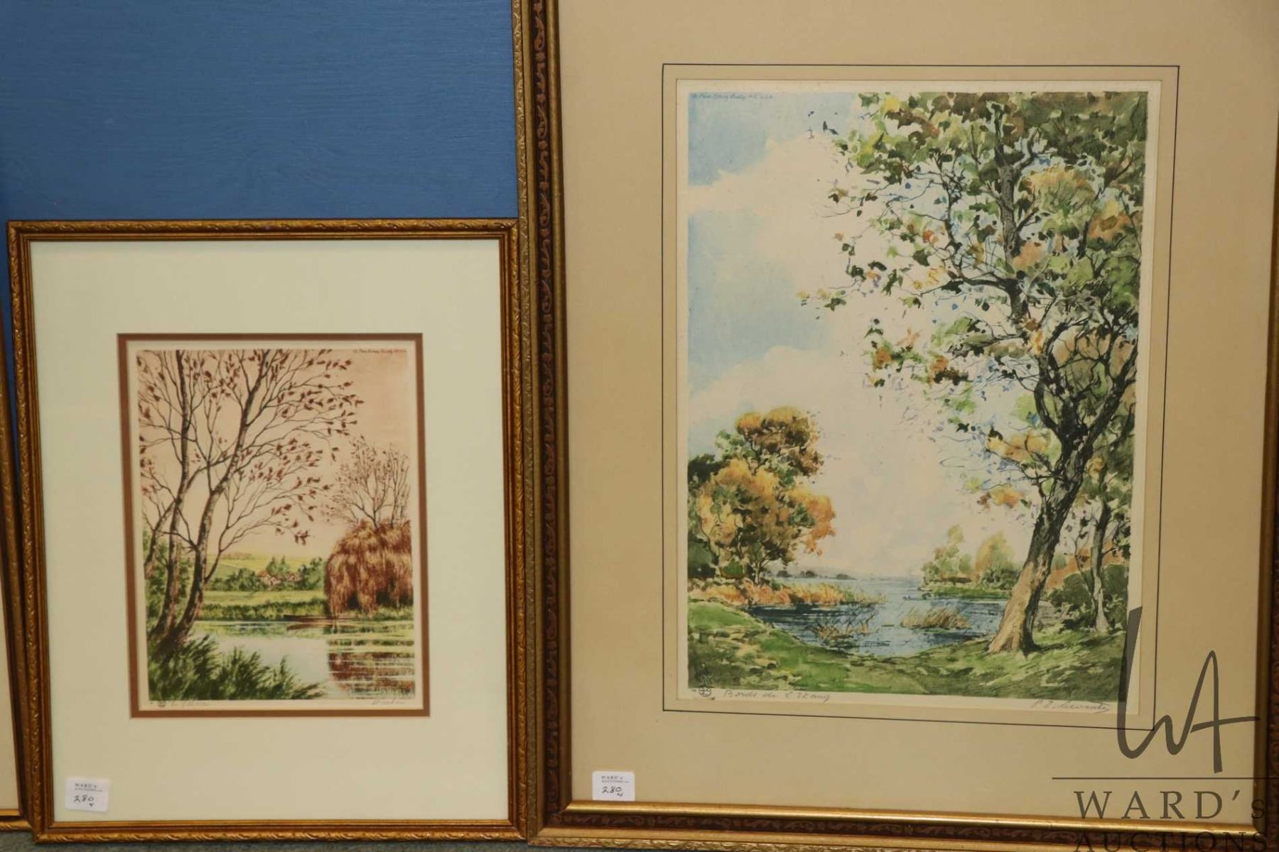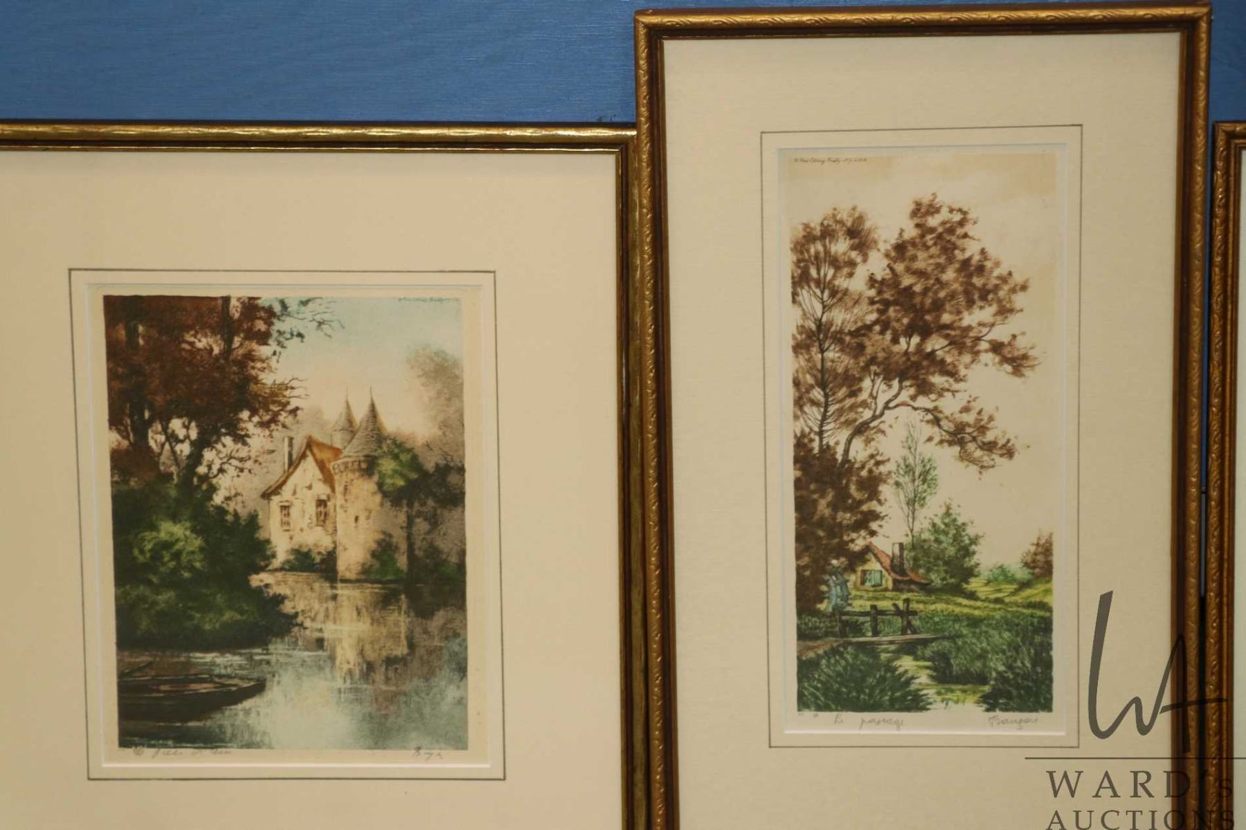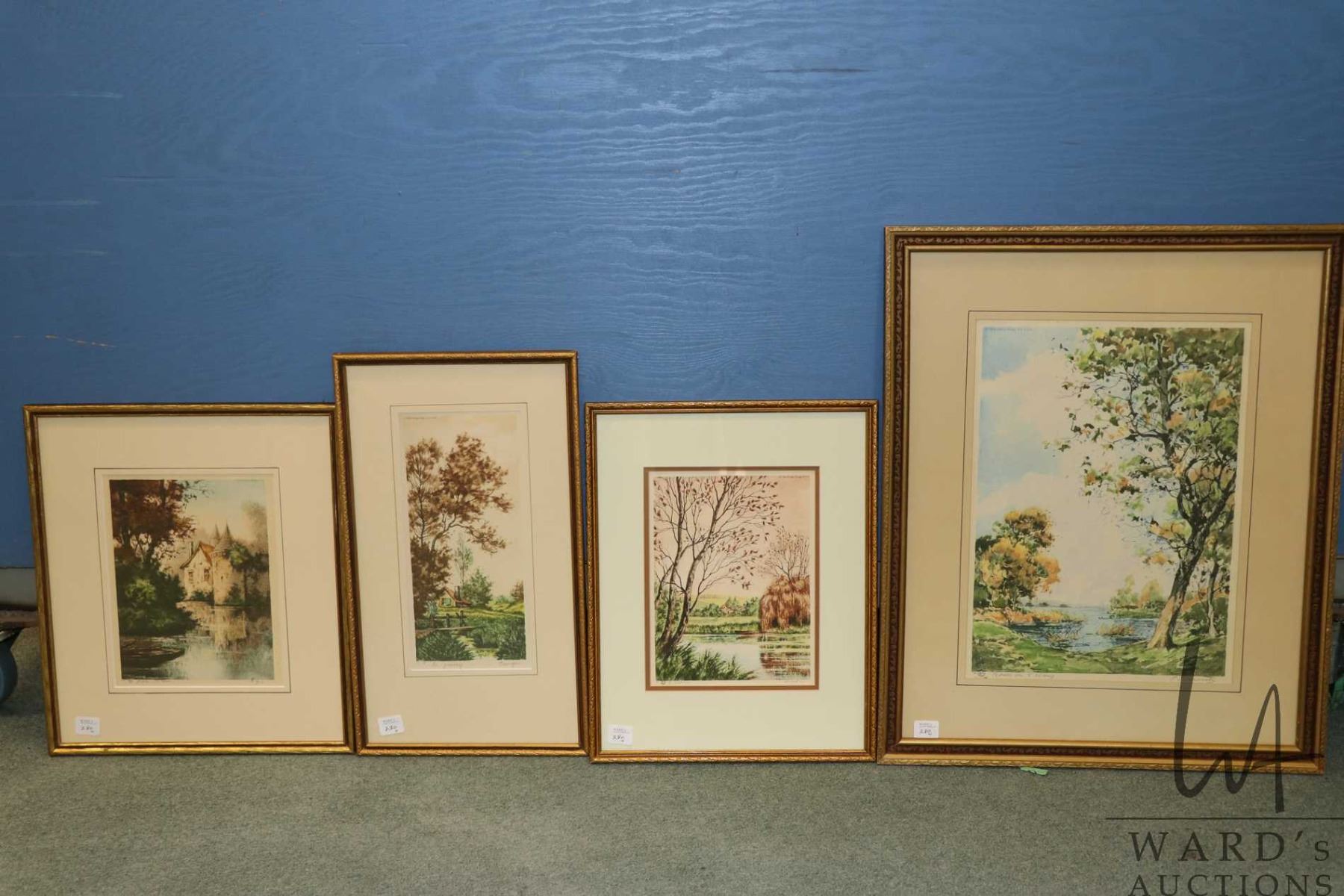Four vintage/ antique framed etched print landscape scenes including "The Rivulet" by Boyer, "Le Passage" Francois and a 22" X 17 1/2" overall framed dimension Paul Emile Lecomte etc.