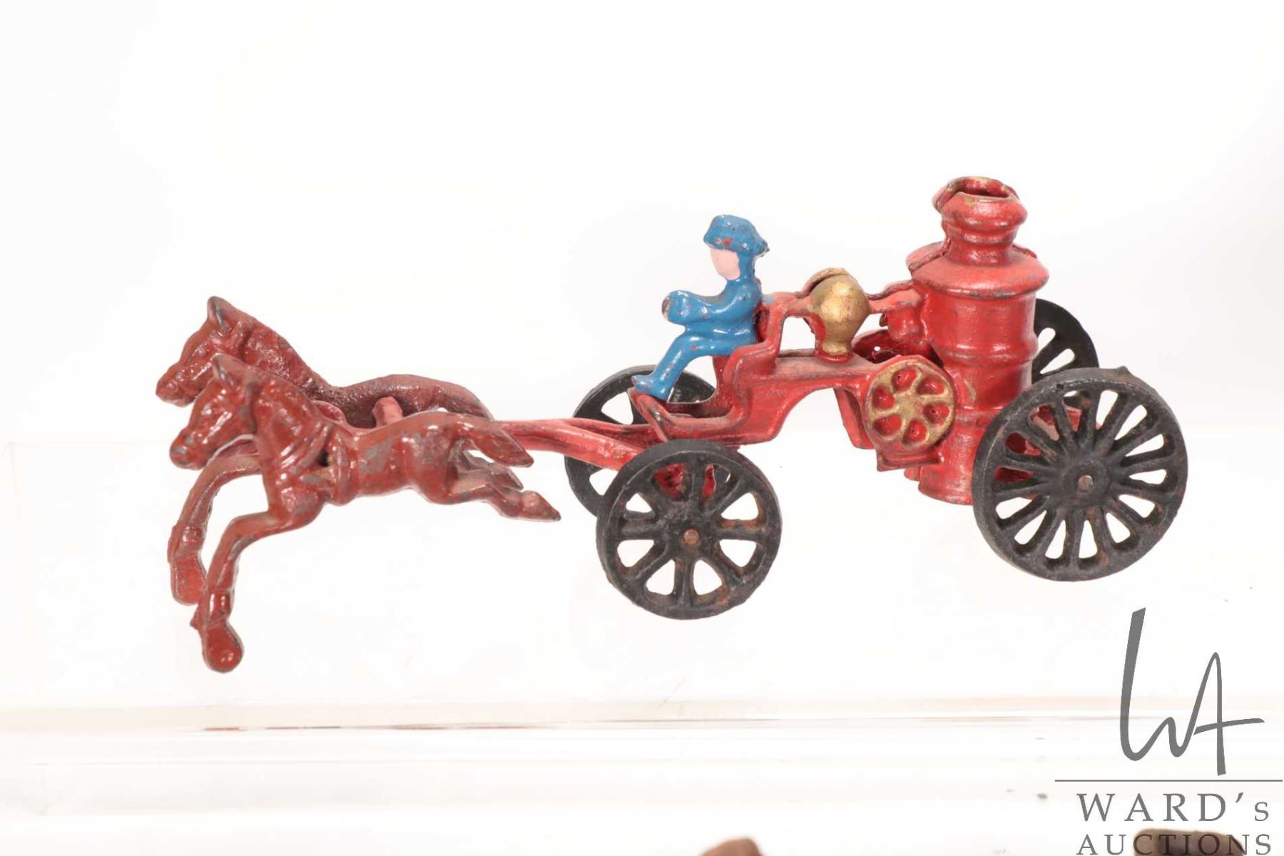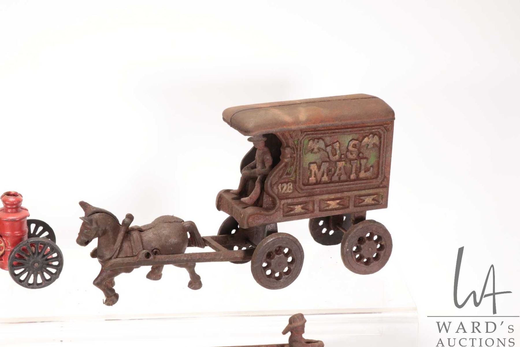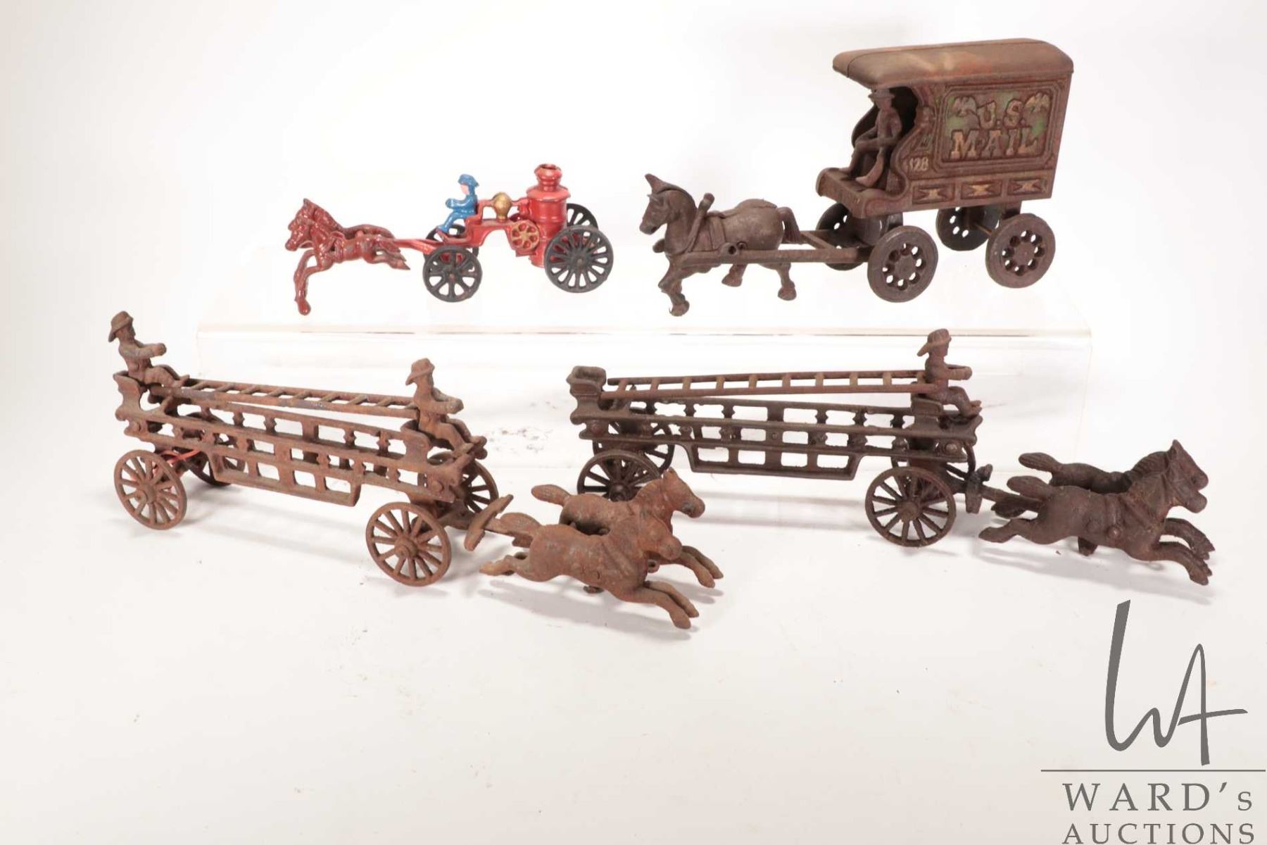 Four vintage cast metal toys including three horse drawn fire engines and one horse drawn US Mail