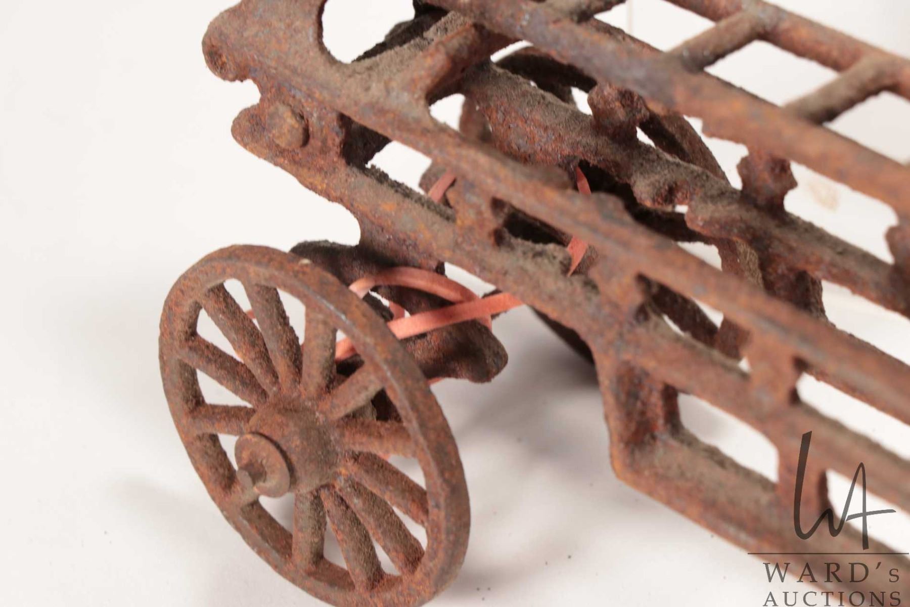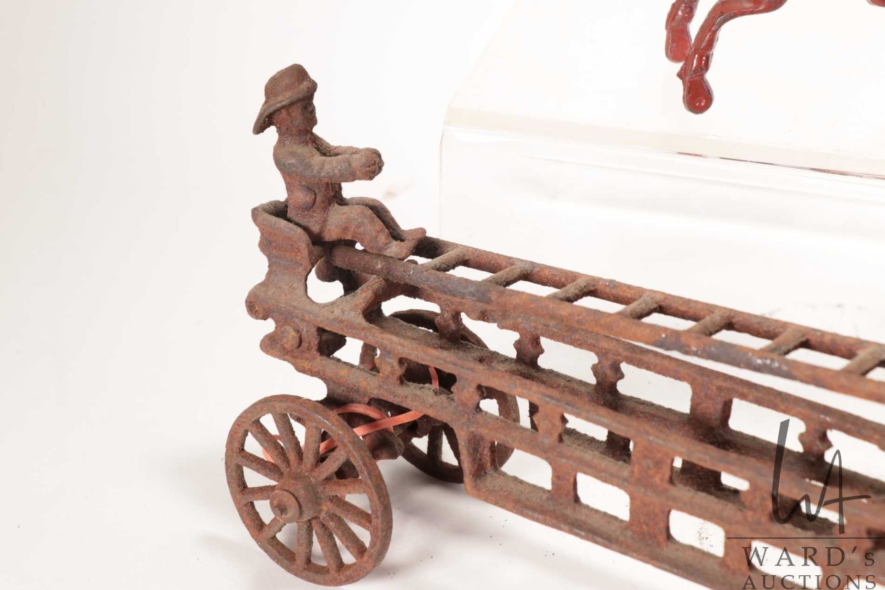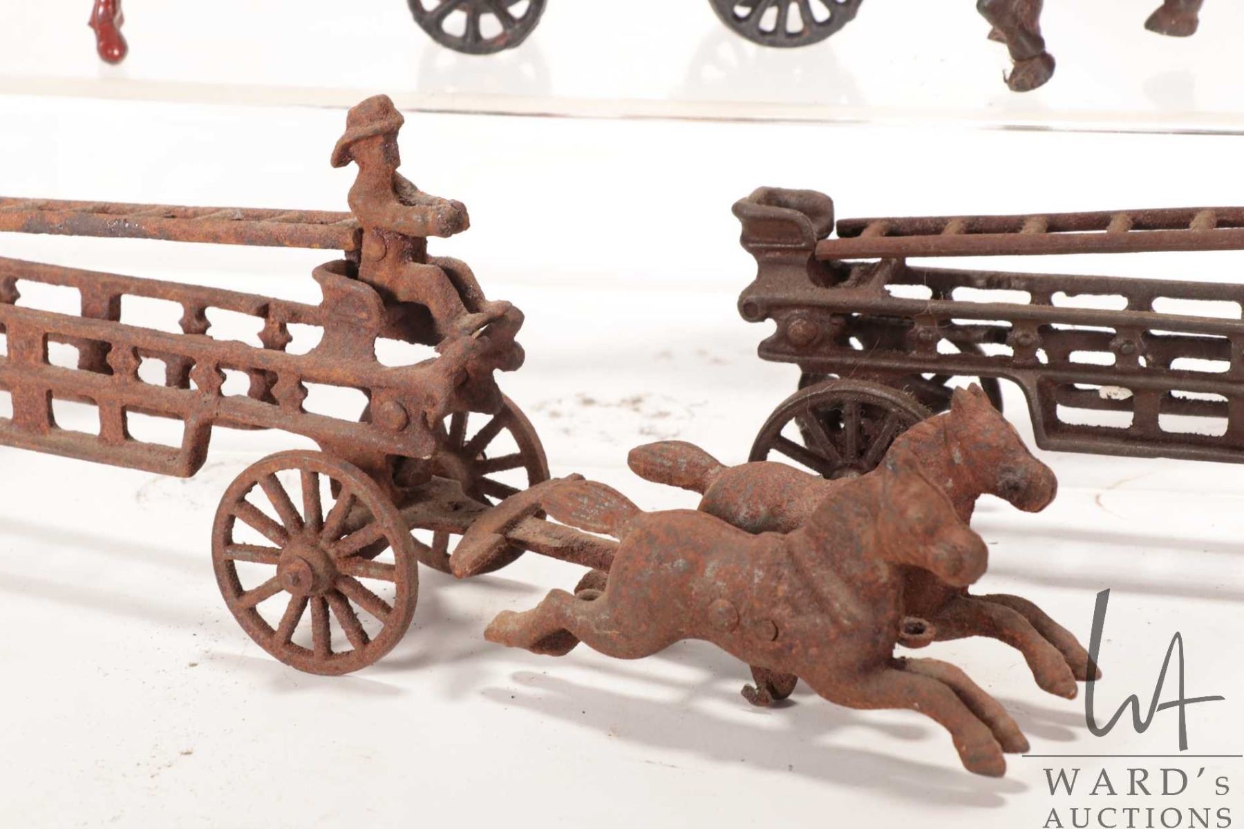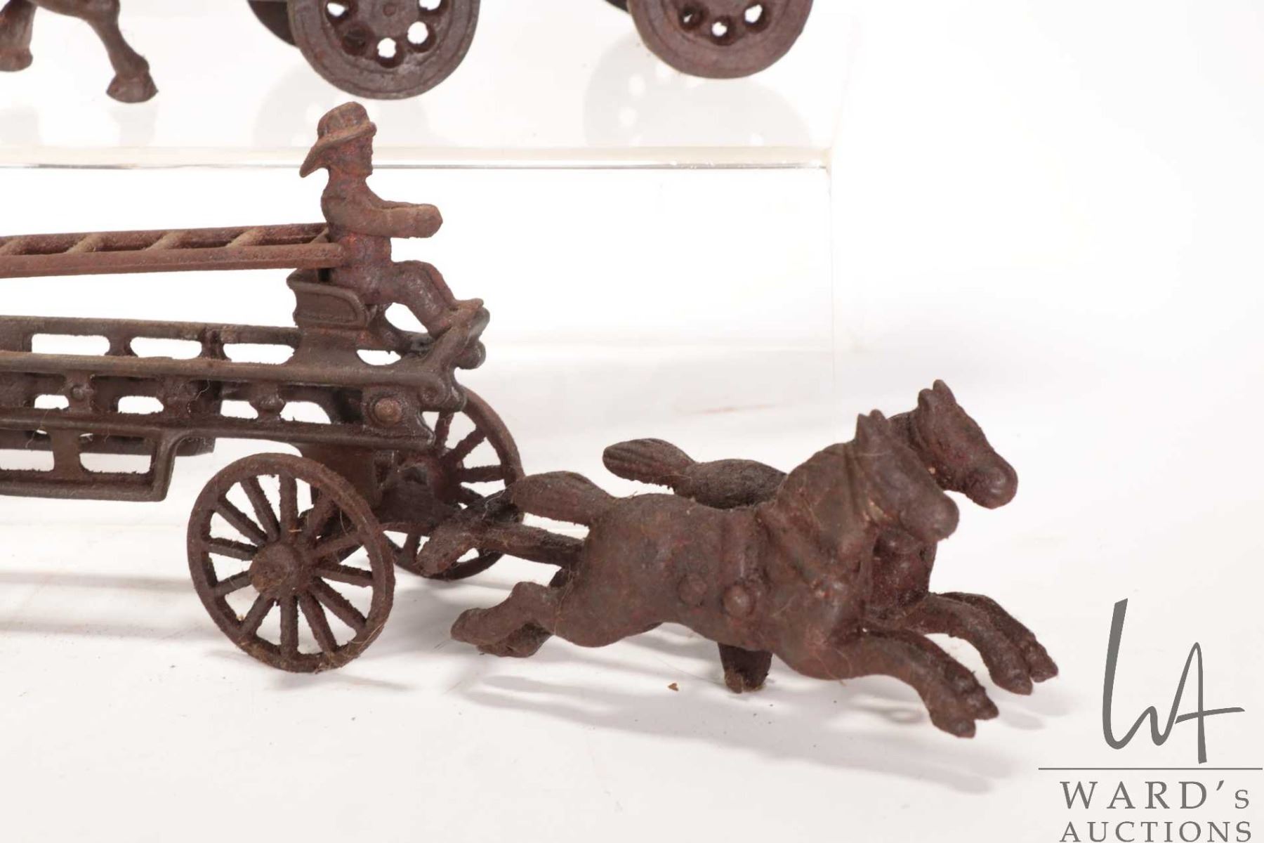 Four vintage cast metal toys including three horse drawn fire engines and one horse drawn US Mail