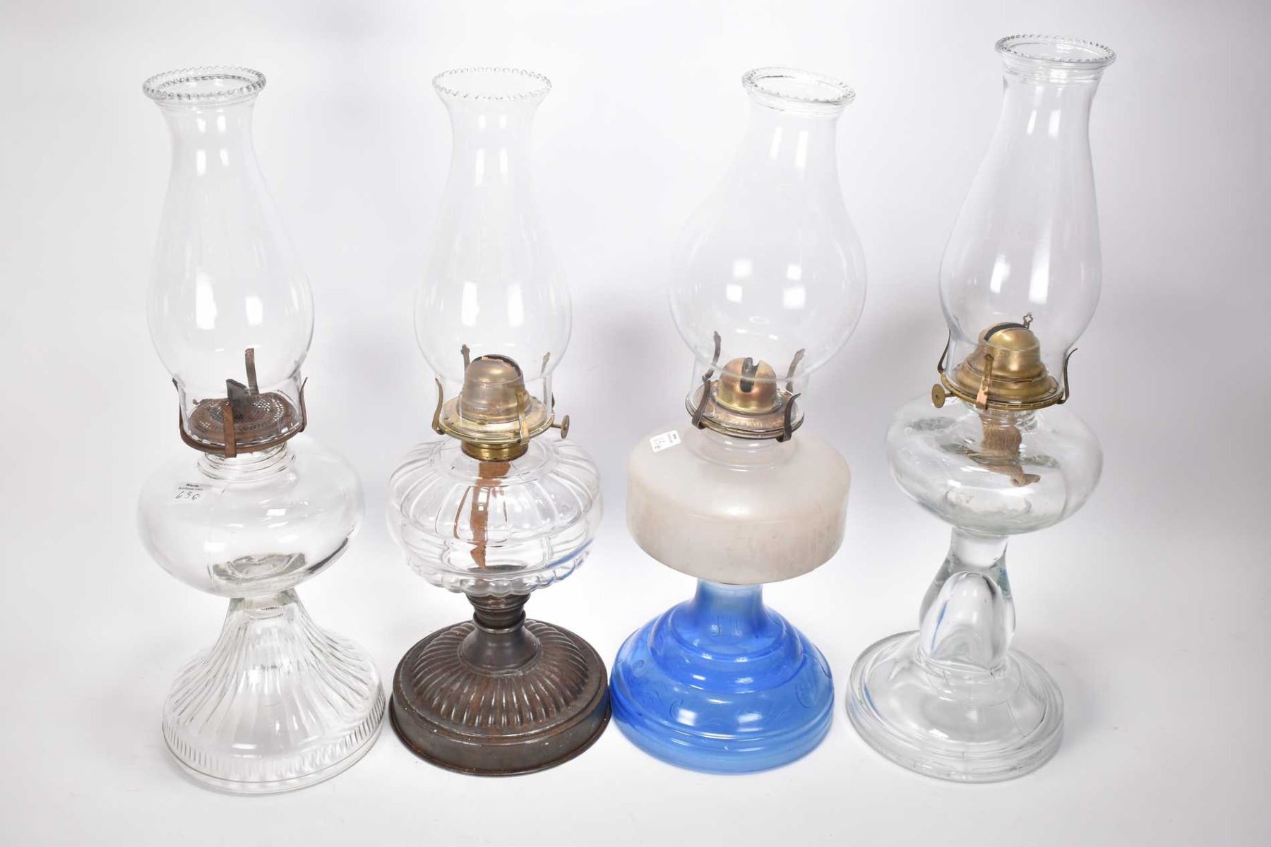 Four vintage oil lamps including three colourless including one with metal base and a milk glass with blue glass base, all with colourless chimneys. Not Available For Shipping. Local Bidders Only