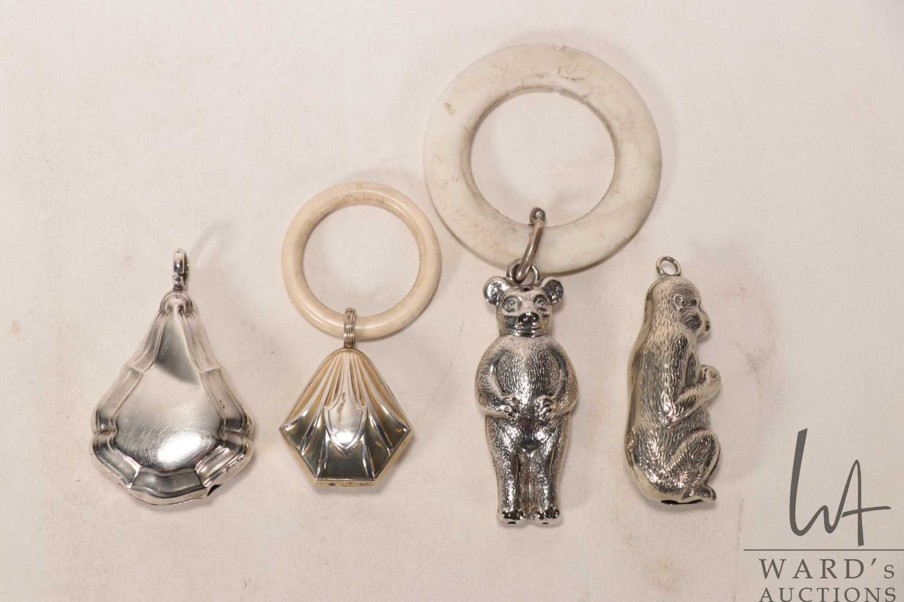 Four vintage silver plate baby rattles including bear and Deco bell plus monkey and larger Deco bell without rings