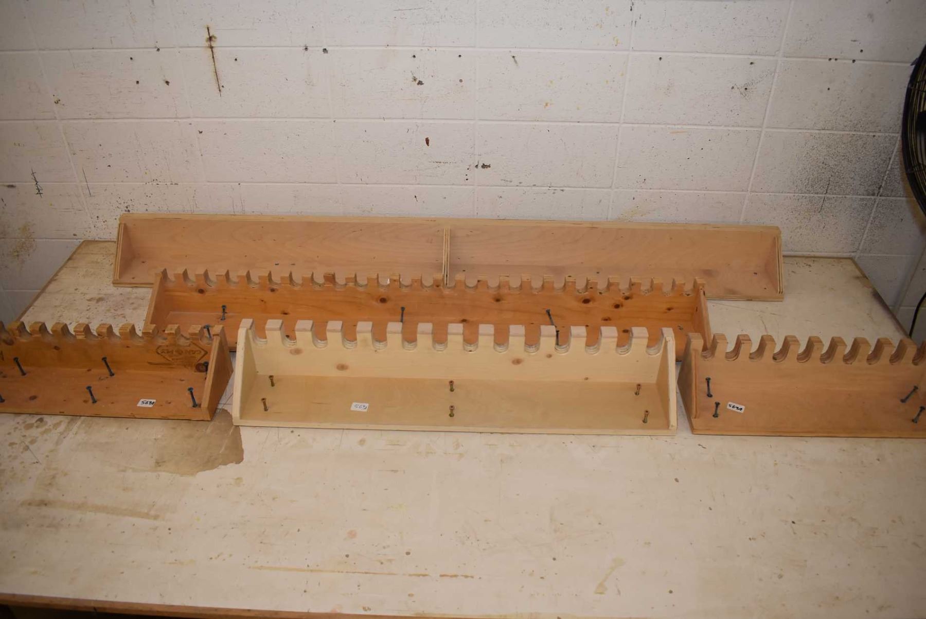 Four wall mount bar clamp hanging racks and a shelf. (Update for March 27th. This item will be stored at the Ward's Auctions until it can be picked up. Go to www.wardsauctions.com for details)