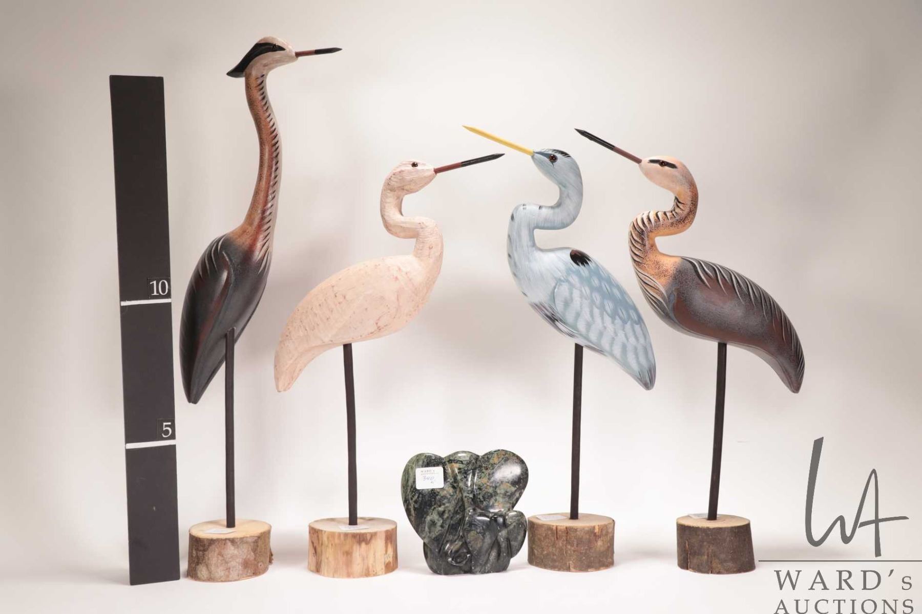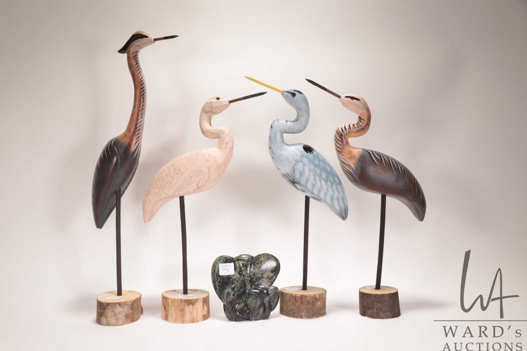 Four wooden carved cranes, ranging from 15"-21" in height plus a carved Zimbabwe stone elephant and