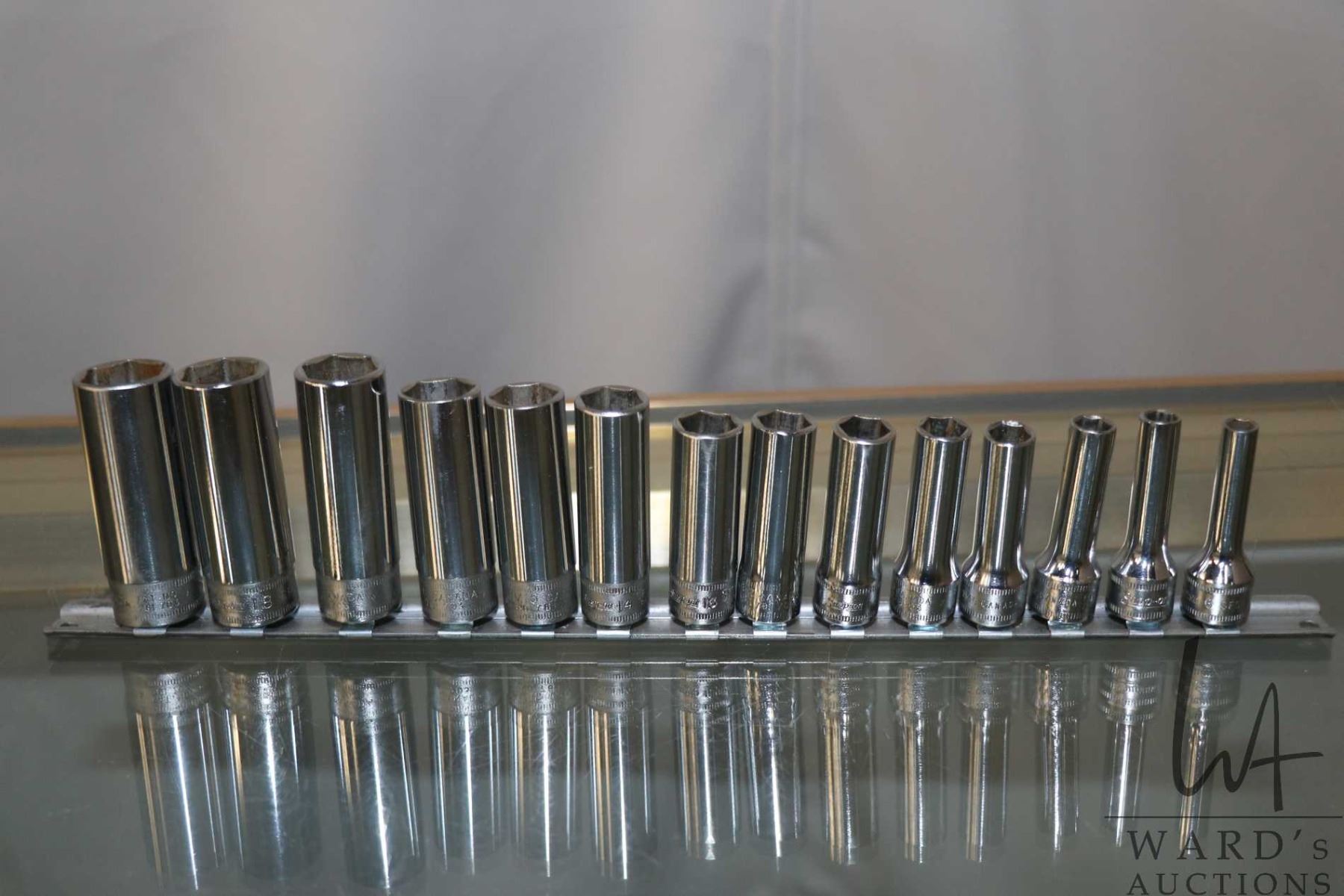 Fourteen piece Snap-On metric 3/8" drive deep sockets 6mm-19mm, on holder