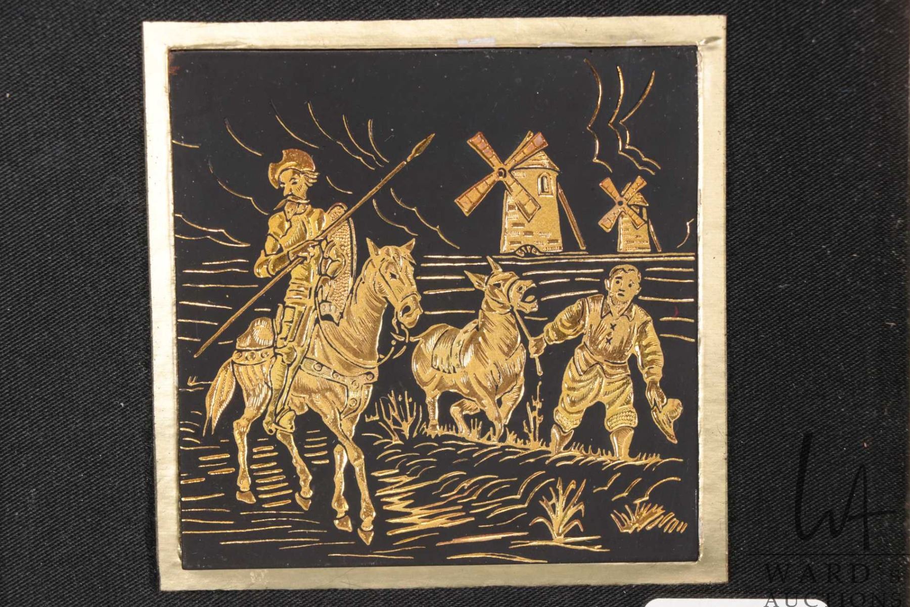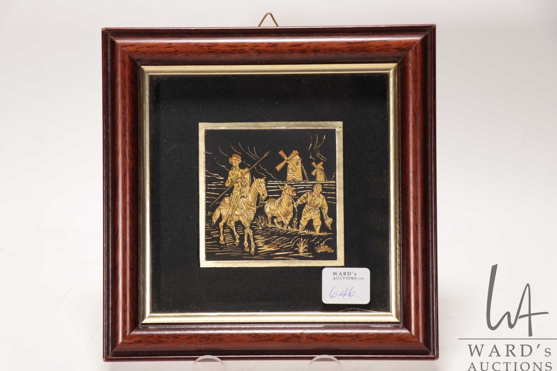 Framed 10kt gold plated Don Quixote plate, overall dimensions 7" X 7"