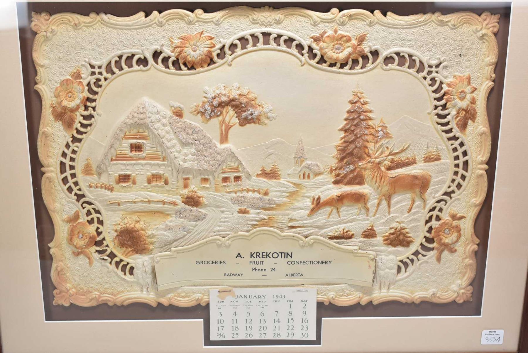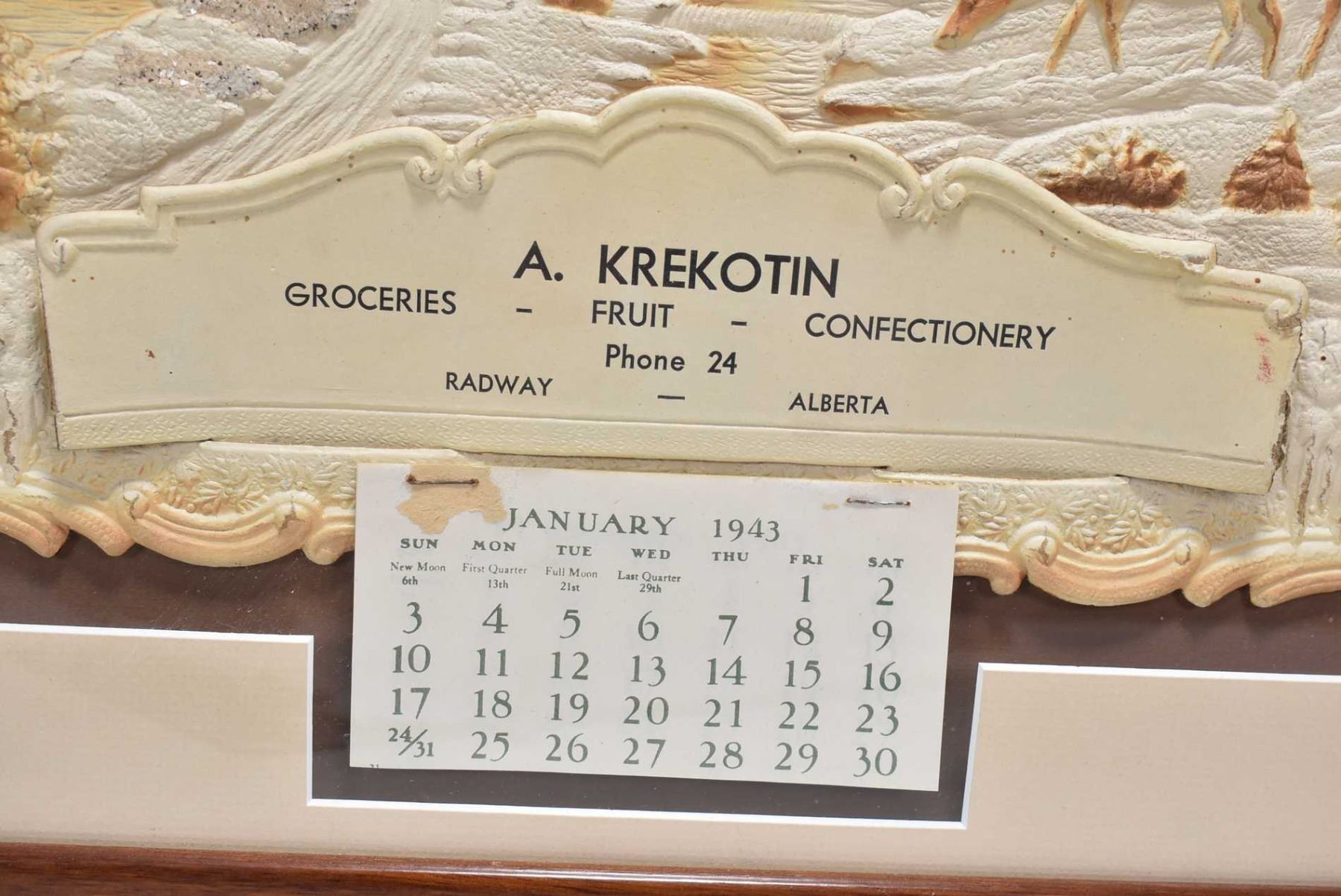 Framed 1943 calendar with pierced and embossed wildlife and cottage scene to advertise A.Krekotin Confectionary, Radway, AB.-note two digit phone number