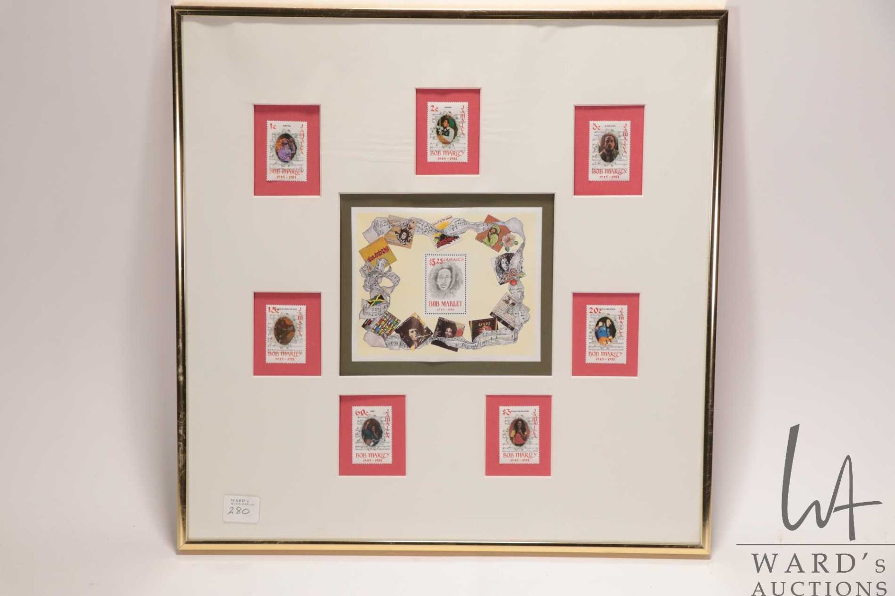 Framed Bob Marley stamp collection, overall dimensions including frame 15" X 15"