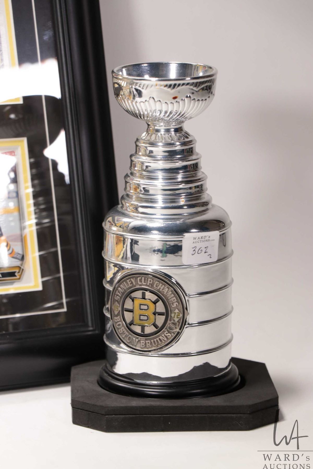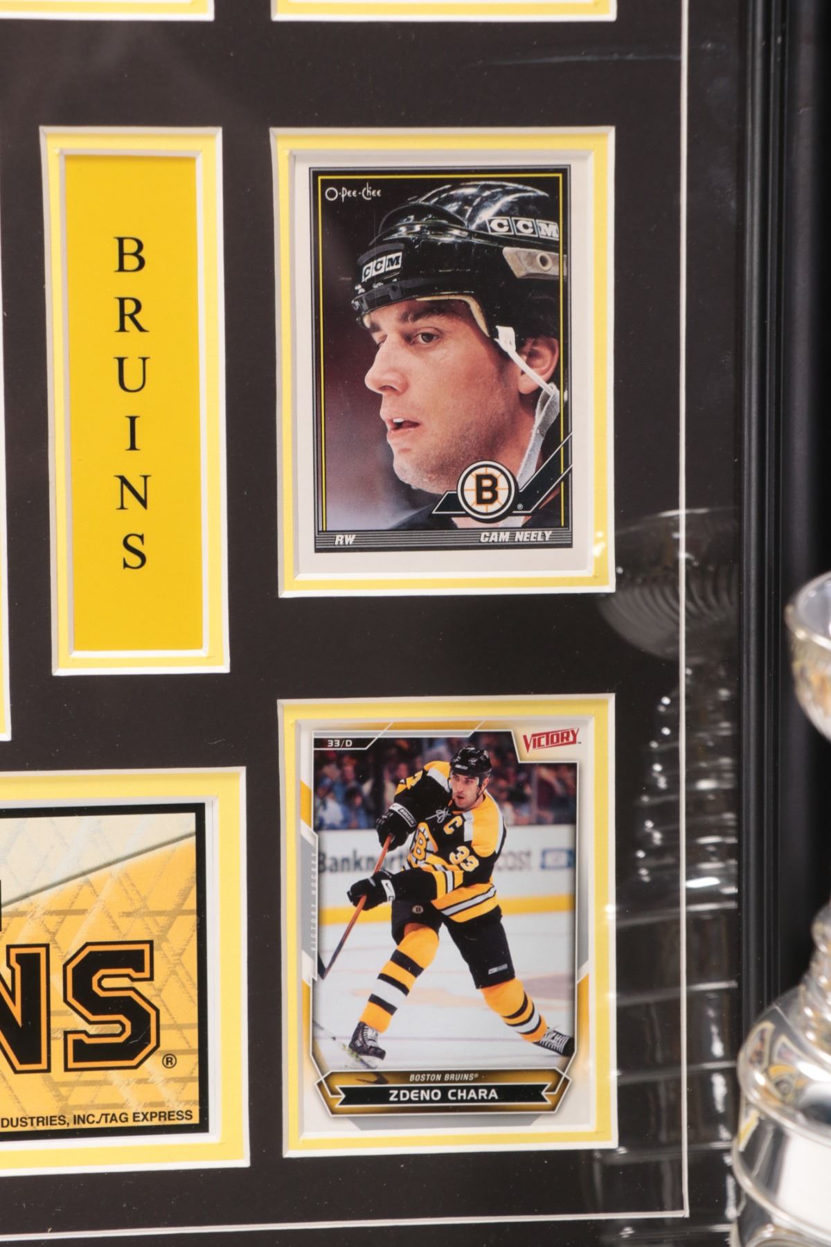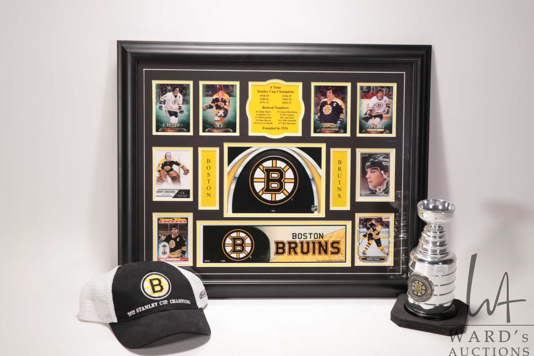 Framed Boston Bruins hockey card collage, overall dimensions including frame 19" X 23" and a Boston Bruins 1972, 8" Stanley Cup. Note: Artwork and framed pieces cannot be insured and many are too large to ship. Local pickup