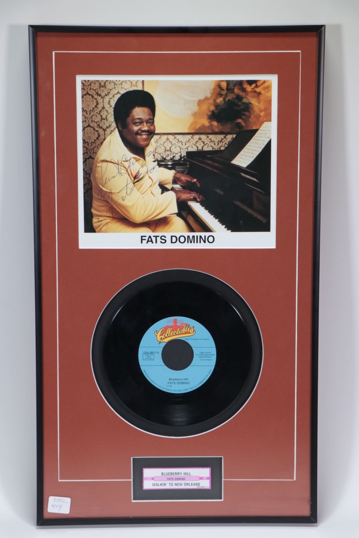 Framed Fat's Domino "Blueberry Hill" 45 rpm record, appears to be hand signed with COA
