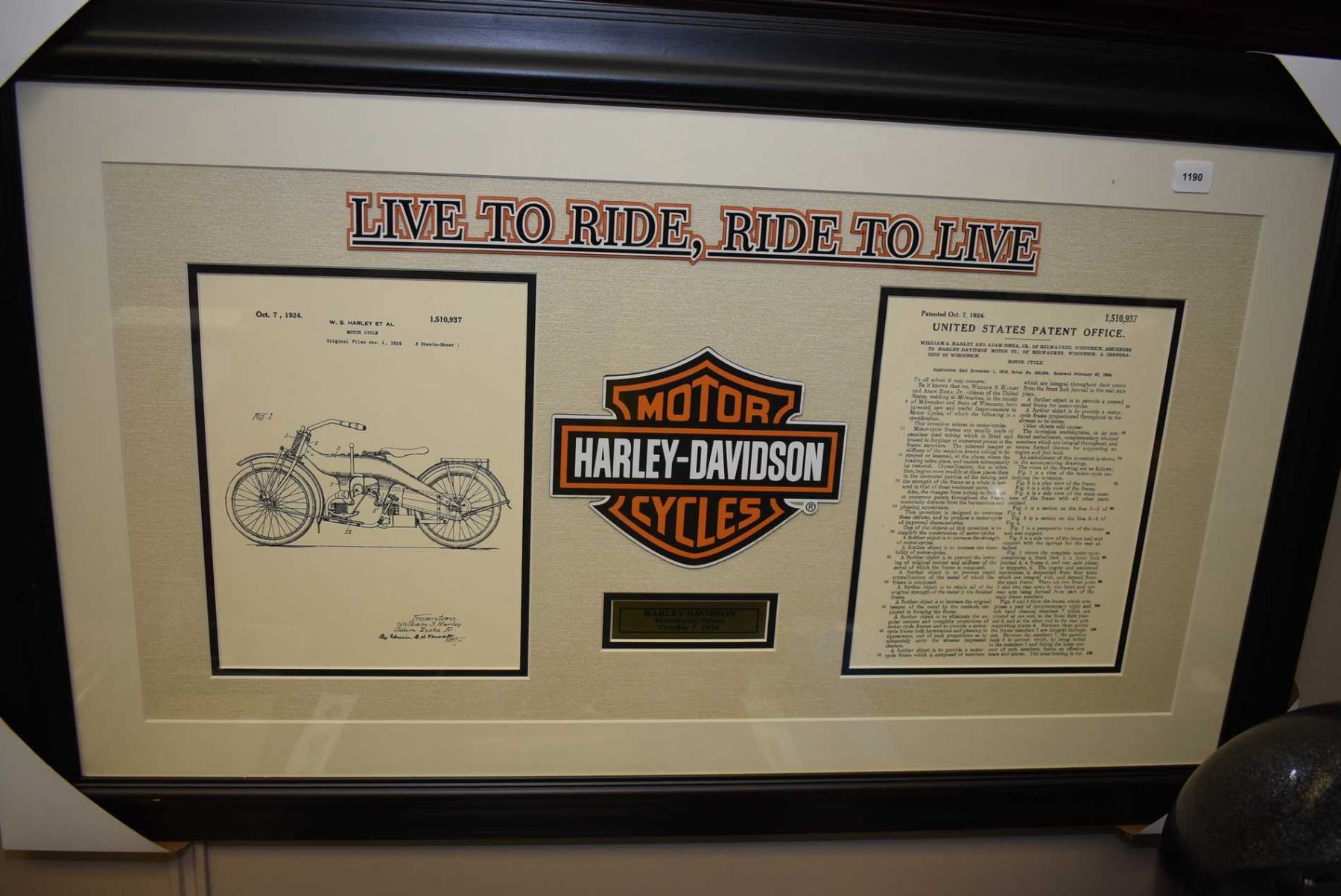 Framed Harley Davidson collage with copies of patent drawing and notes from October 7, 1924