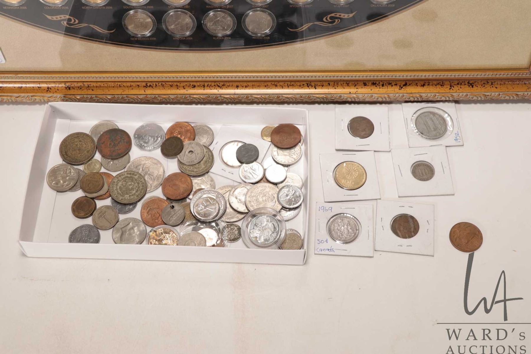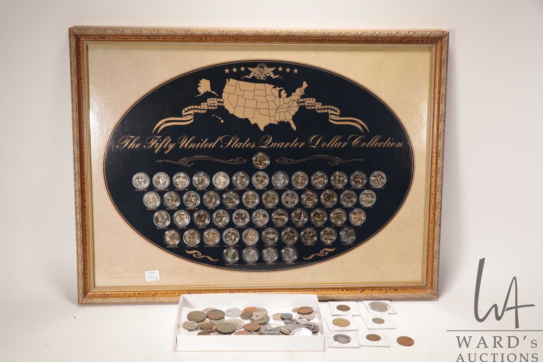 Framed The Fifty United States Quarter Dollar Collection plus a selection of Canadian, American and other foreign coins