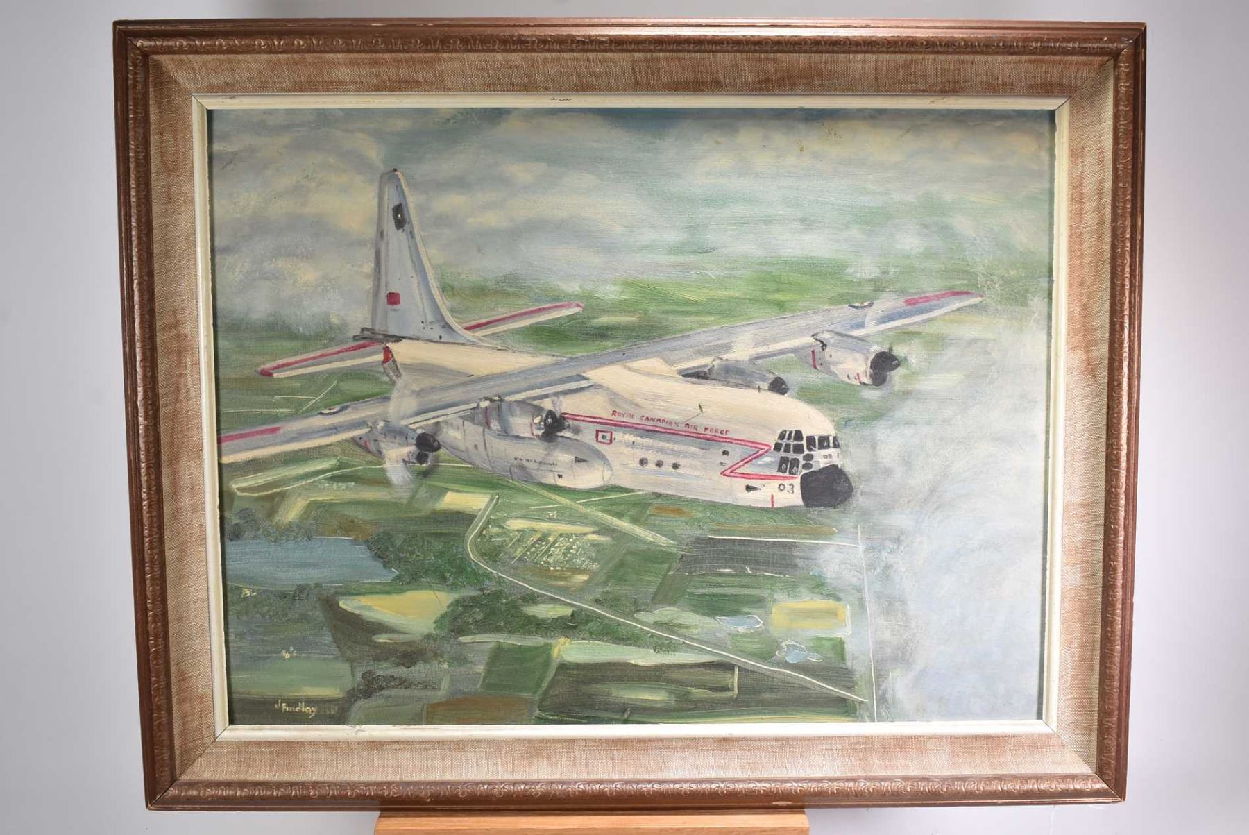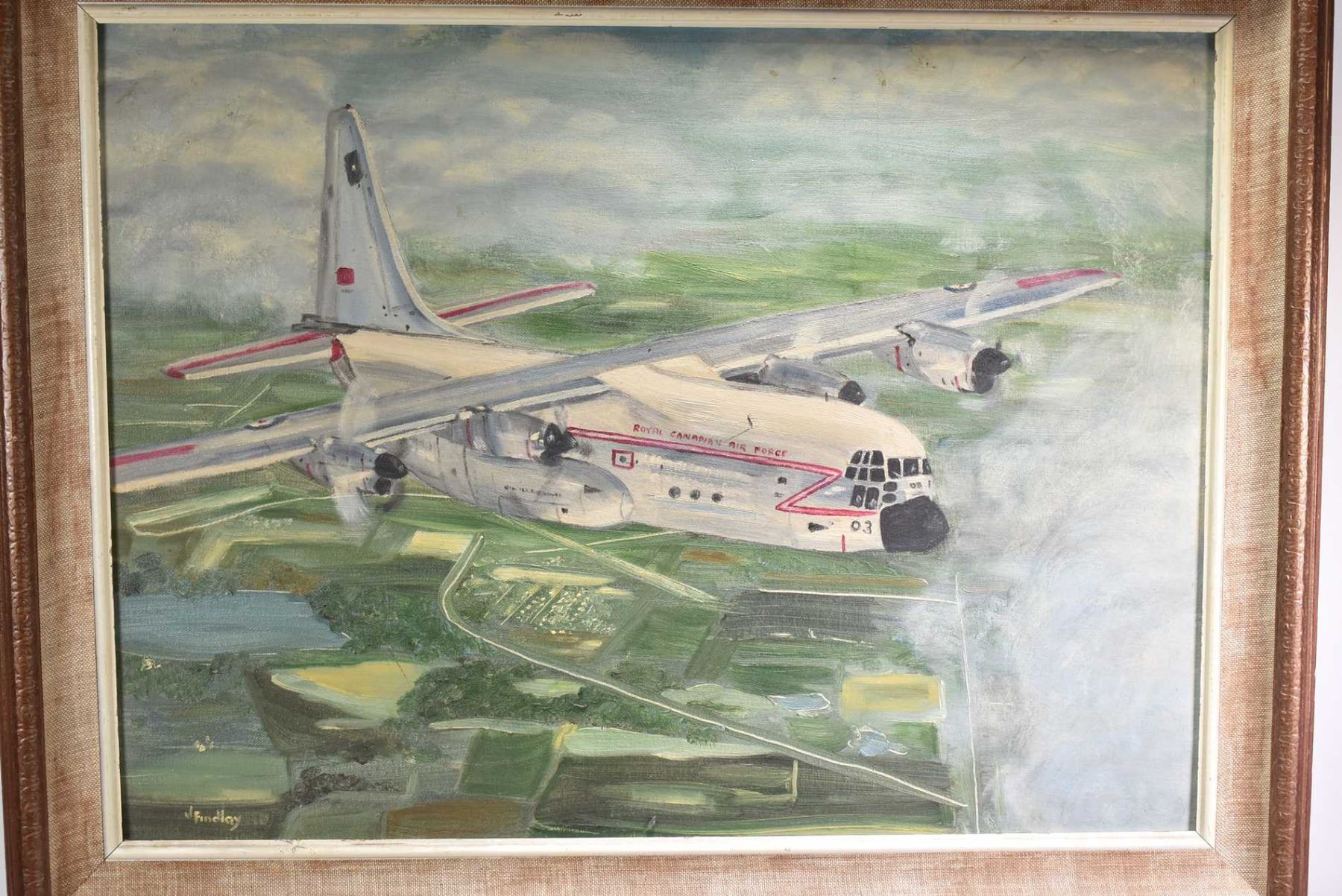Framed acrylic on board painting of a Royal Canadian Air force airplane in flight by artist J. Findlay, 18" X 24"