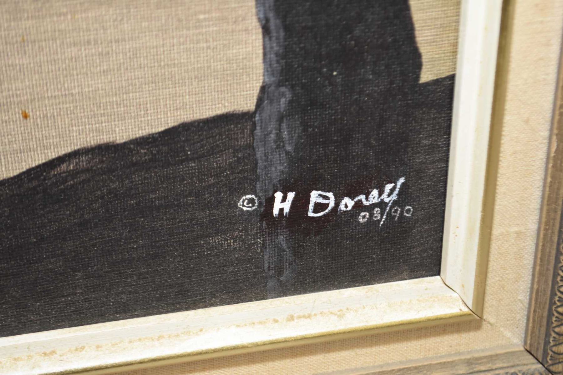 Framed acrylic on board painting of a castle in the mist signed by artist Heather Dorey, 24" X 30"