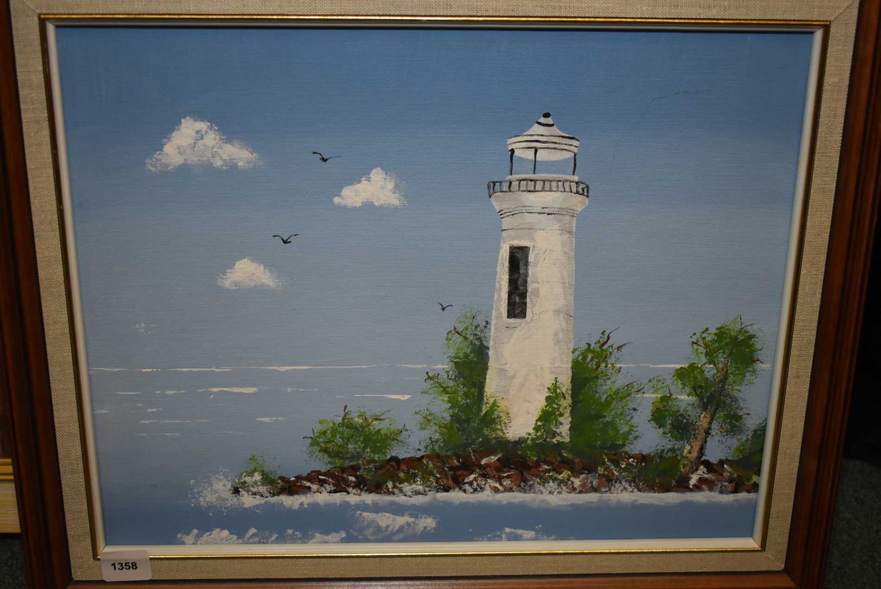 Framed acrylic on board painting of a lighthouse artist name on verso Stall, 11" X 14"