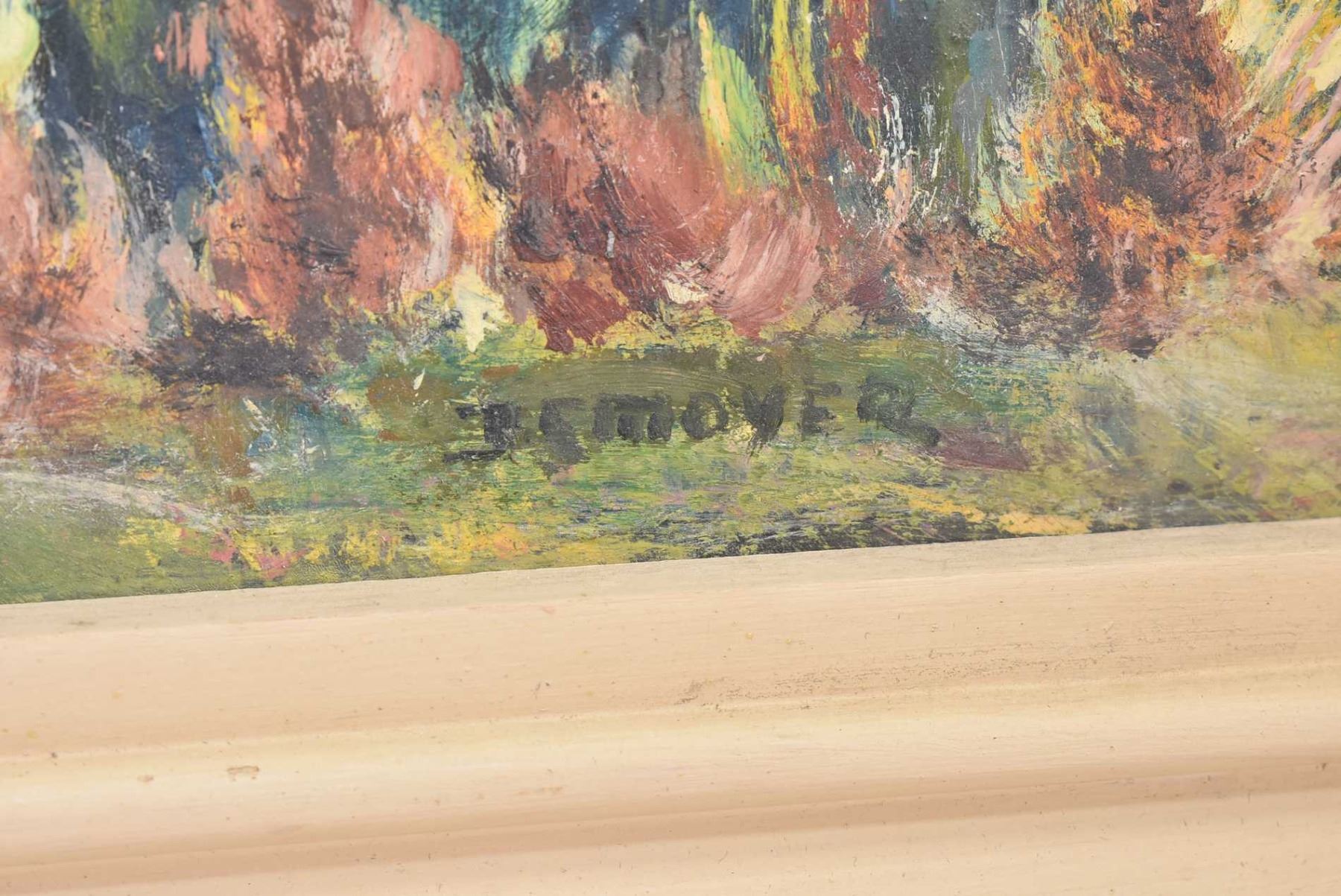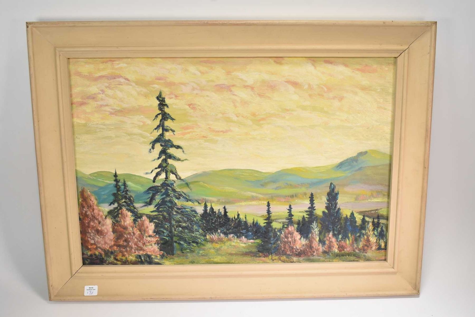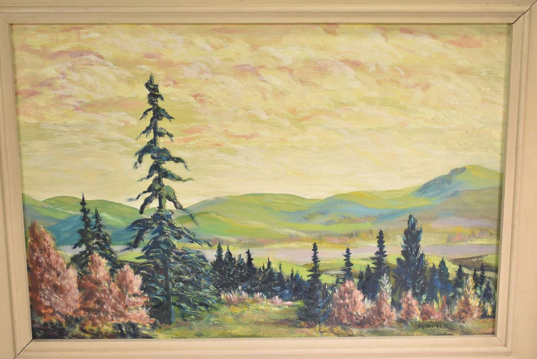 Framed acrylic on board painting of a mountain landscape signed by artist S.G. Moyer 15 1/2" X 23"