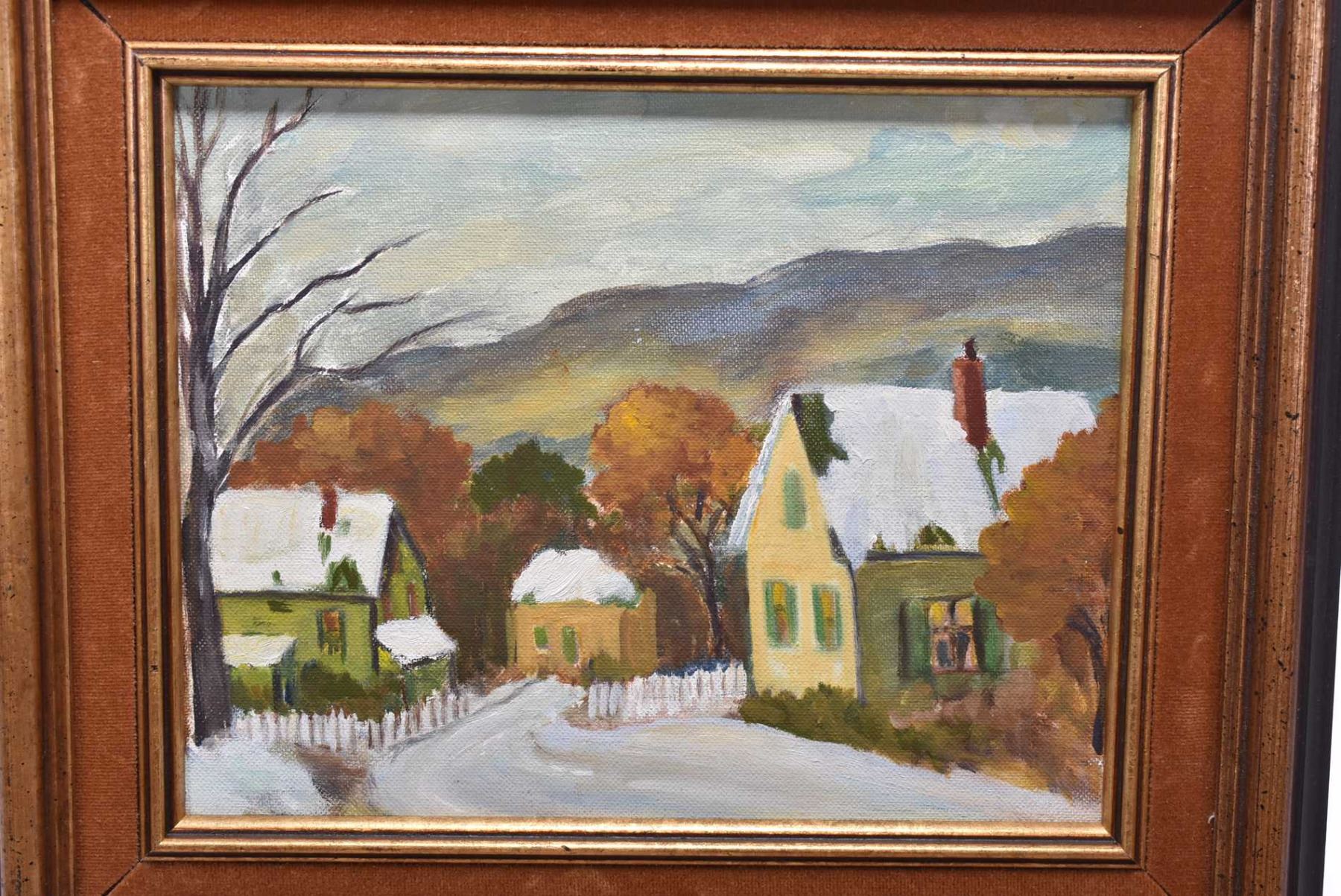 Framed acrylic on board painting of a mountainous rural setting, unsigned, 8" X 10"