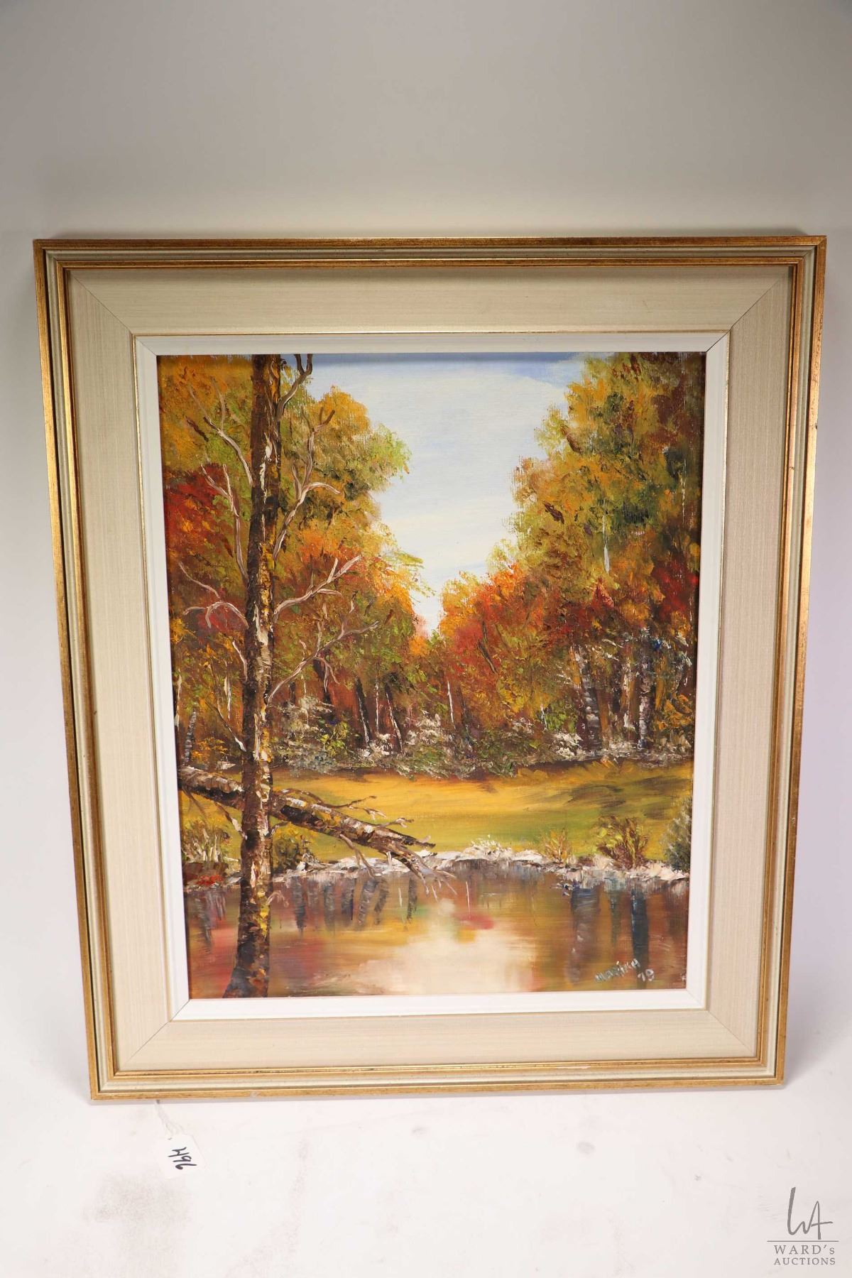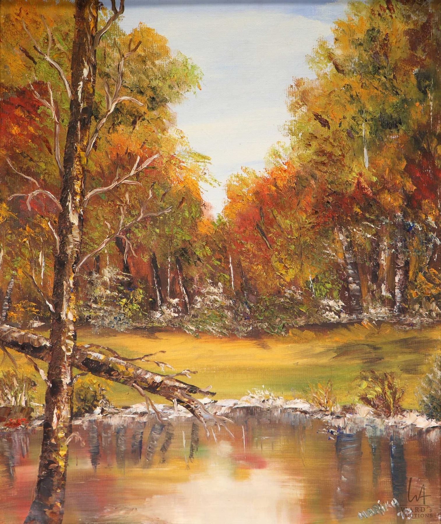 Framed acrylic on board painting titled on verso "Lake Autumn 1979" and signed by artist Dr. M. ( Marika) Yakymecrko, 20" X 16"