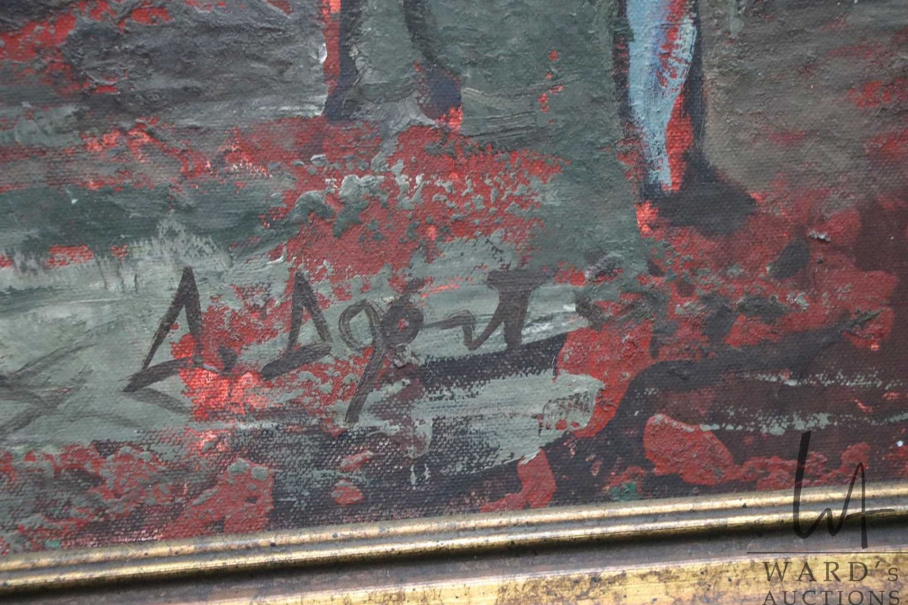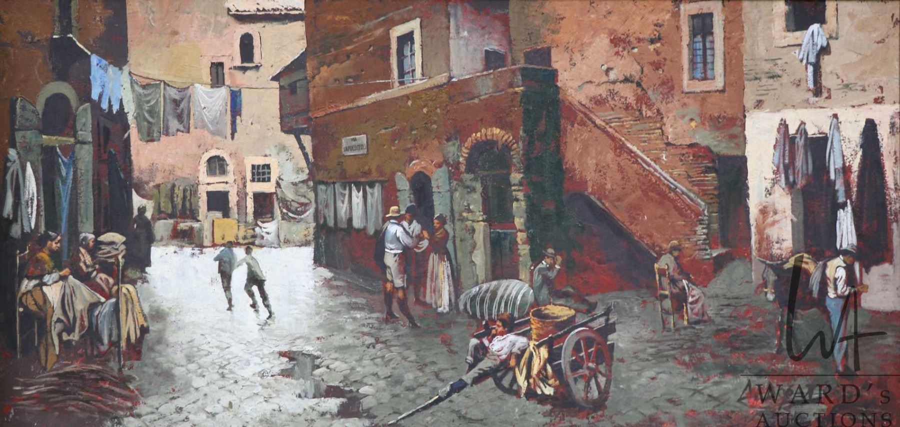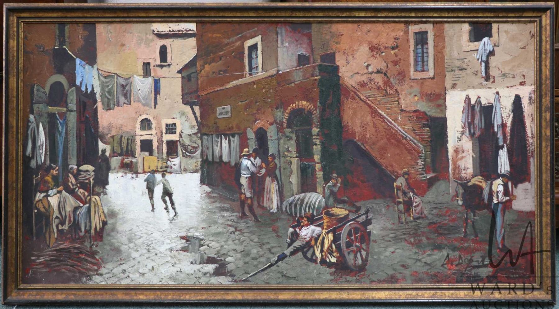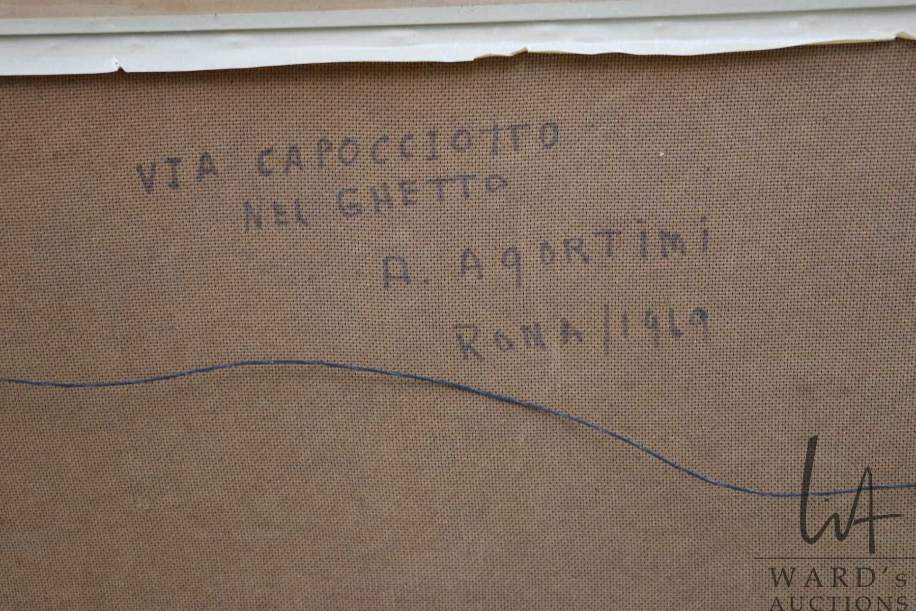 Framed acrylic on board painting, titled on verso "Via Capocciotto Nel Ghetto" by artist A. Agortini, Roma, 1919, 23" X 46". Note: Artwork cannot be insured and is often too large to ship. Local pickup.