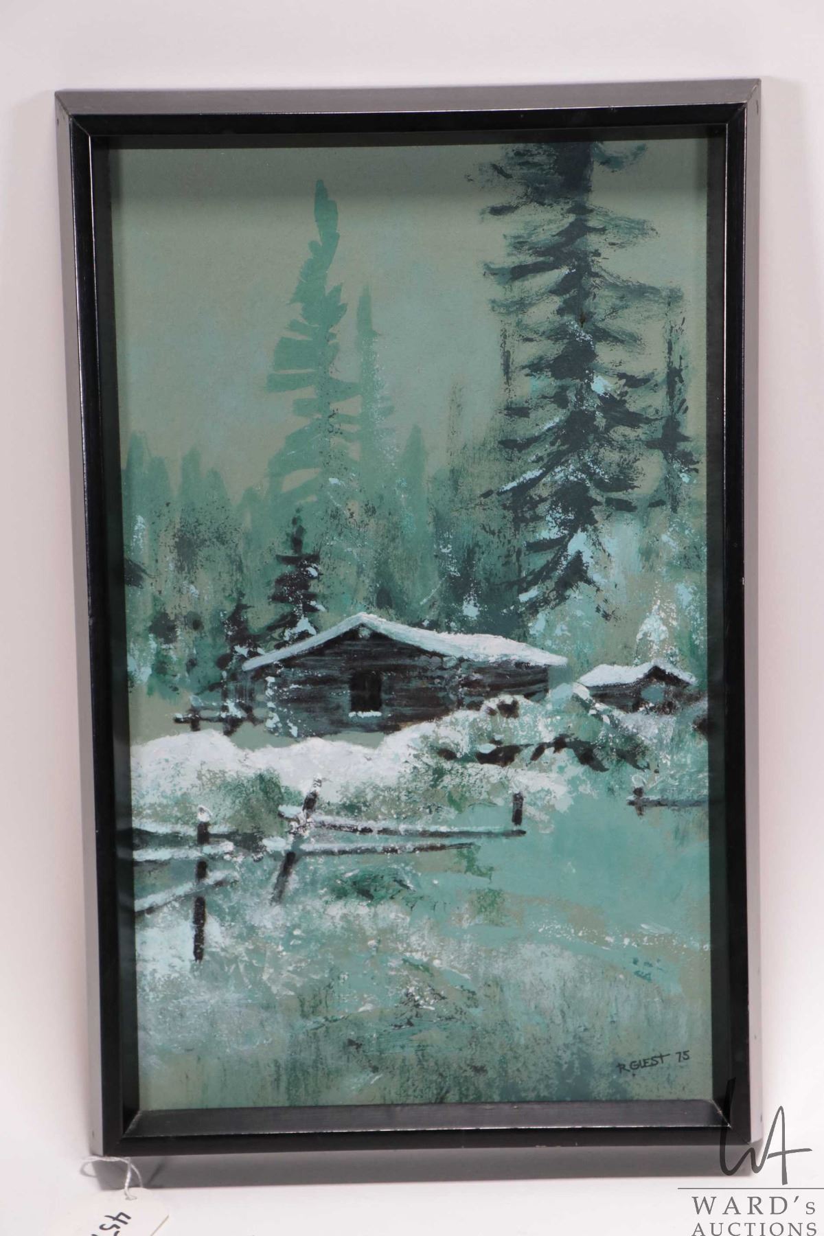 Framed acrylic on board, titled on verso "Grande Prairie- Old Cabin Study" by artist R. Guest A.S.A. Dece/75, 12 1/2" X 7 1/2"