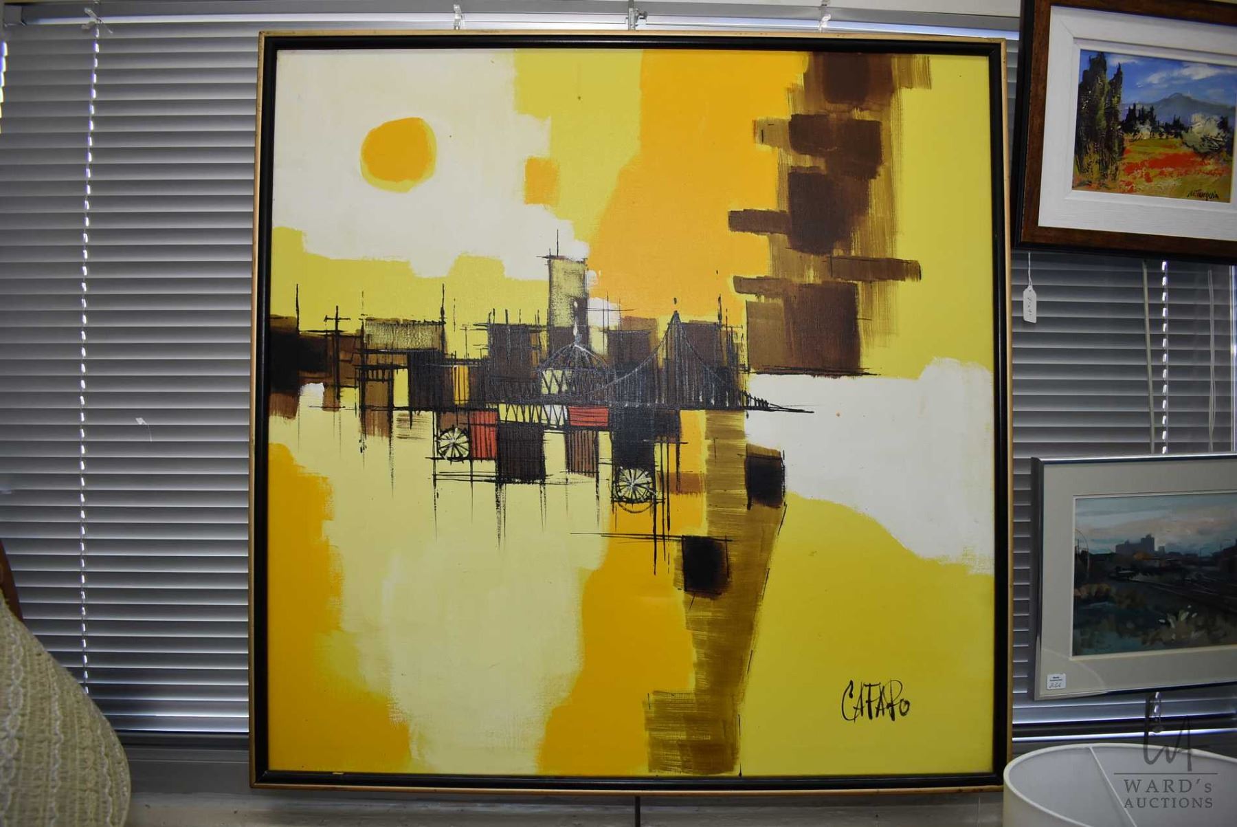 Framed acrylic on canvas abstract painting of a bridge in a cityscape, signed by artist Cafapo (?), 36" X 36". Note: No Shipping. Local Pickup Only