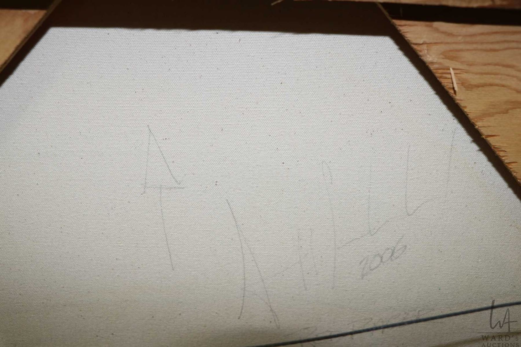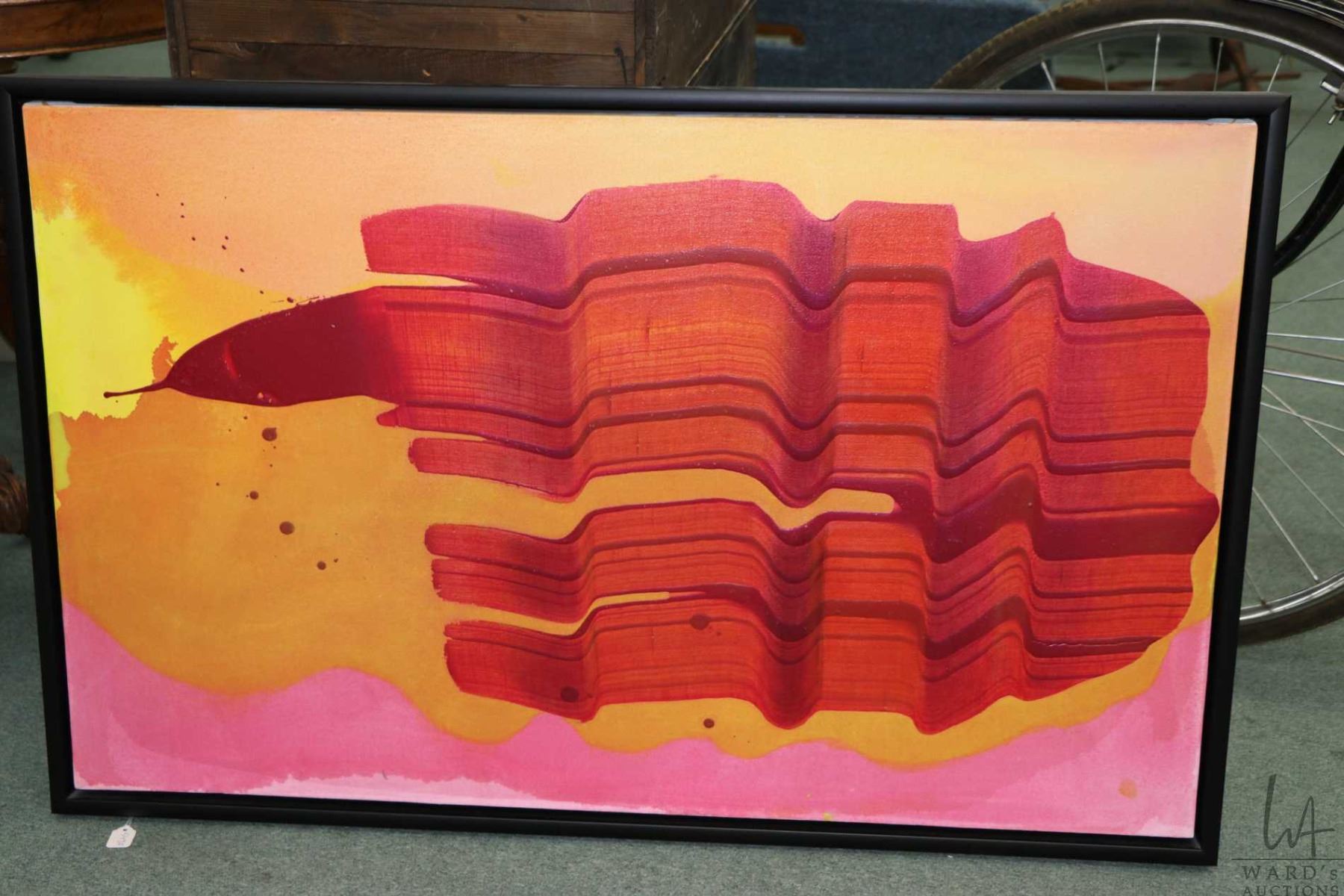 Framed acrylic on canvas abstract painting titled on verso "Red Racer" and signed by artist Ahfilli (?) 25" X 49"