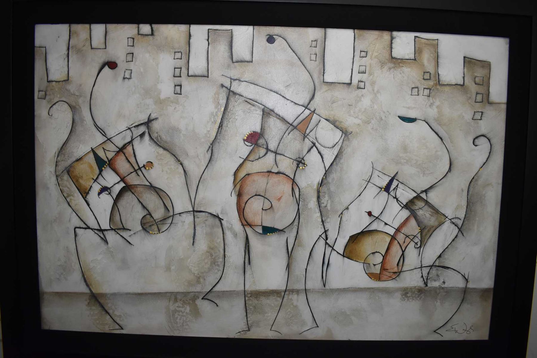 Framed acrylic on canvas painting On the Scene by artist Eric Waugh on front and verso, 40" X 60" NOTE: Shipping not available. Local bidders only.