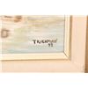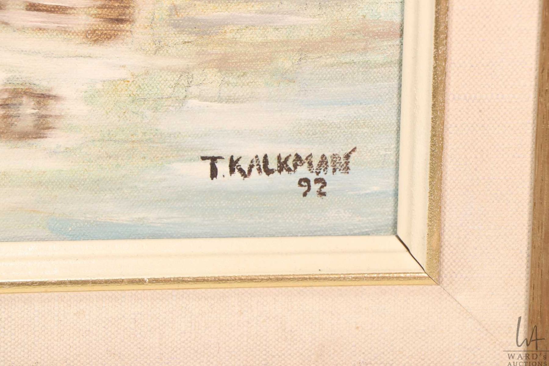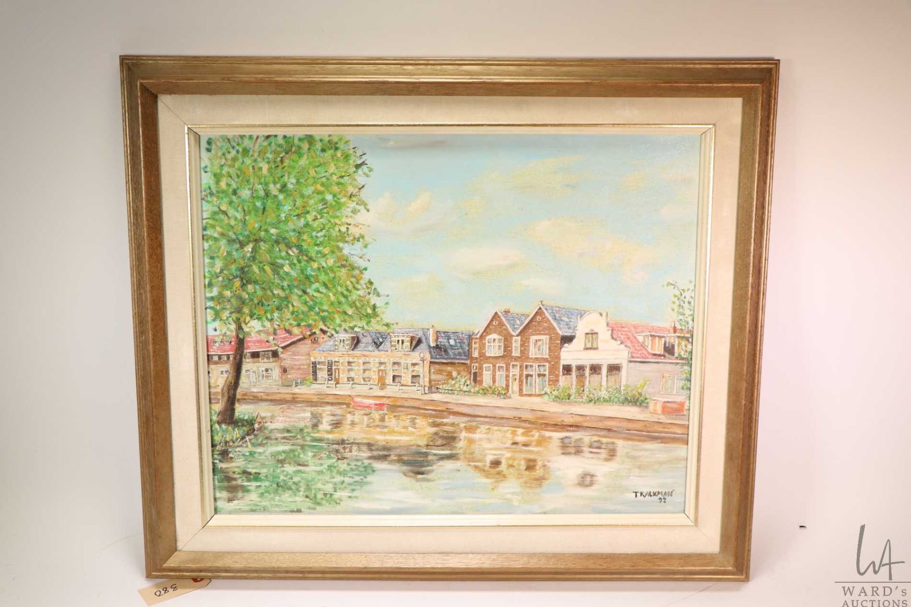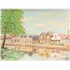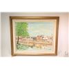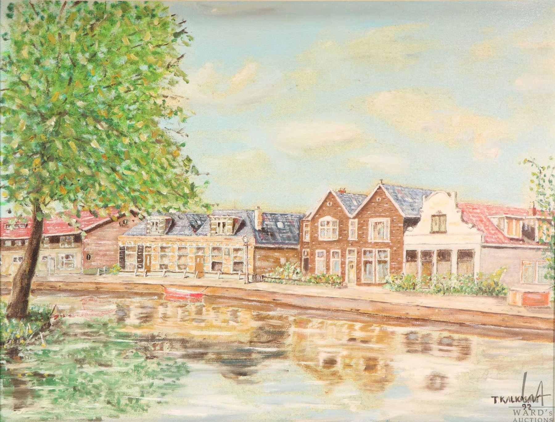 Framed acrylic on canvas painting of Dutch houses and canal by artist T. Kalkman 15 3/4" X 19 1/2"