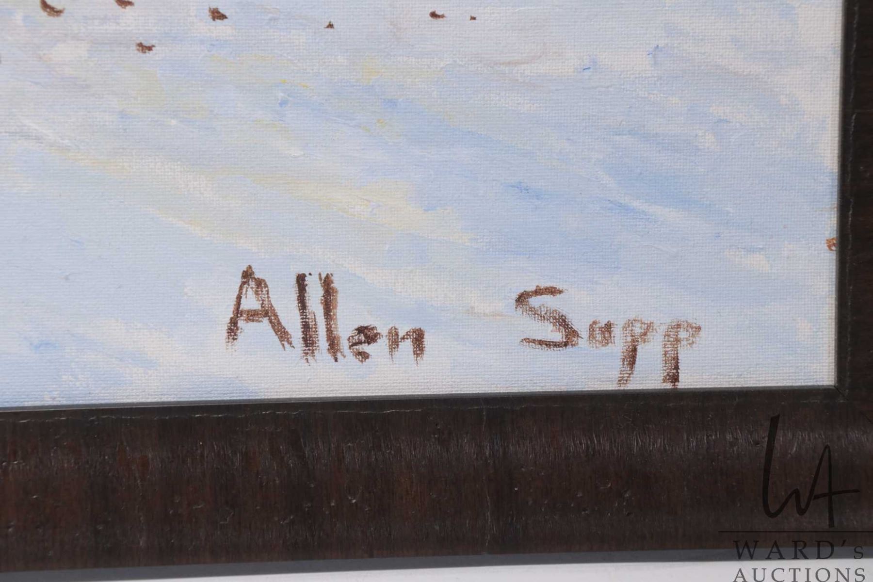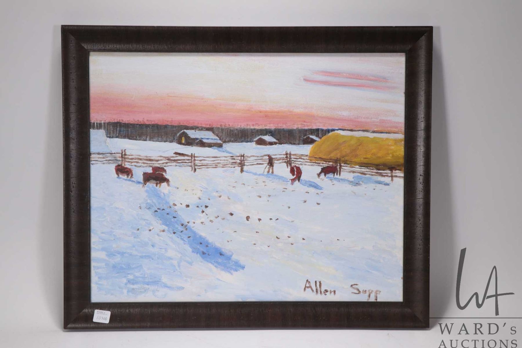 Framed acrylic on canvas painting of a feeding cows in a winter setting, signed by artist Allen Sapp, 16" X 20"
