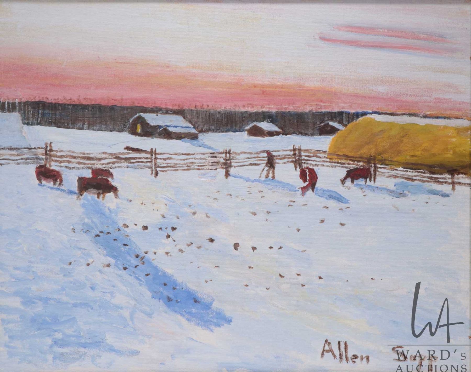 Framed acrylic on canvas painting of a feeding cows in a winter setting, signed by artist Allen Sapp