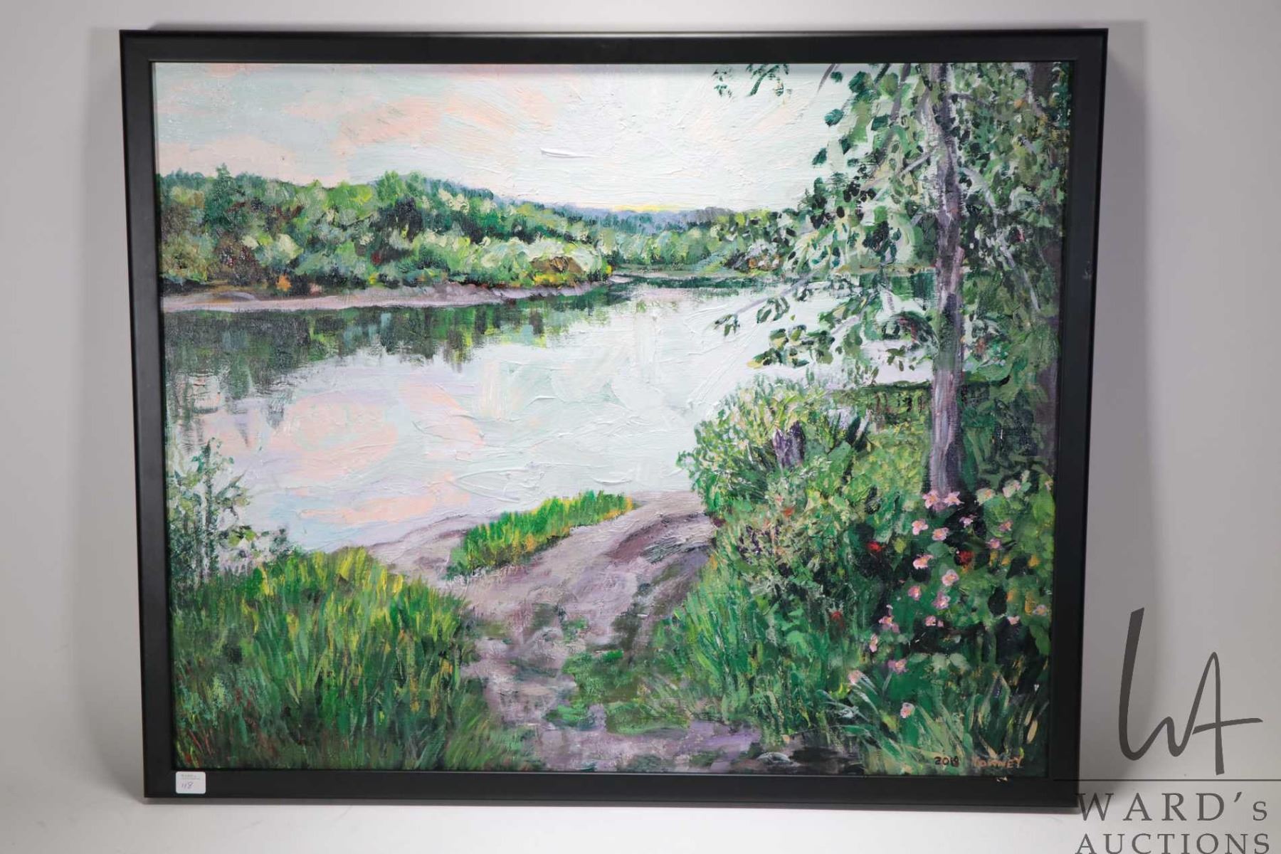 Framed acrylic on canvas painting titled on verso "Clear Water River" and signed by artist Yowney 2018, 24" X 30"